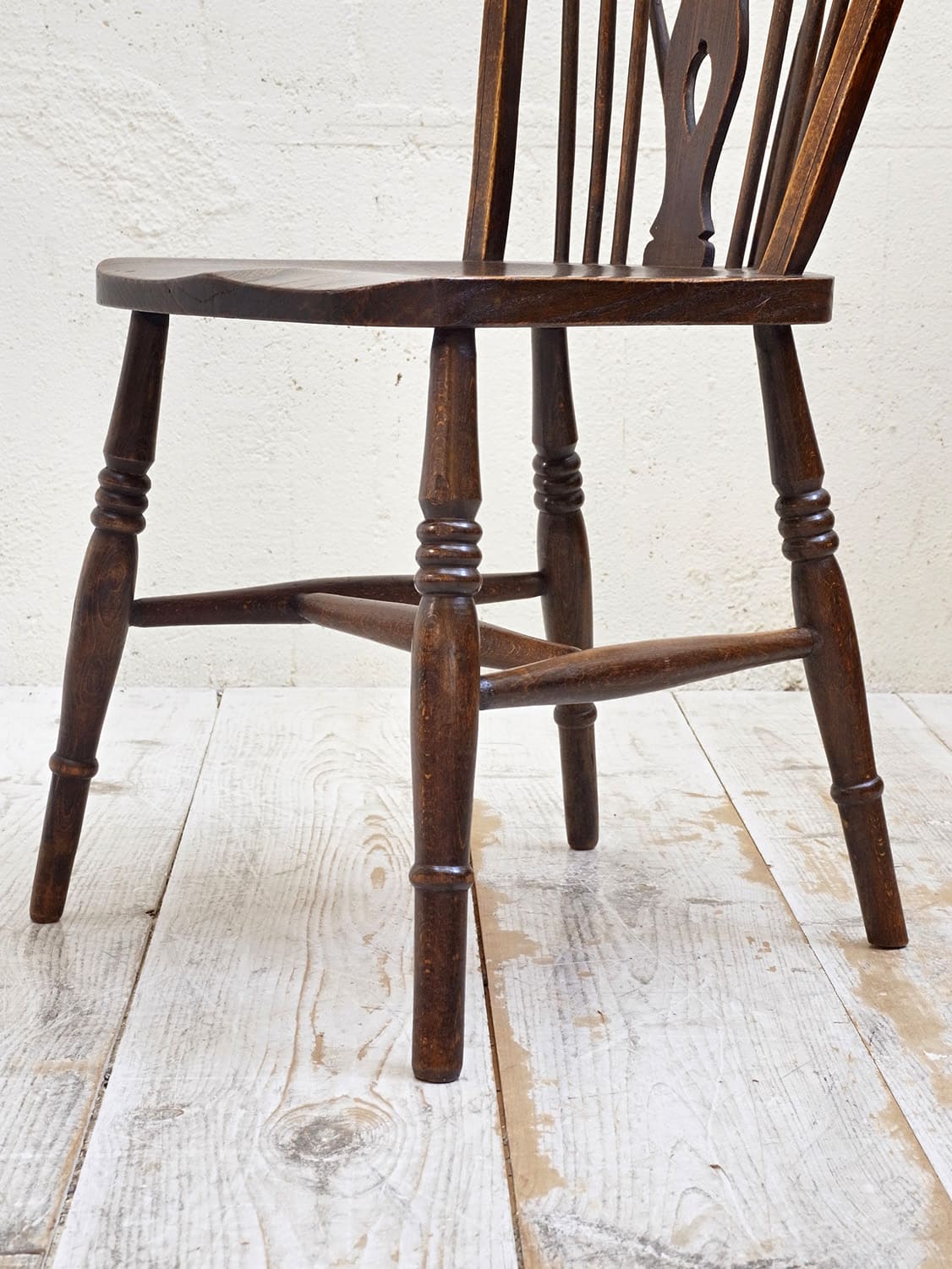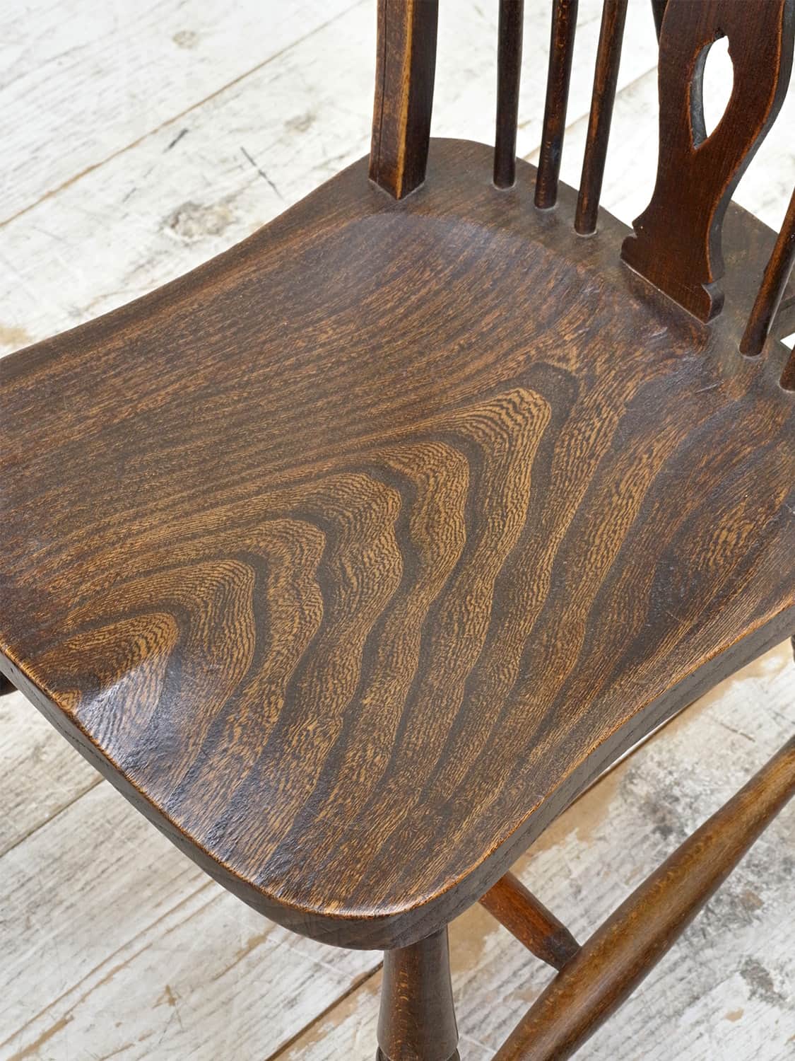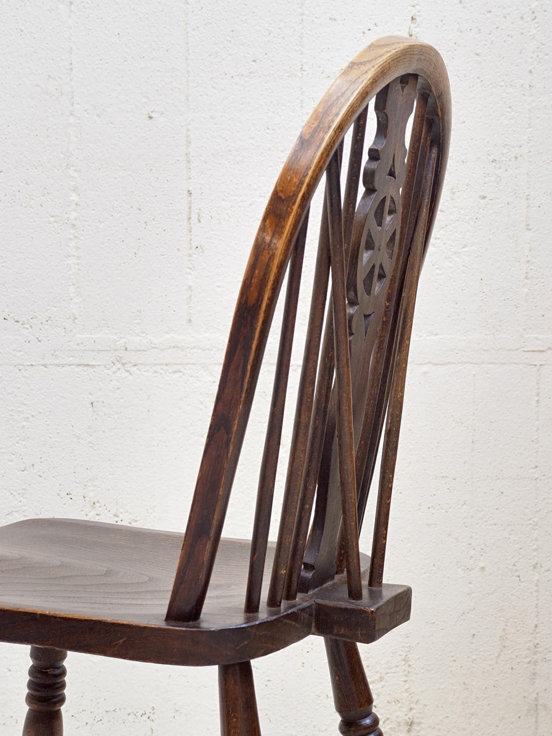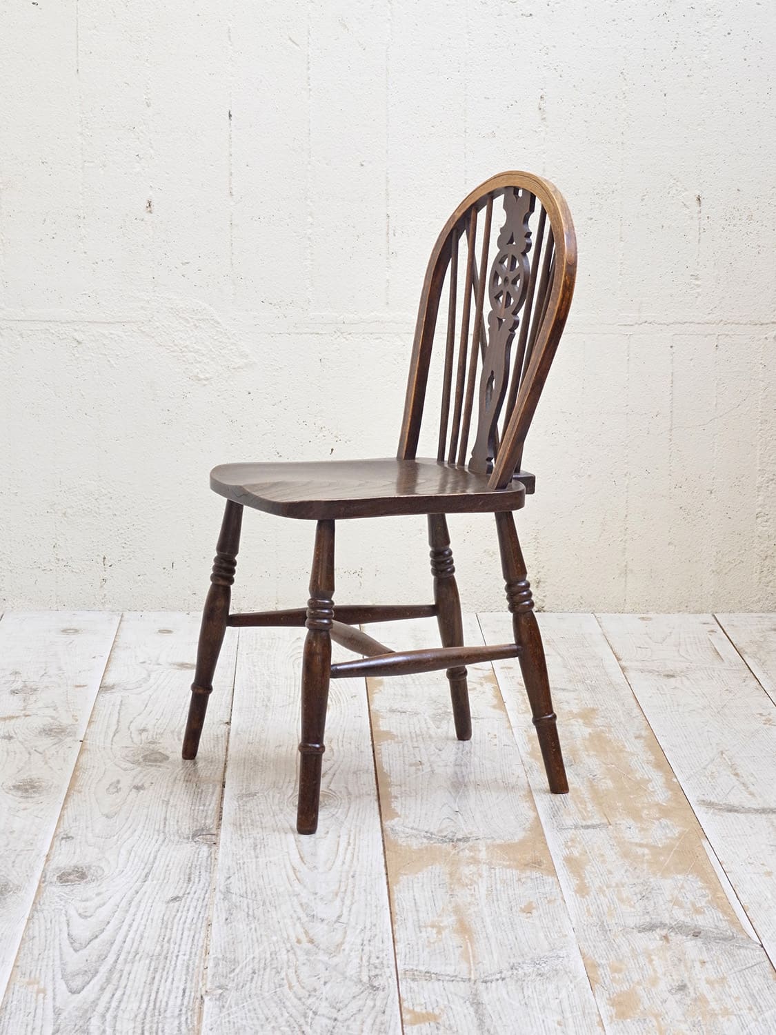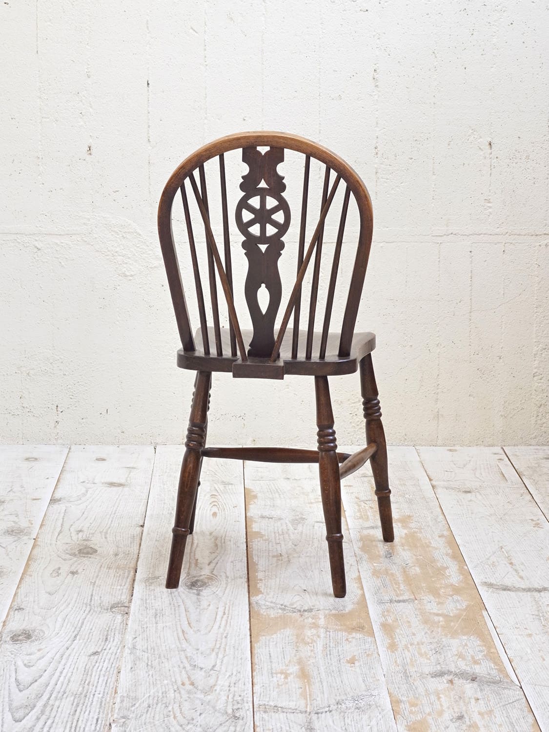 推定1930年代、イギリス製のホイールバックチェアです。ホイールバックチェアとは、背もたれにホイール(車輪)がデザインされた椅子でイギリスではポピュラーなスタイルです。少しづつディティールが違うためそれぞれに表情があり、愛着の湧く1脚をみつける楽しみもあります。こちらの椅子は全体的に作りが良く、座刳りもしっかりあり、座面の表情も素敵です。座面までの高さは45cmです。その他ホイールバックチェアはこちらから。