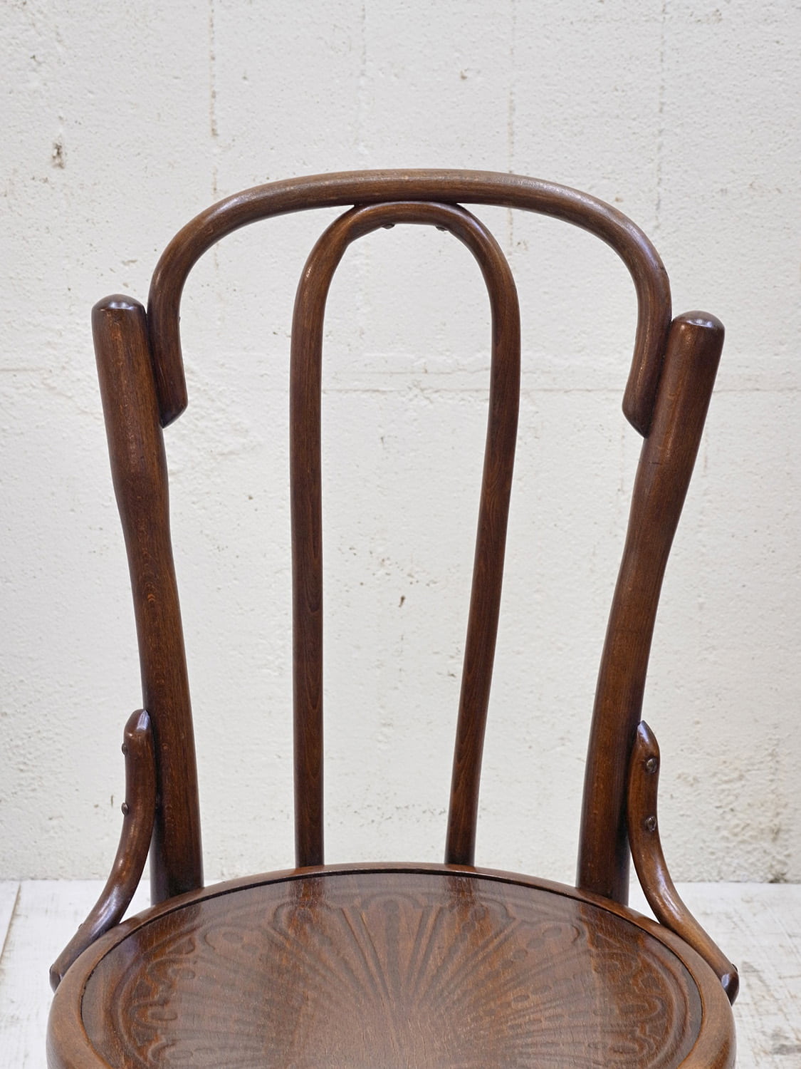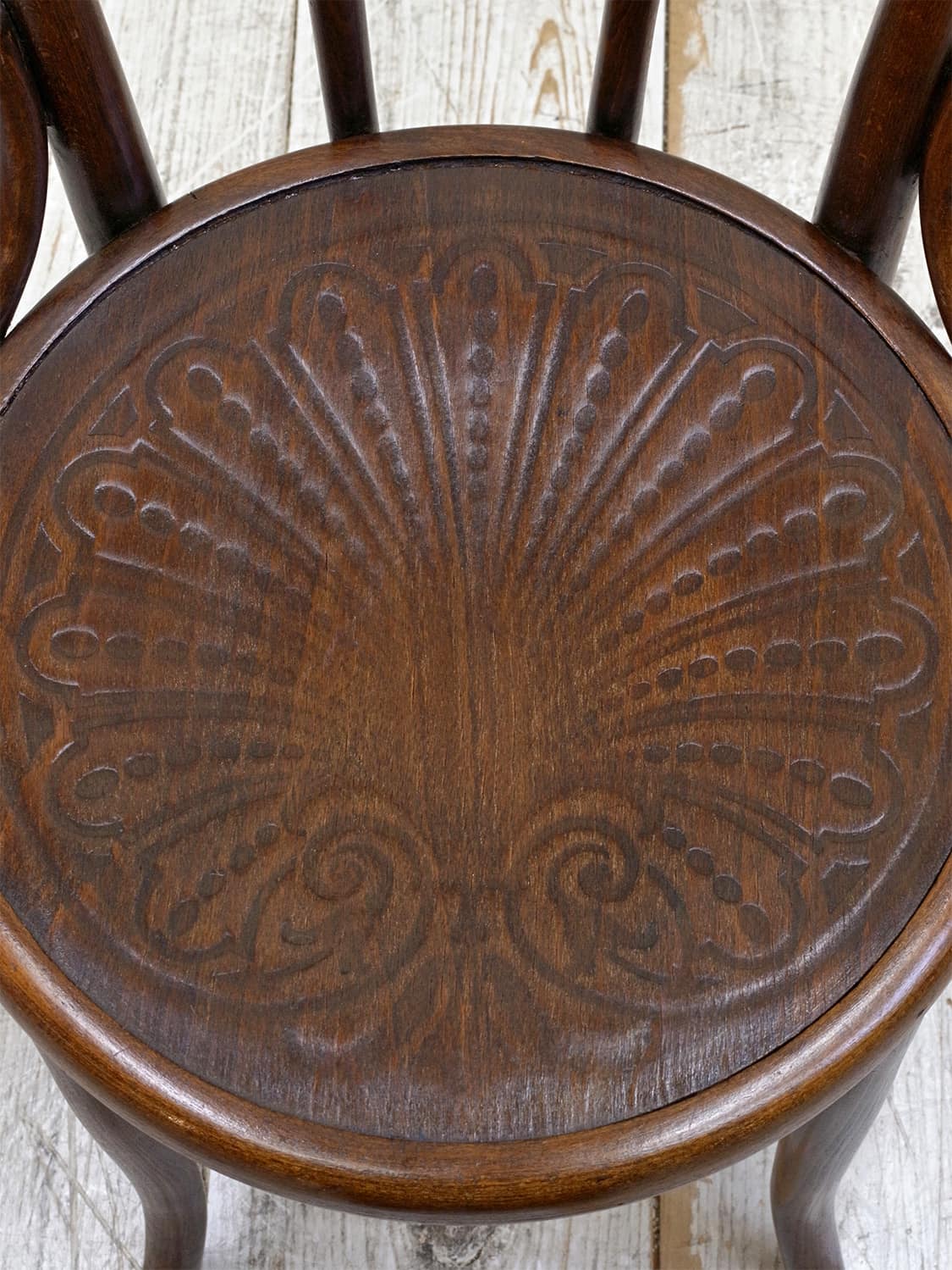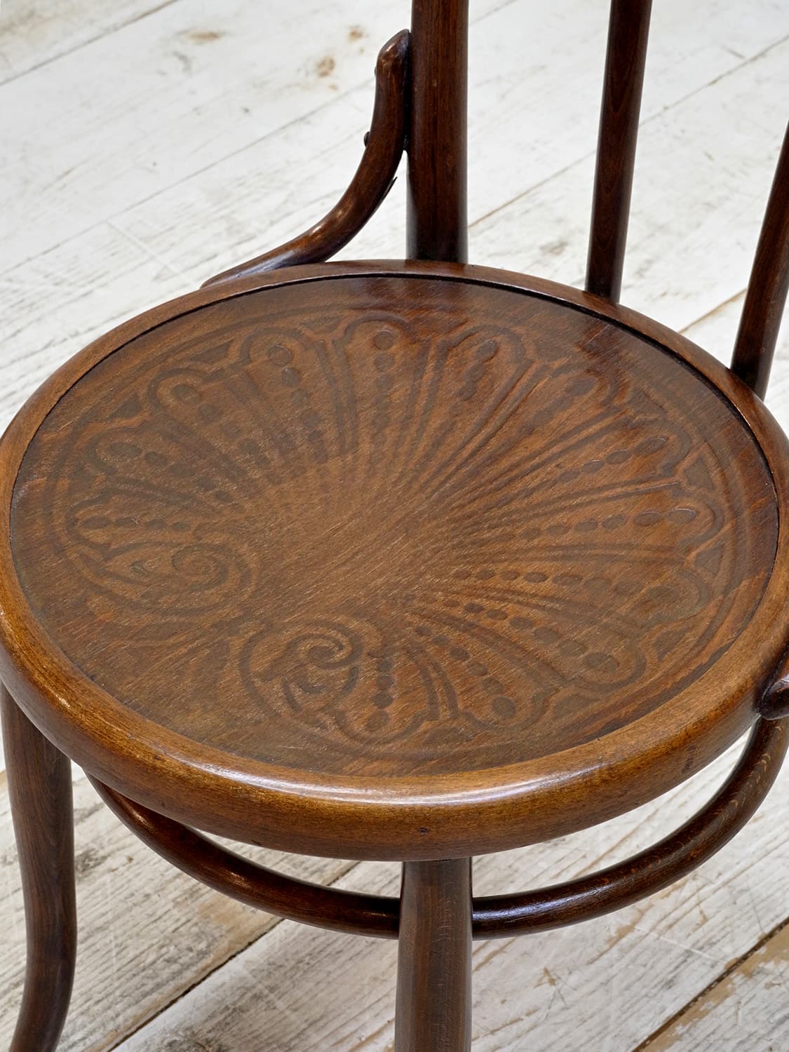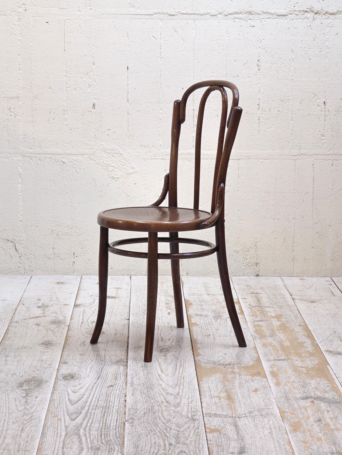 推定1930年代、アンティークベントウッドチェアです。ベントウッドチェアとは蒸気で柔らかくした木材を型にはめて曲げ木加工されたチェアで美しい曲線デザインを楽しむことができます。片手で持ちあげられるほど軽く、持ち運びにも便利です。弊社の修理部門でもメンテナンスをしながら長く使用いただいているアイテムのひとつです。ベントウッドチェアは座面や背もたれのデザインの種類も多く、お気に入りの一点を見つけるのも楽しいです。座面までの高さは47cmです。こちらの椅子はメンテナンス済みです。ベントウッドチェアの一覧はこちらから。