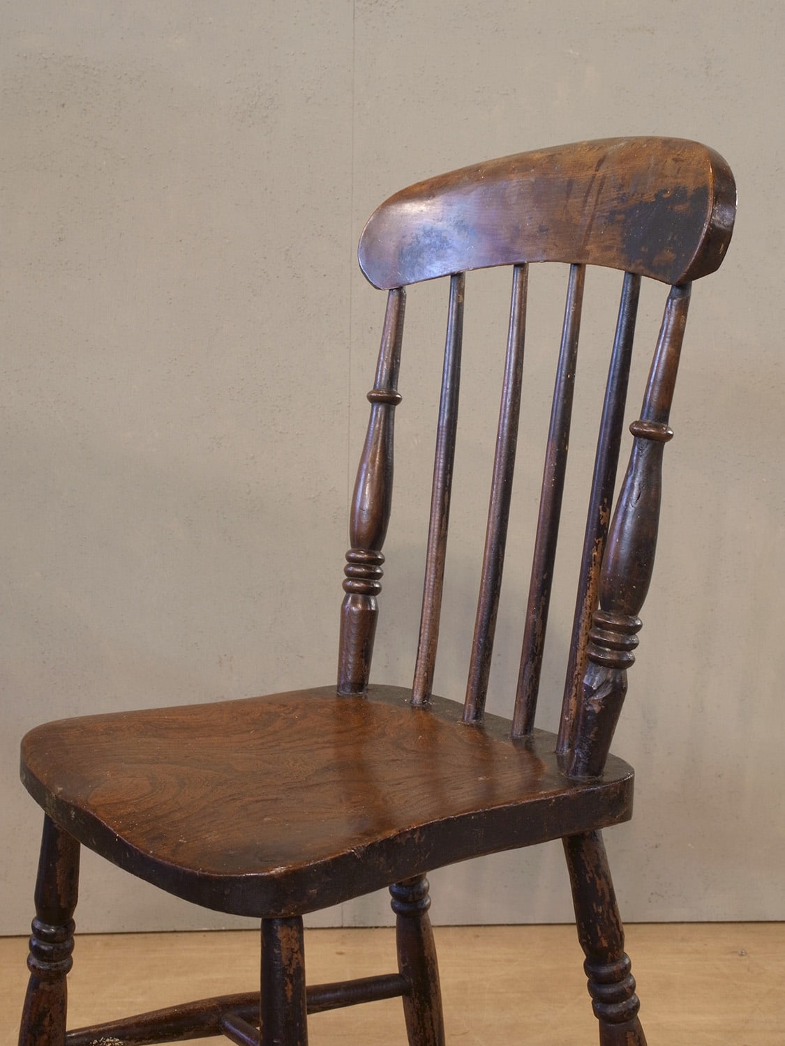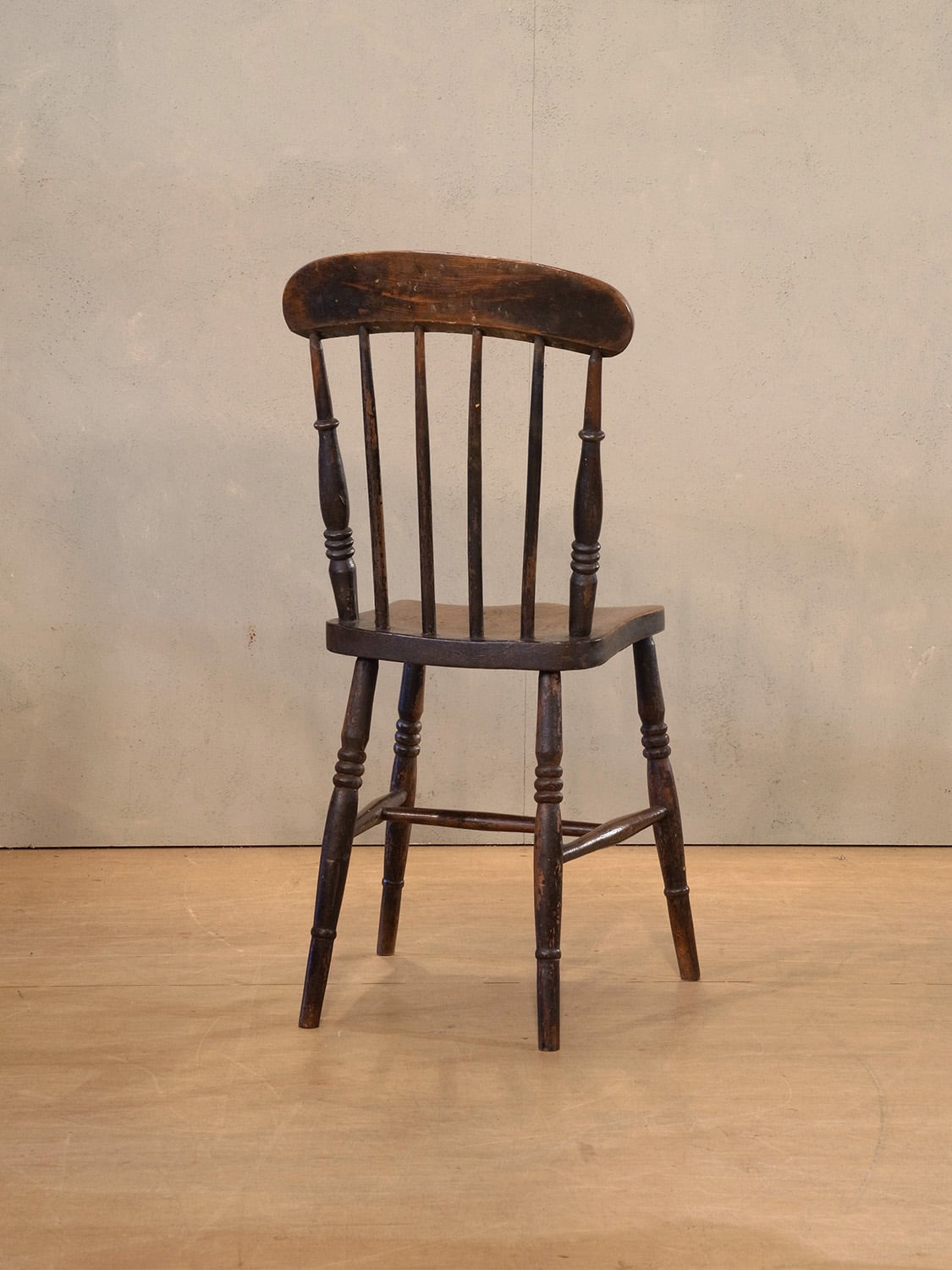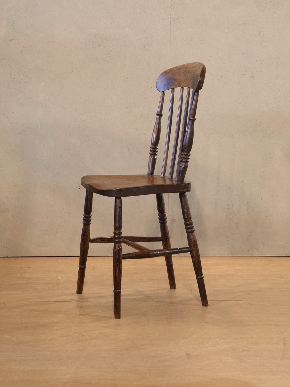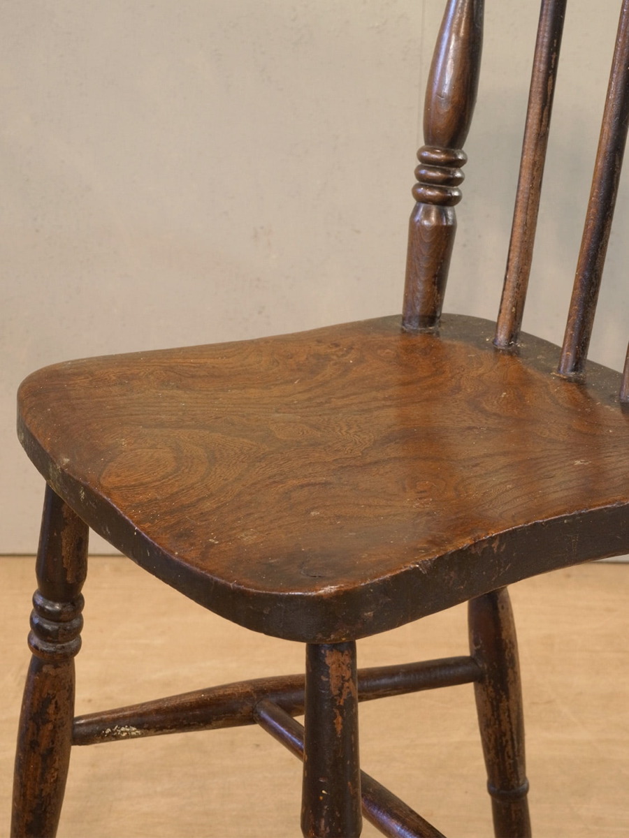 推定1930年代、イギリス製のアンティークキッチンチェアです。キッチンチェアとは文字通りキッチンで使う作業椅子のことでイギリスの農家(ファームハウス)や一般家庭で使われていました。スタンダードなキッチンチェアなので、揃ったデザインに統一できるため日本ではダイニングチェアとして人気があります。座面までの高さは44.5cmです。こちらの椅子はメンテナンス済みです。その他キッチンチェアの一覧はこちらから。