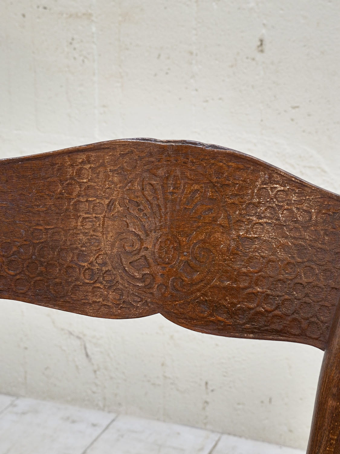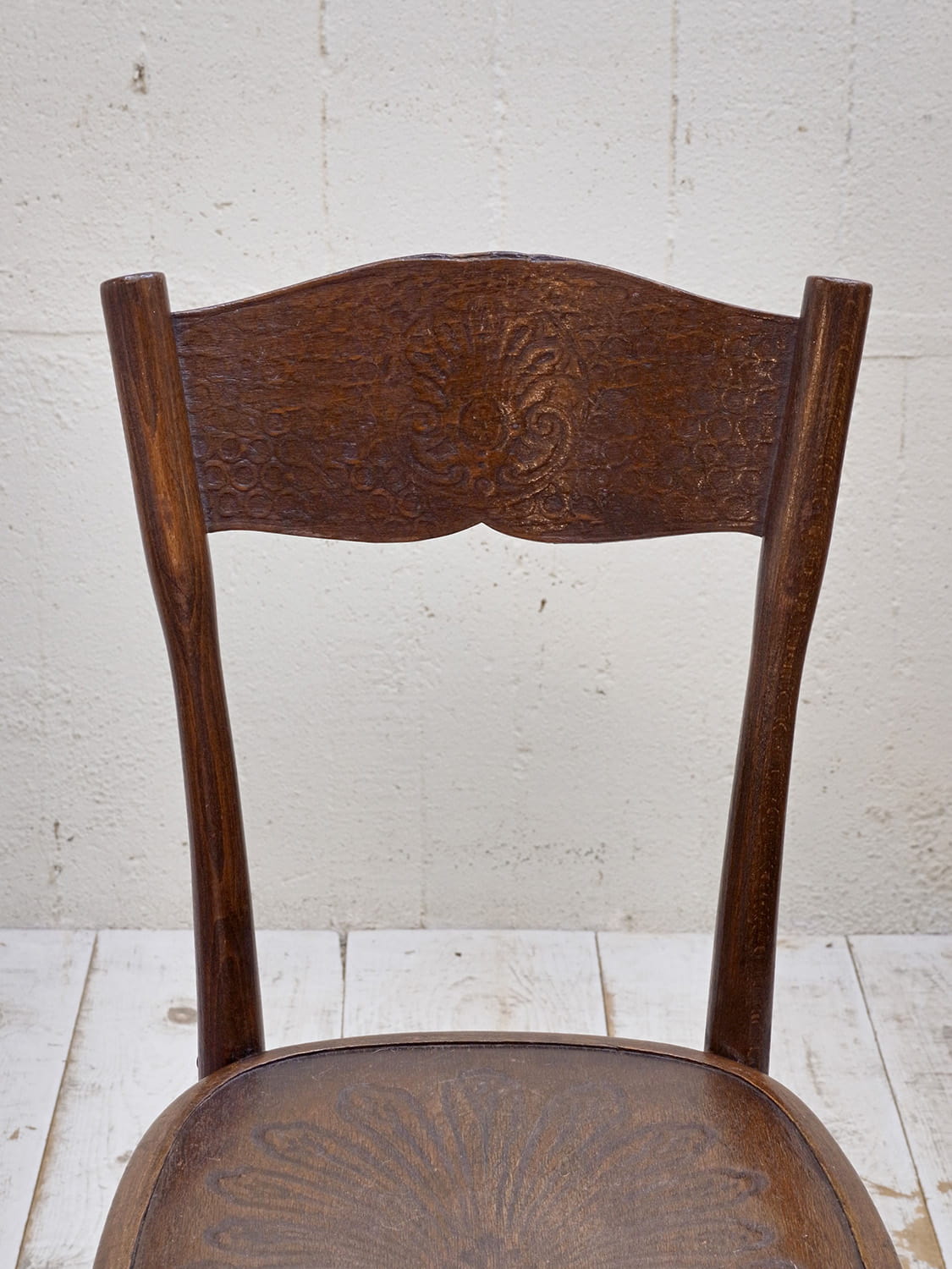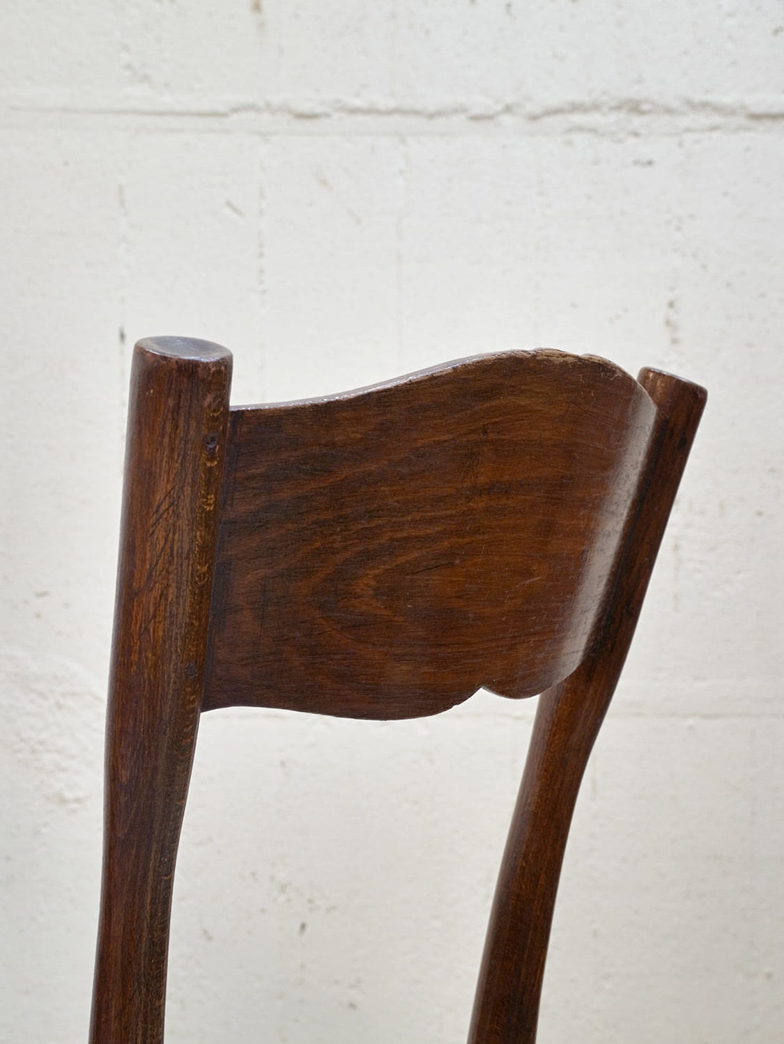 推定1930年代、アンティークベントウッドチェアです。ベントウッドチェアとは蒸気で柔らかくした木材を型にはめて曲げ木加工されたチェアで美しい曲線デザインを楽しむことができます。片手で持ちあげられるほど軽く、持ち運びにも便利です。ベントウッドチェアは座面や背もたれのデザインの種類も多く(こちらのベントウッドチェアはバネルバックタイプ)、お気に入りの一点を見つけるのも楽しいです。
