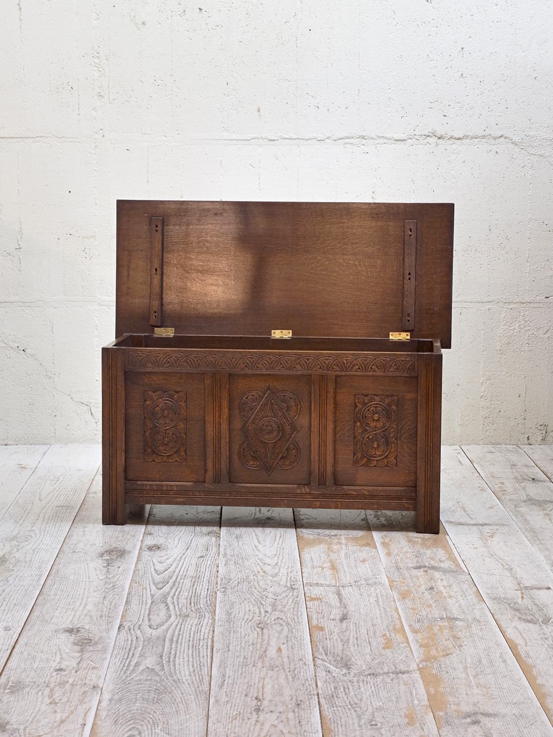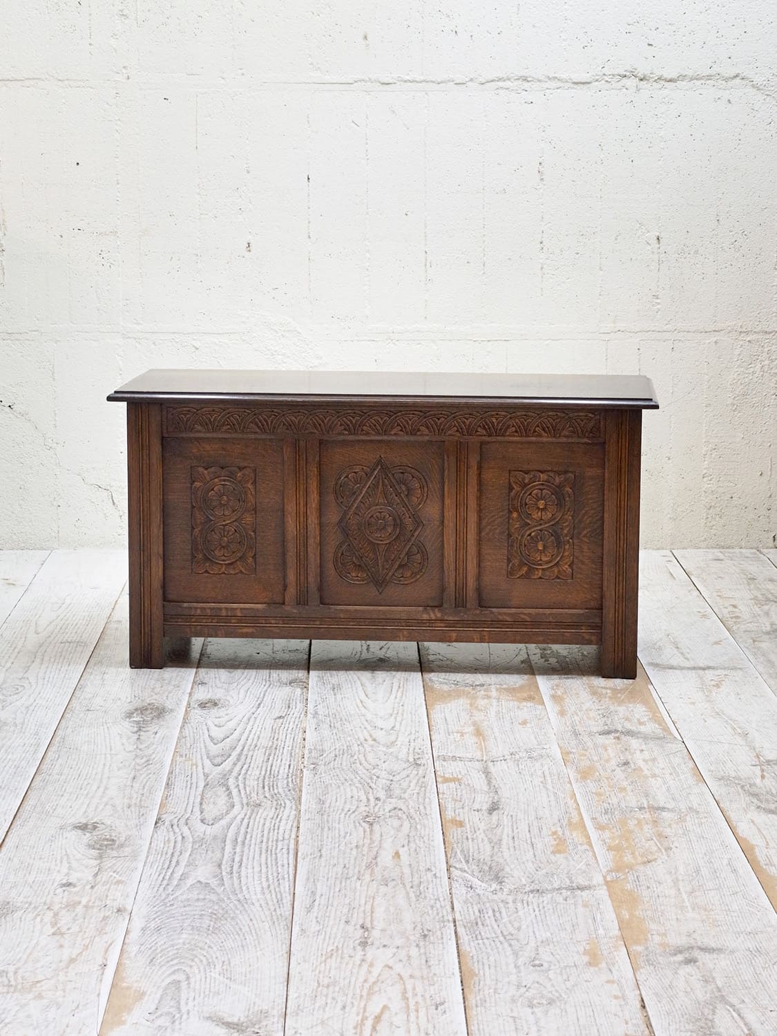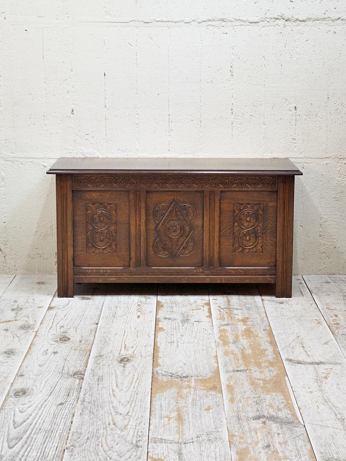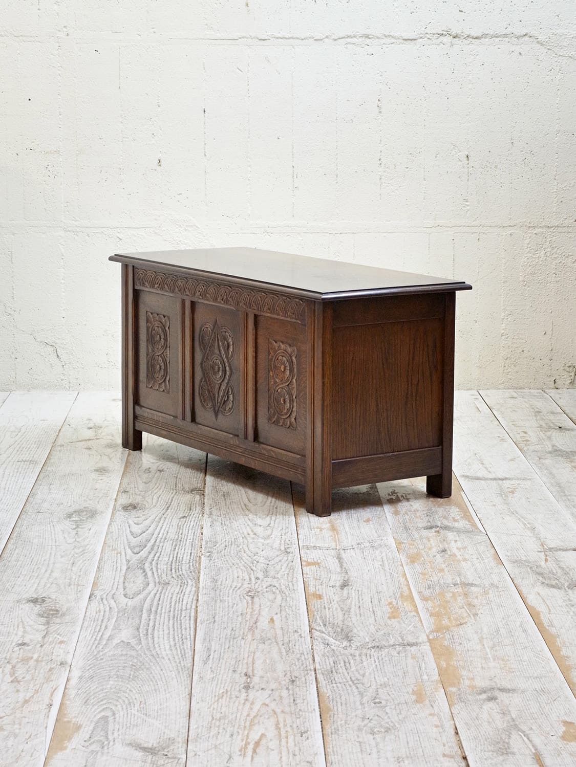 推定1940年代、イギリス製のアンティークオークコファーです。コファーとは蓋付きの箱型家具のことで、ベットの足元に置いてブランケット類の収納に使われていました。収納付きベンチやコーヒーテーブルとしてのご使用もおすすめです。オーク材を使用し細かな彫刻が施された重厚感のある家具です。箱内寸 W950 D355 H455mm。その他ボックスはこちらから。
