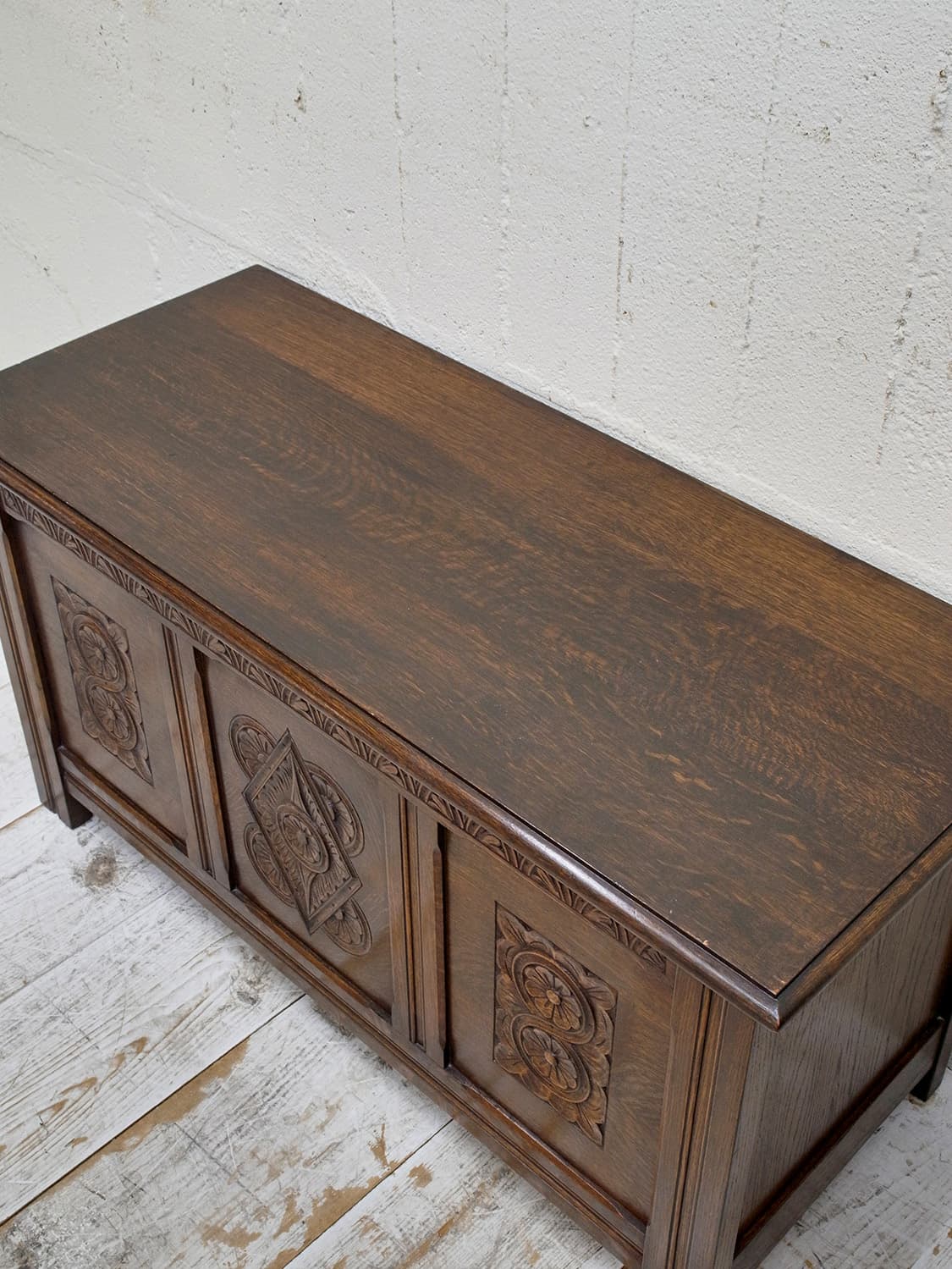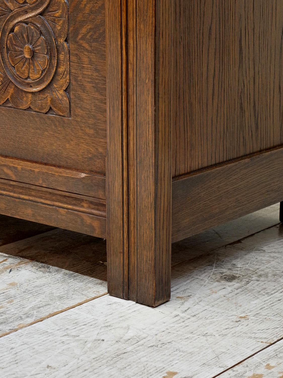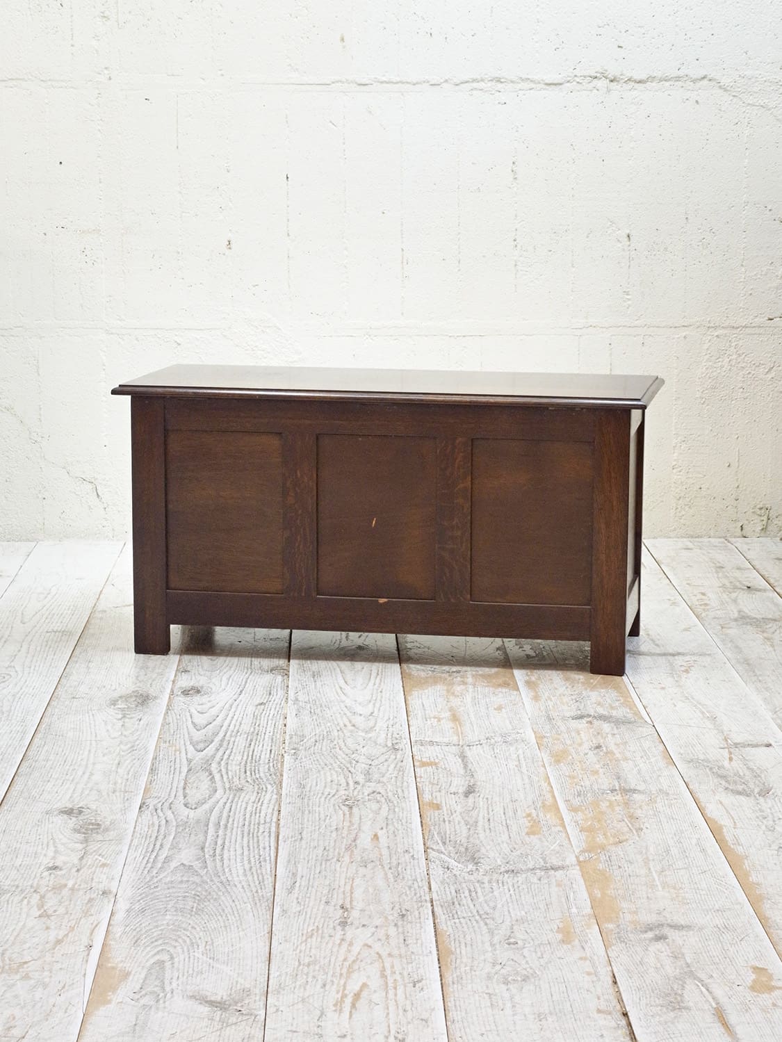 推定1940年代、イギリス製のアンティークオークコファーです。コファーとは蓋付きの箱型家具のことで、ベットの足元に置いてブランケット類の収納に使われていました。収納付きベンチやコーヒーテーブルとしてのご使用もおすすめです。オーク材を使用し細かな彫刻が施された重厚感のある家具です。箱内寸 W950 D355 H455mm。その他ボックスはこちらから。