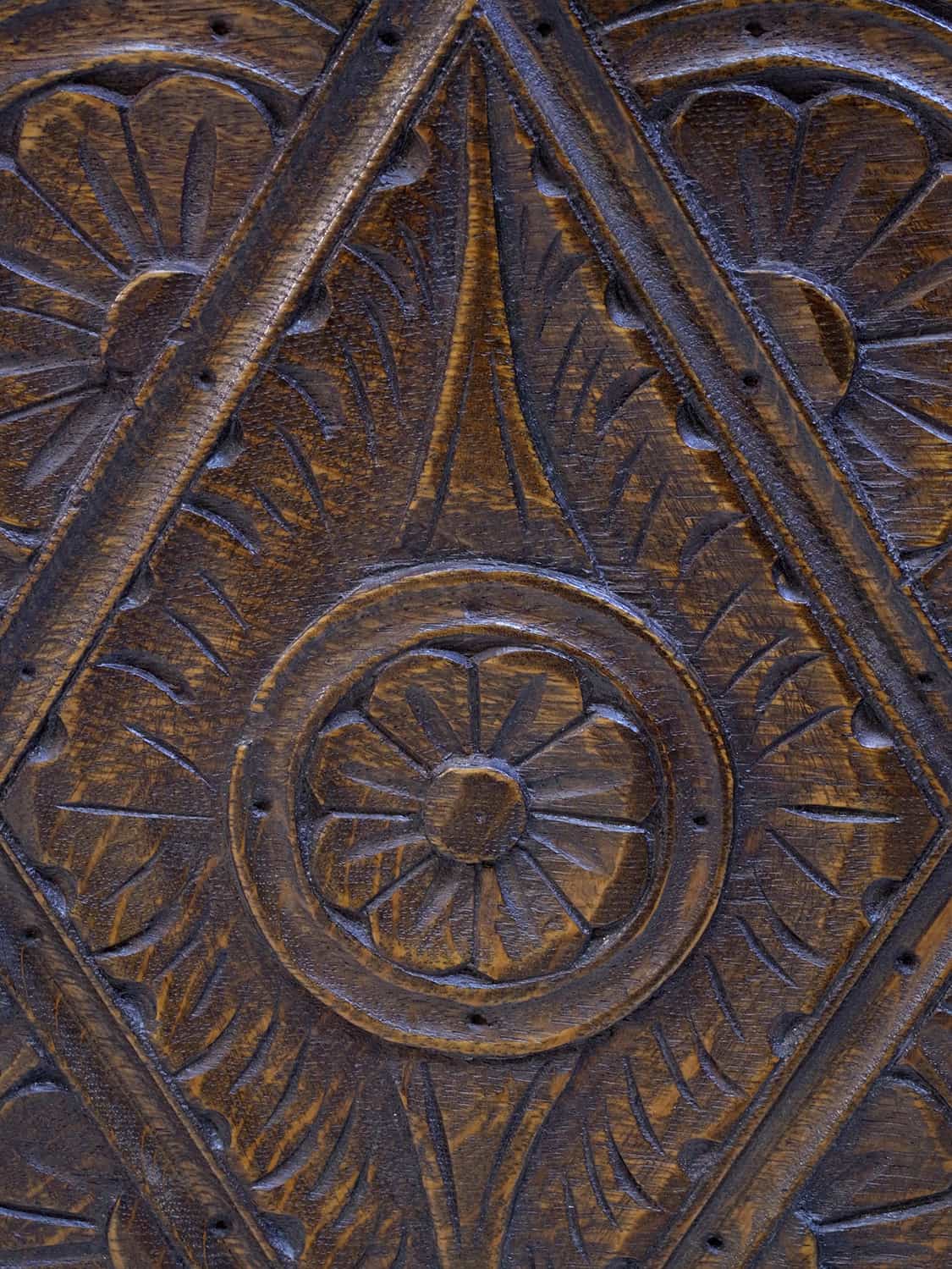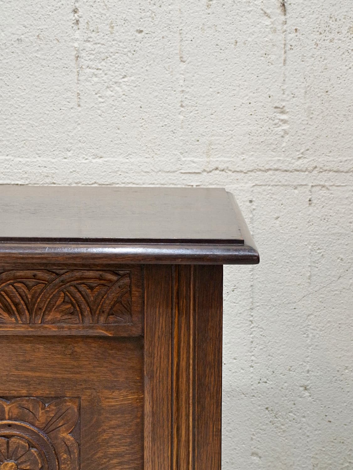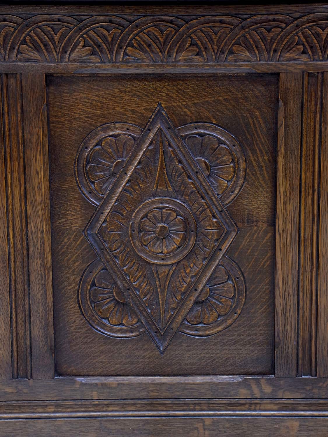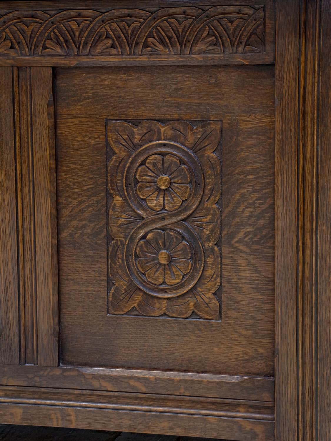 推定1940年代、イギリス製のアンティークオークコファーです。コファーとは蓋付きの箱型家具のことで、ベットの足元に置いてブランケット類の収納に使われていました。収納付きベンチやコーヒーテーブルとしてのご使用もおすすめです。オーク材を使用し細かな彫刻が施された重厚感のある家具です。箱内寸 W950 D355 H455mm。その他ボックスはこちらから。