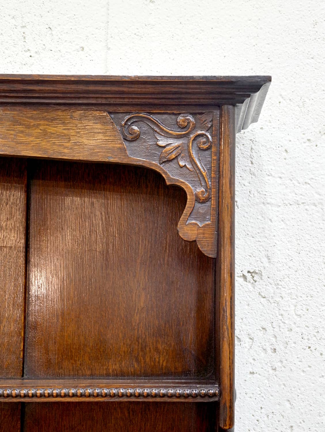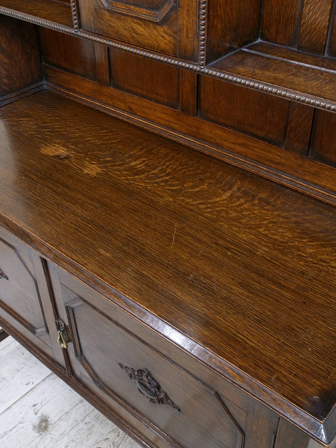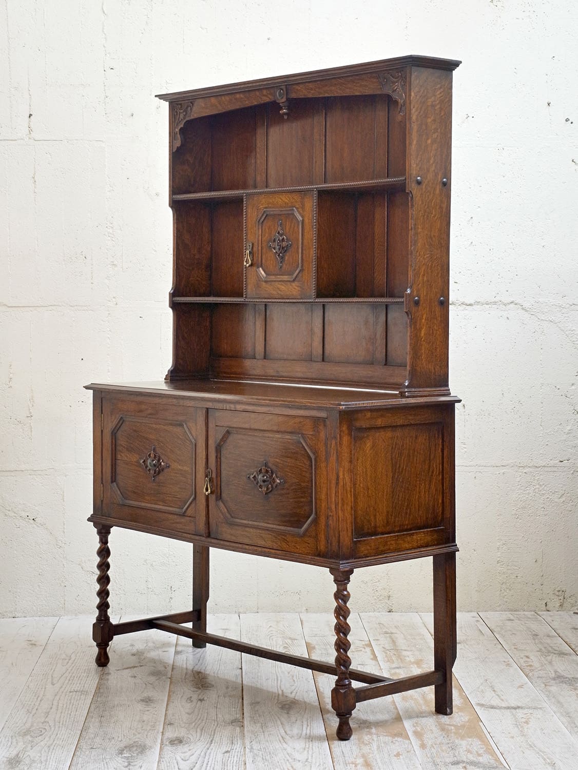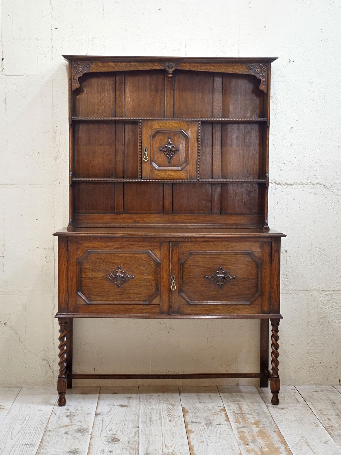 推定1930年代、イギリス製のアンティークオークドレッサーです。キッチンで、上台を飾り棚としてご使用、天板にキッチンで使う器具を置いて、下扉内に大型の収納があるので大きい鍋なども収めることができます。上台と下台に分かれてお届けできますので、狭い場所にも設置いただけます。天板までの高さ91cm、棚内寸 W1065 D160 H135~265mm。W365 D160 H315 ×2。 下扉内寸 W1115 D365 H385mm。※パーツがない箇所もありますので、メンテナンスにお時間をいただきます。その他ドレッサーはこちらから。