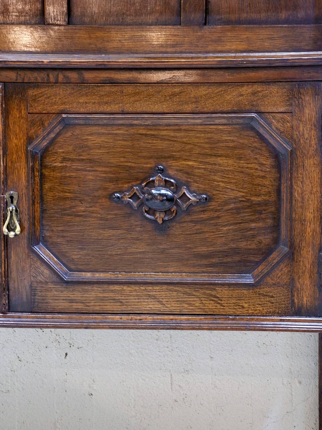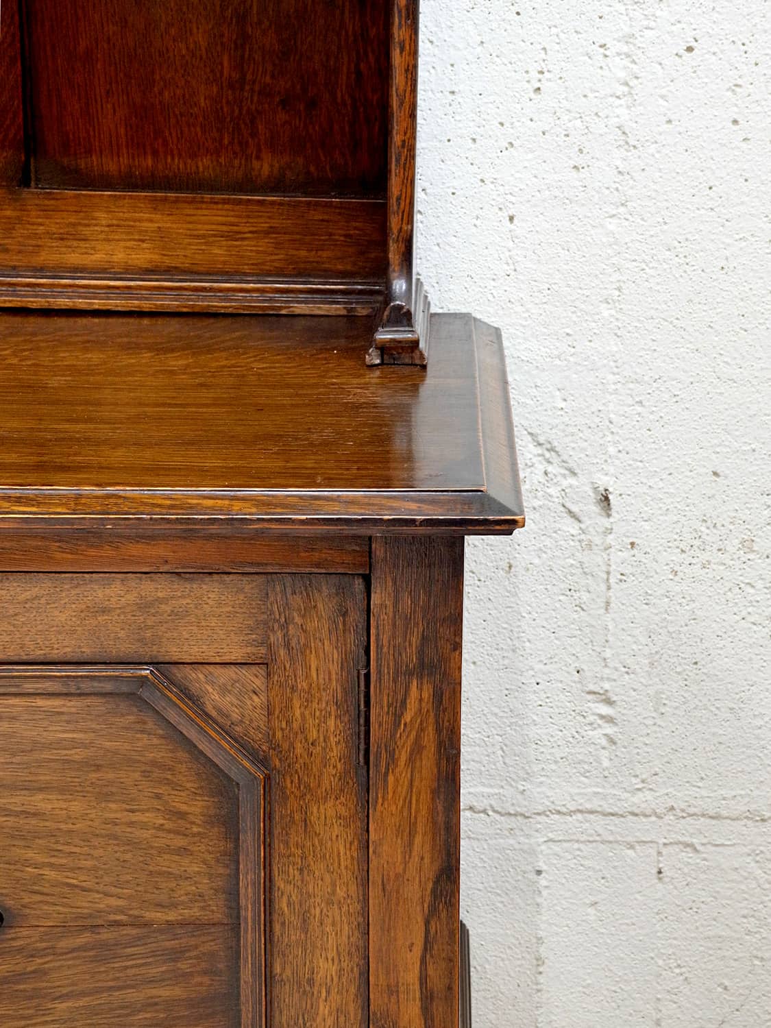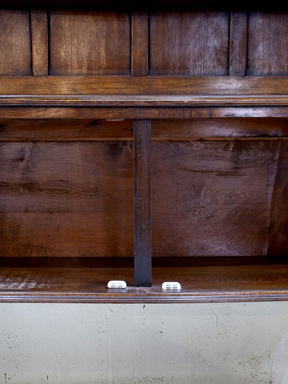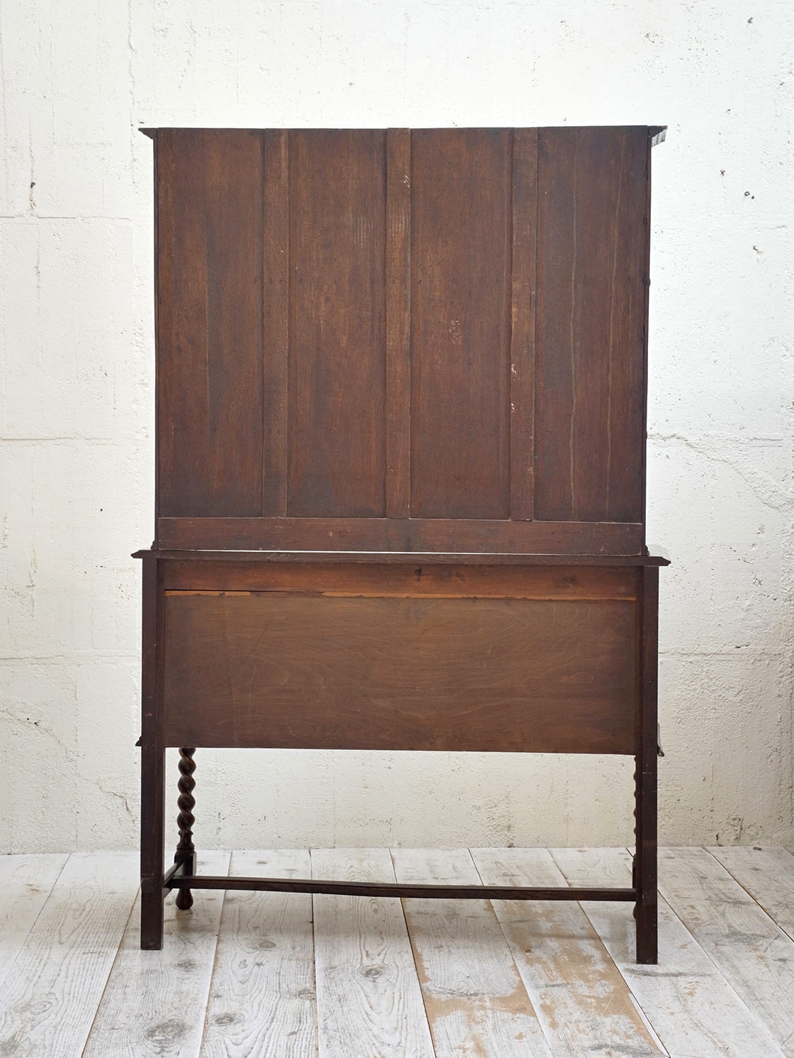 推定1930年代、イギリス製のアンティークオークドレッサーです。キッチンで、上台を飾り棚としてご使用、天板にキッチンで使う器具を置いて、下扉内に大型の収納があるので大きい鍋なども収めることができます。上台と下台に分かれてお届けできますので、狭い場所にも設置いただけます。天板までの高さ91cm、棚内寸 W1065 D160 H135~265mm。W365 D160 H315 ×2。 下扉内寸 W1115 D365 H385mm。※パーツがない箇所もありますので、メンテナンスにお時間をいただきます。その他ドレッサーはこちらから。