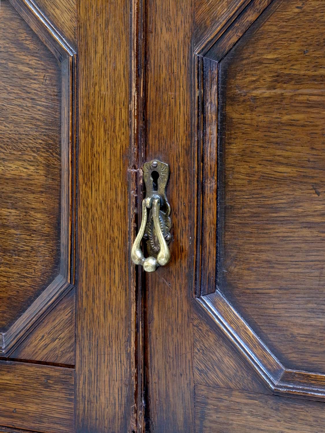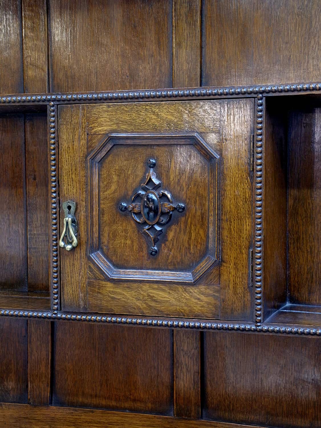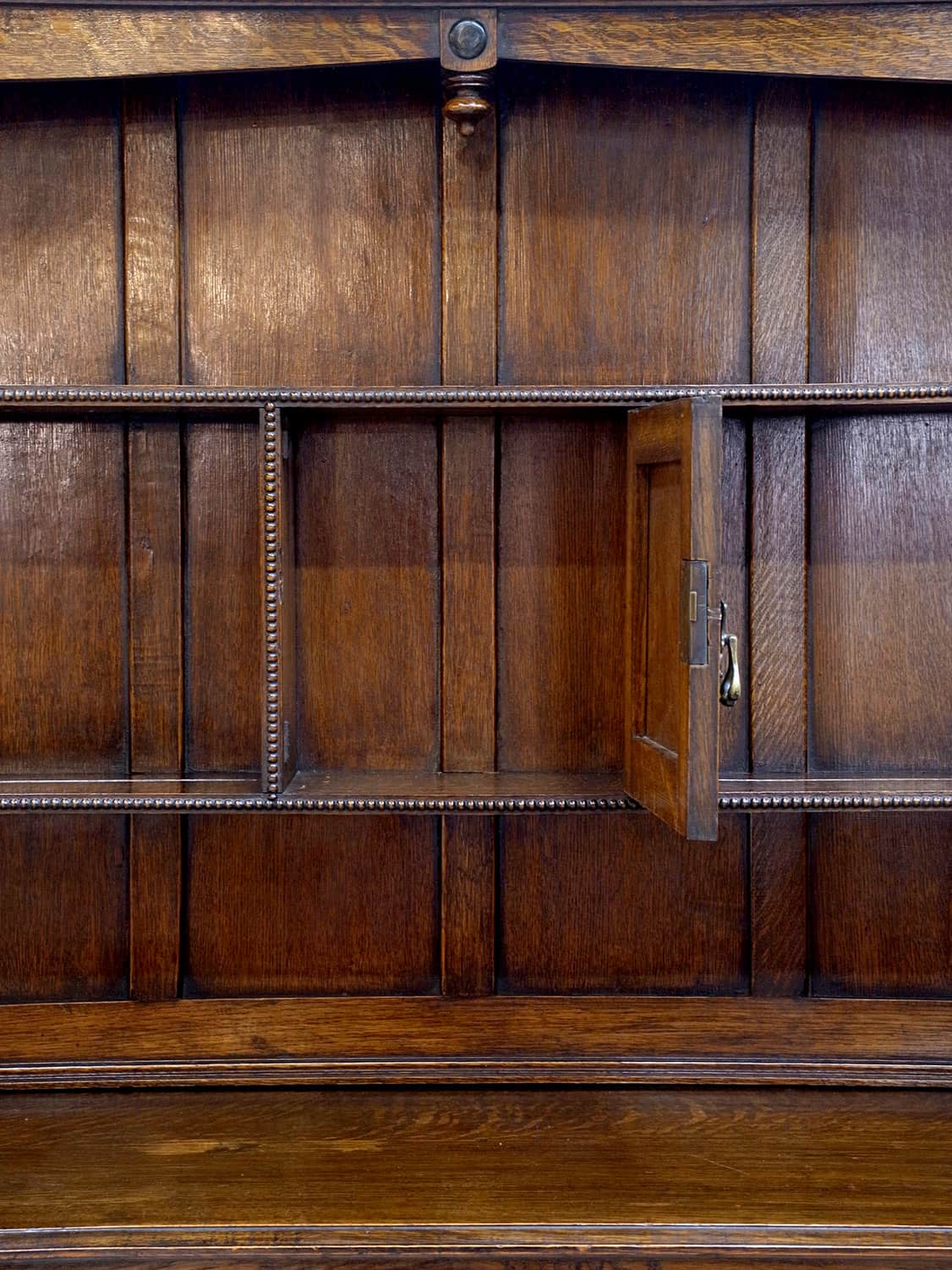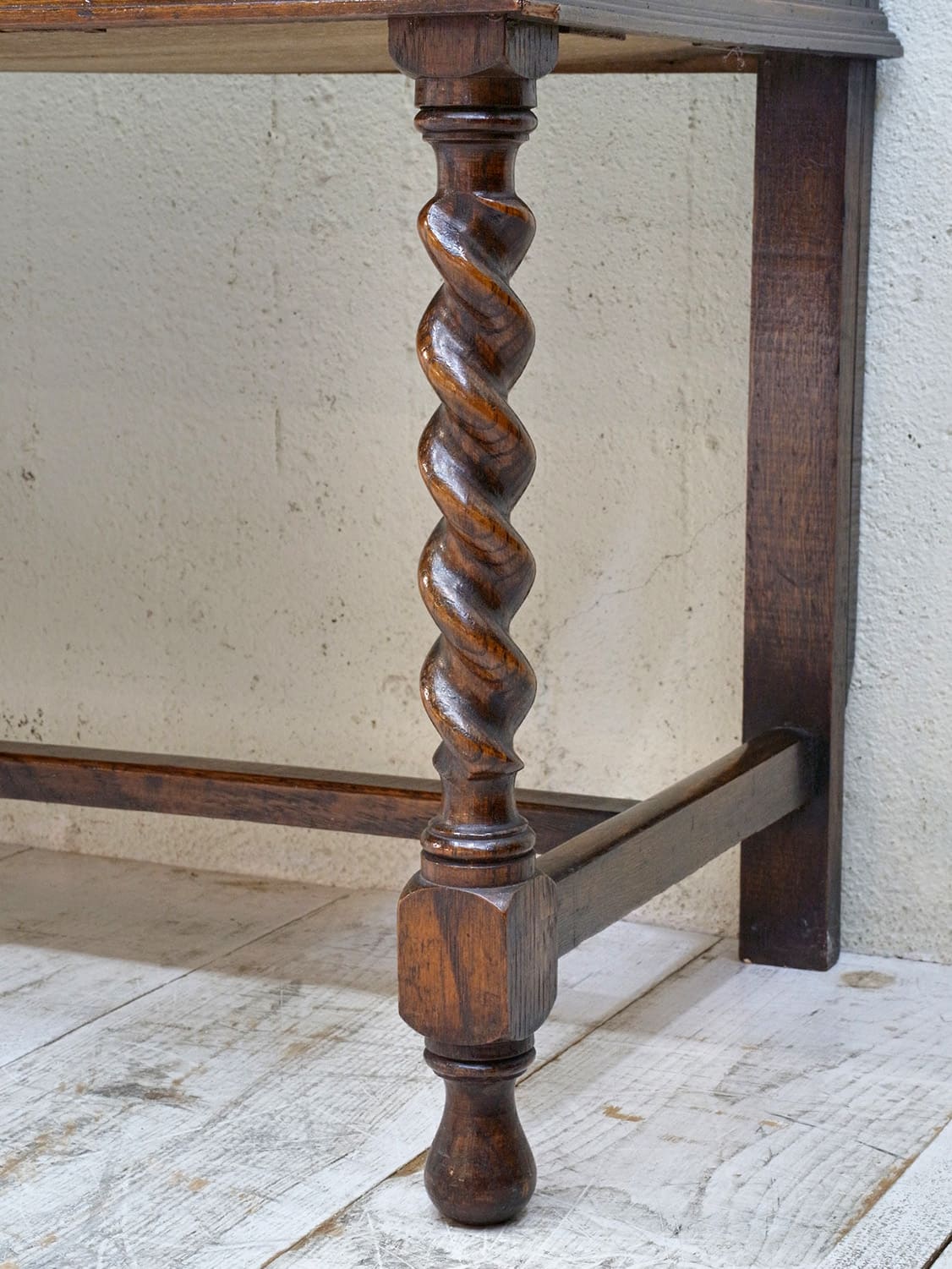 推定1930年代、イギリス製のアンティークオークドレッサーです。キッチンで、上台を飾り棚としてご使用、天板にキッチンで使う器具を置いて、下扉内に大型の収納があるので大きい鍋なども収めることができます。上台と下台に分かれてお届けできますので、狭い場所にも設置いただけます。天板までの高さ91cm、棚内寸 W1065 D160 H135~265mm。W365 D160 H315 ×2。 下扉内寸 W1115 D365 H385mm。※パーツがない箇所もありますので、メンテナンスにお時間をいただきます。その他ドレッサーはこちらから。