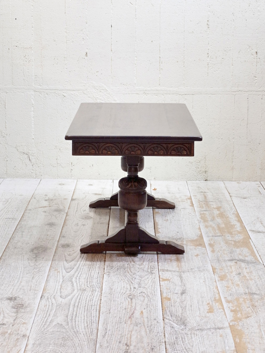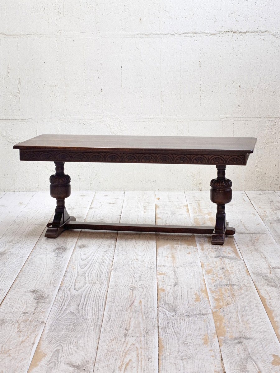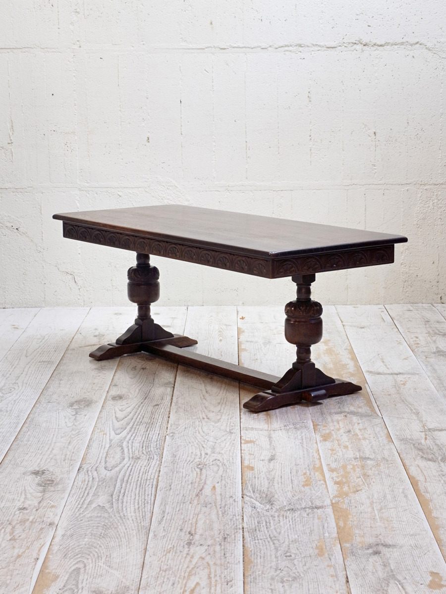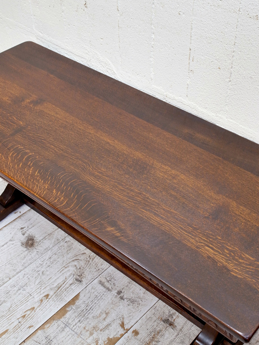 推定1930年代、イギリス製のアンティークオークコーヒーテーブルです。3シーターのソファの前に置いても様になる大きさのコーヒーテーブルです。実用としても大きさがあるので様々な用途でご使用いただけます。リフェクトリーテーブルのようなデザインで、幕板部分には彫刻も施されています。その他コーヒーテーブルはこちらから。