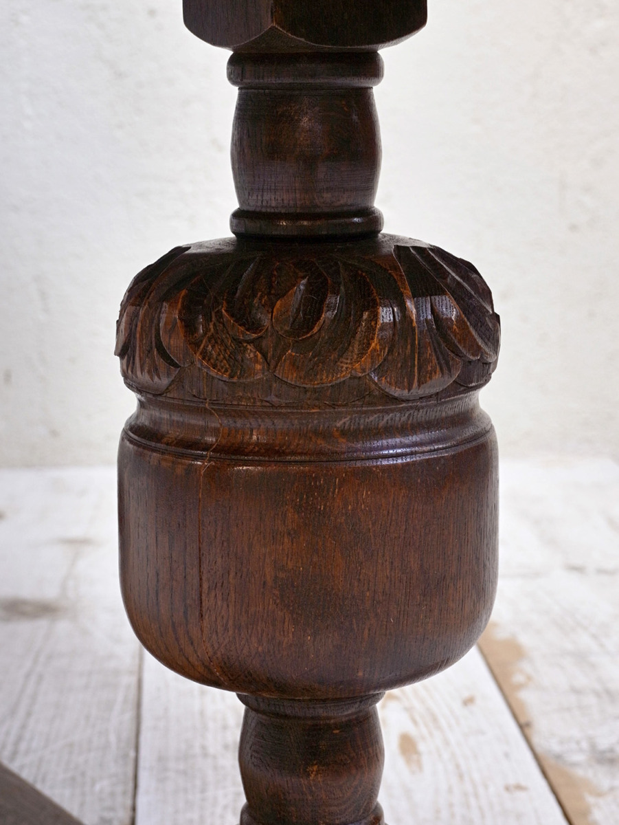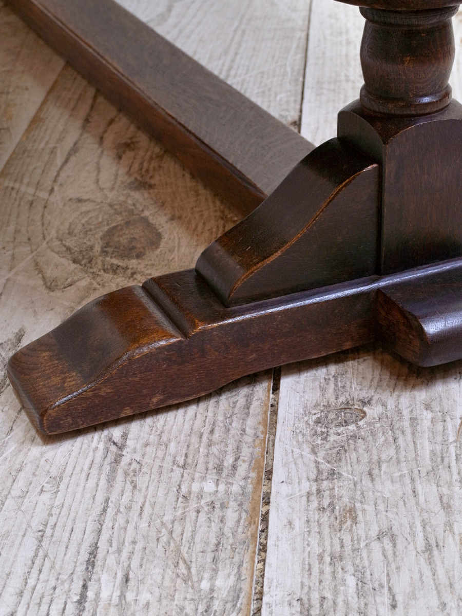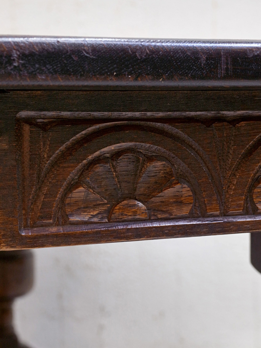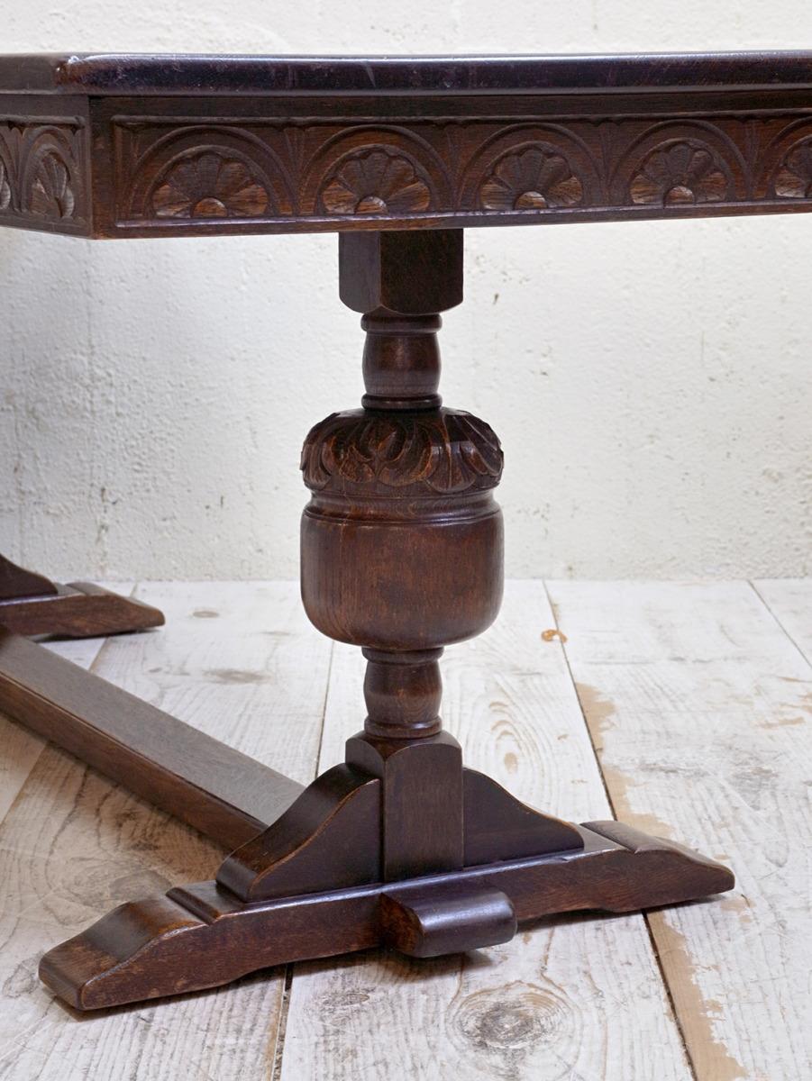 推定1930年代、イギリス製のアンティークオークコーヒーテーブルです。3シーターのソファの前に置いても様になる大きさのコーヒーテーブルです。実用としても大きさがあるので様々な用途でご使用いただけます。リフェクトリーテーブルのようなデザインで、幕板部分には彫刻も施されています。その他コーヒーテーブルはこちらから。