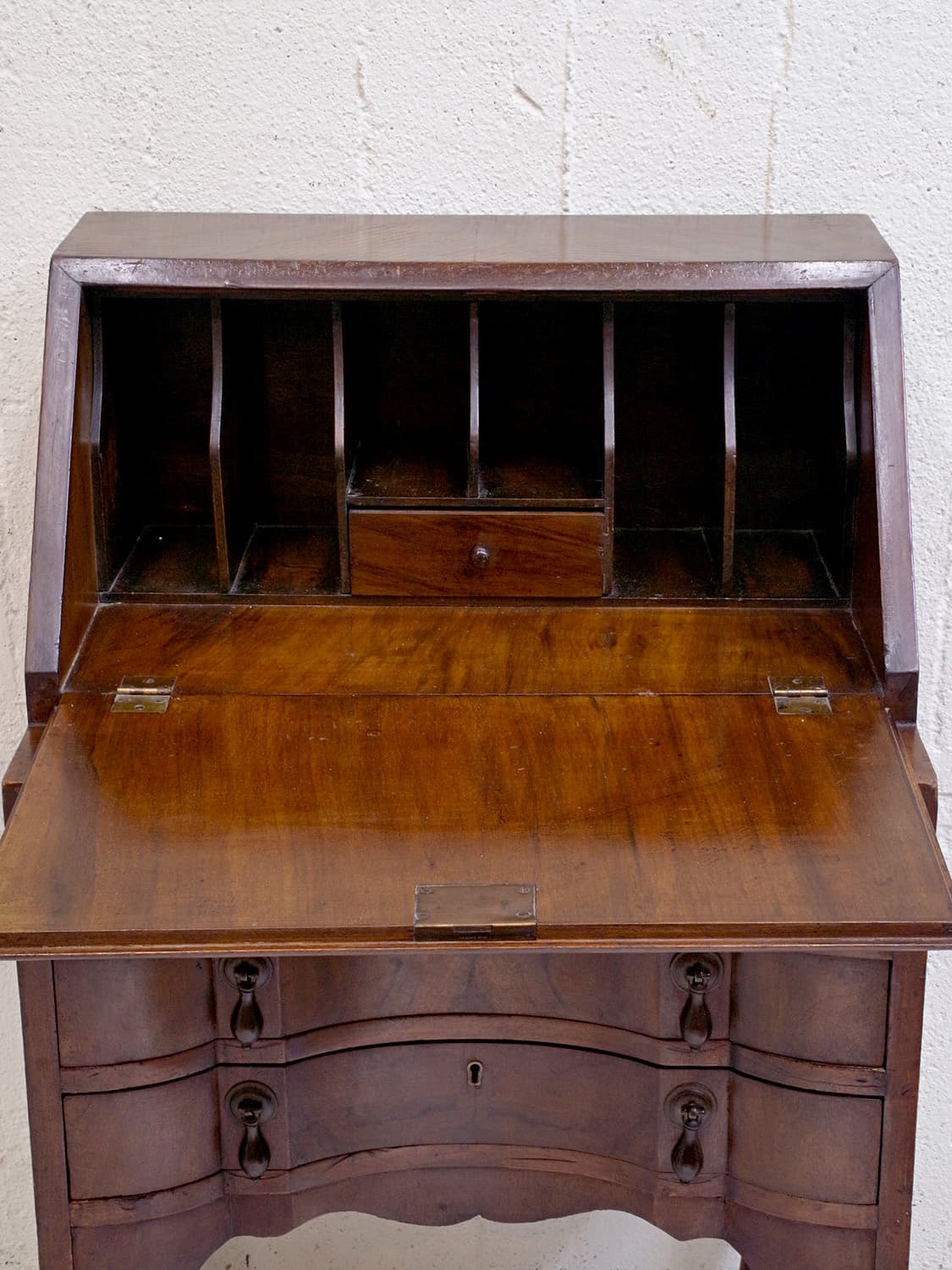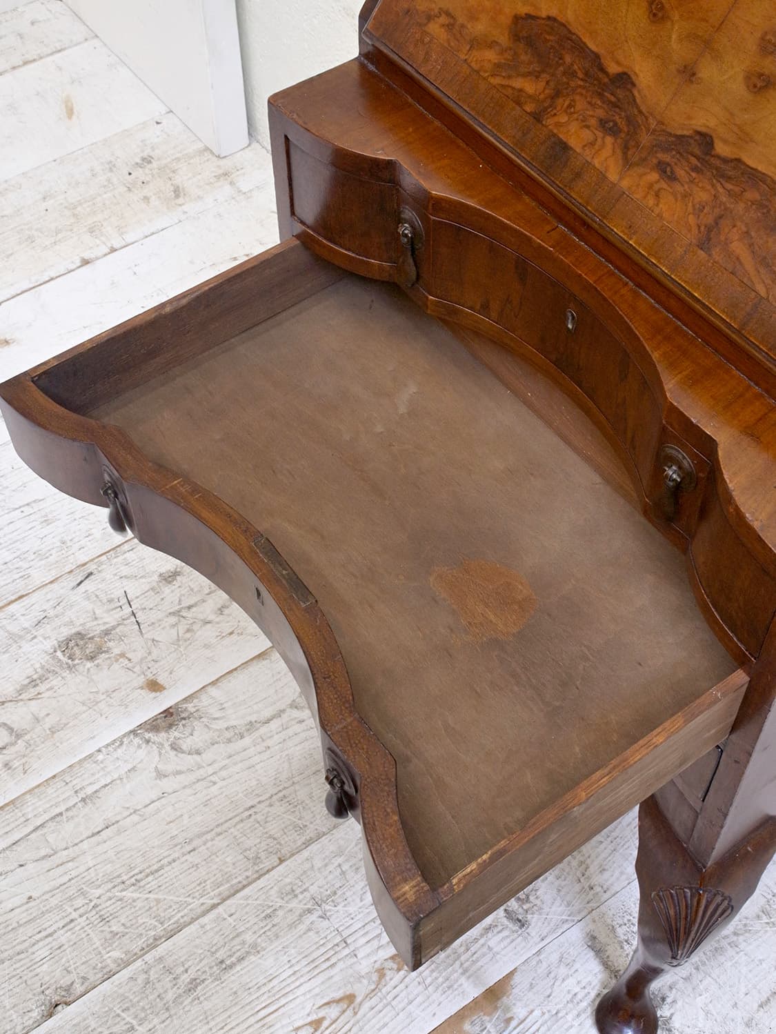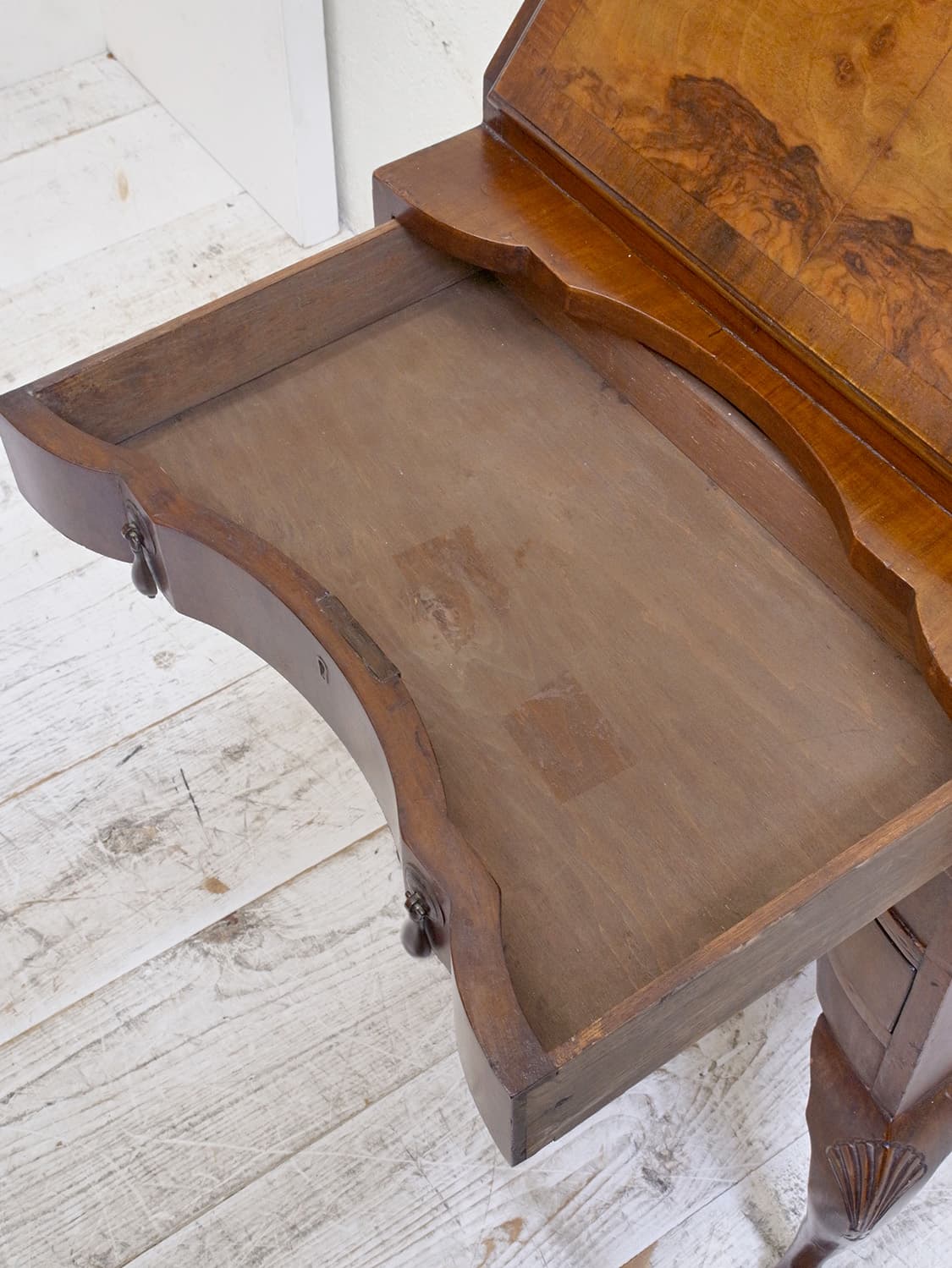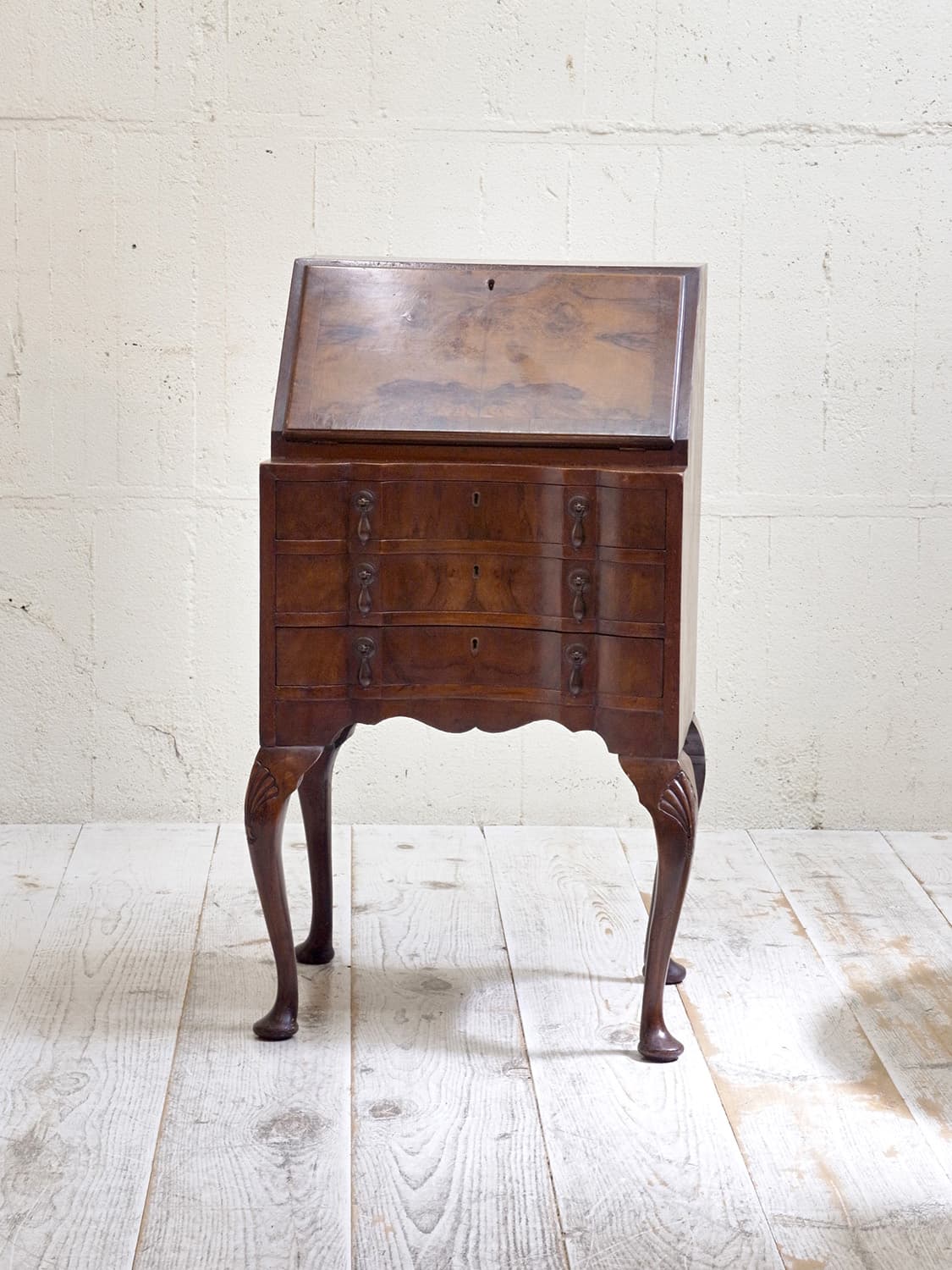 推定1920年代、イギリス製のアンティークウォルナットビューローです。ビューローとは、引き出し付きの書台のことです。ビューロー部分は仕切りや小さな引き出しが付いているのでこまごましたものの収納に最適です。ウォルナットの木目を楽しめるデスクで、リビングや書斎など様々な場所でご使用いただけます。天板までの高さは748mm。引き出し内寸 W475 D308 H65mm×3。その他ビューローはこちらから。