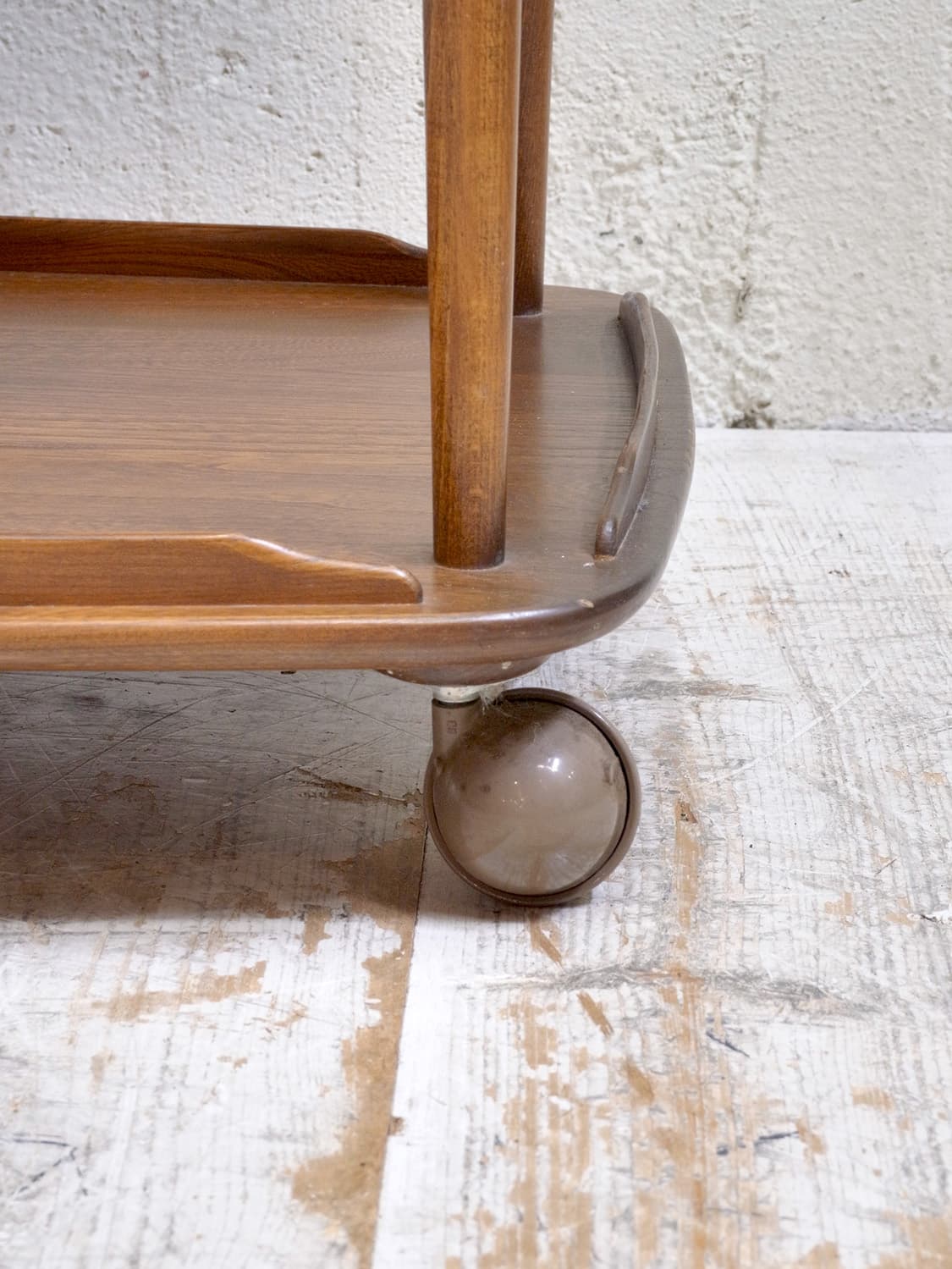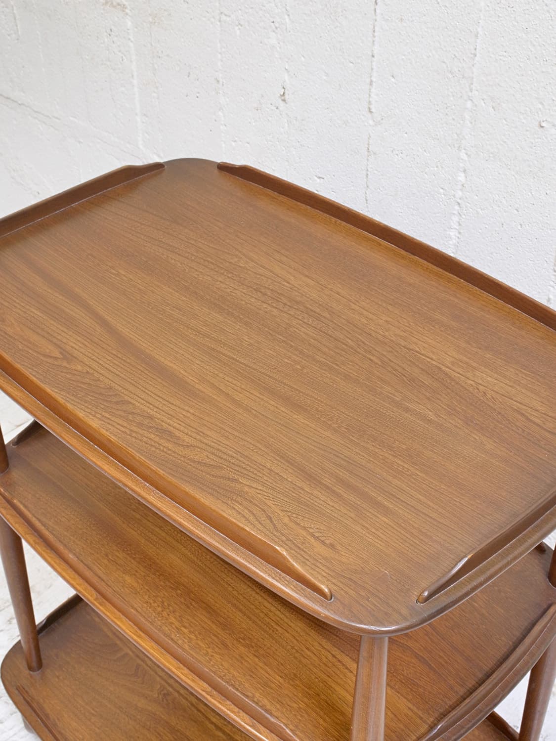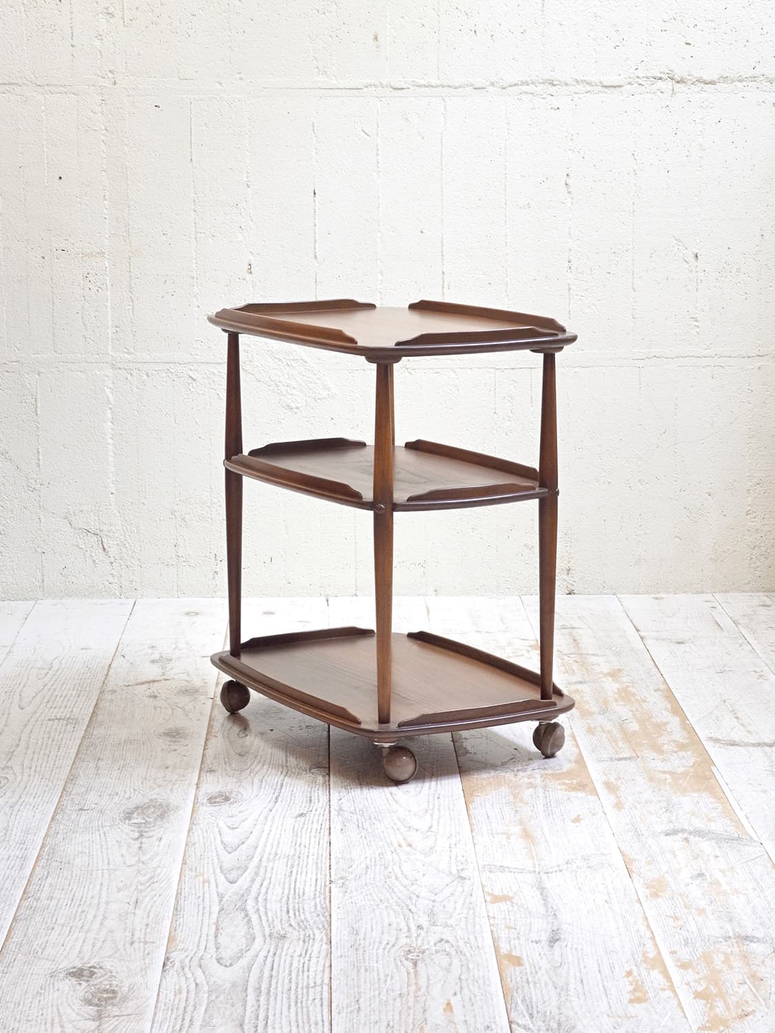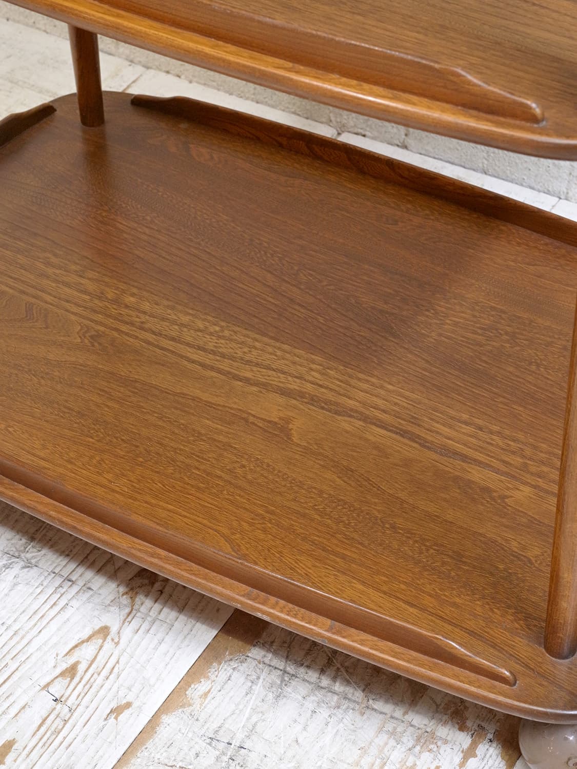 推定1970年代、イギリスのアーコール社製のトロリーです。色味は少し濃いキャメルカラーで、キャスターがついているので動かしやすく掃除の際の移動もしやすいです。トロリーはキッチン周りのワゴンとして、部屋のオープン棚としてもご使用いただけます。天板と棚には、のせたものが落ちないよう縁にフレームがついています。アーコール特有の球体のキャスターが可愛らしいです。1段目の高さ24.5cm、2段目の高さ36cm。その他アーコールの一覧はこちらから。