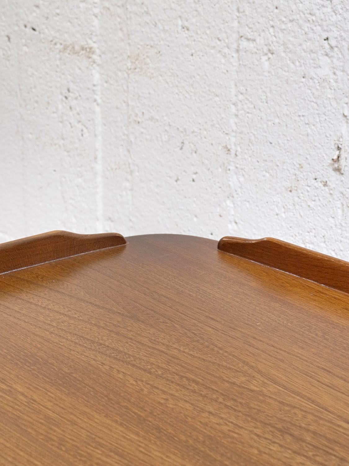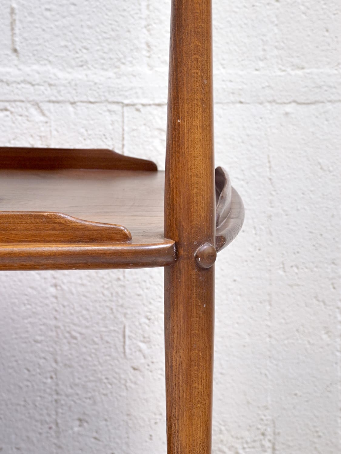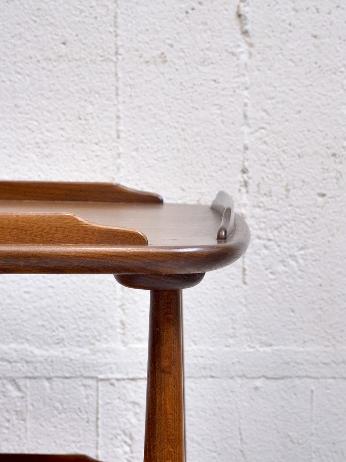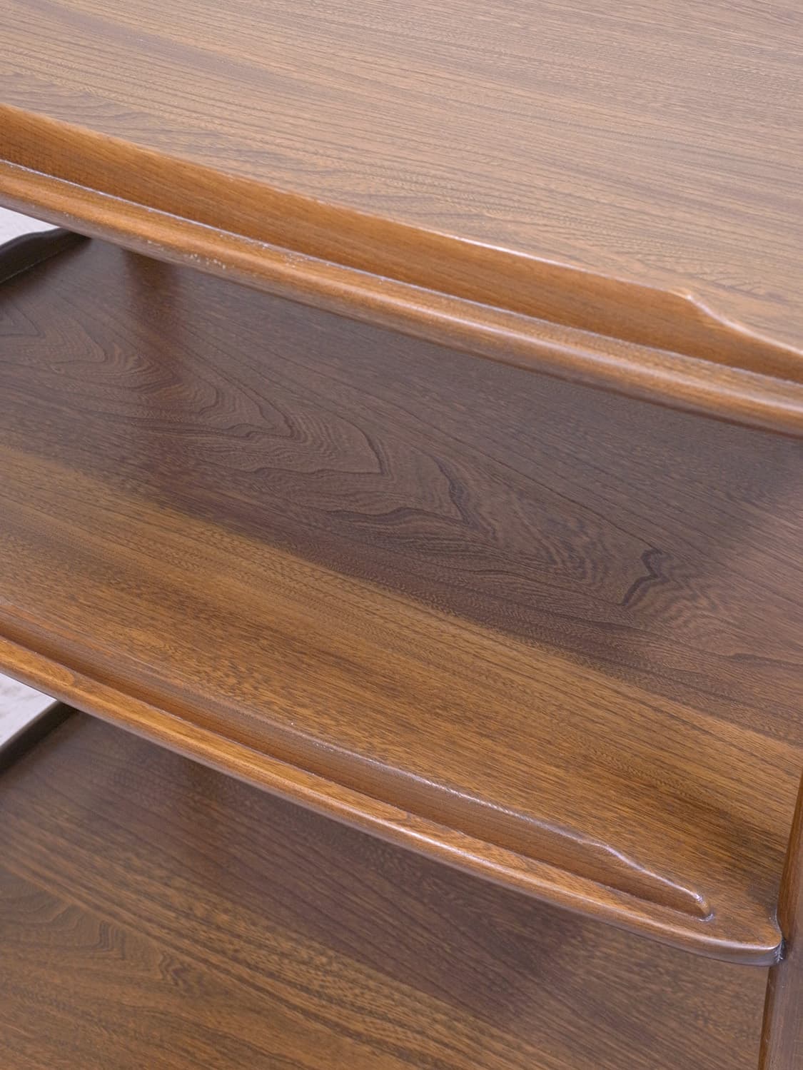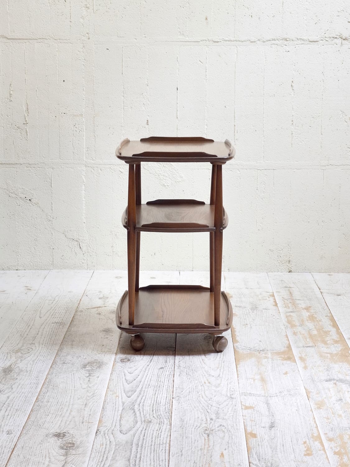 推定1970年代、イギリスのアーコール社製のトロリーです。色味は少し濃いキャメルカラーで、キャスターがついているので動かしやすく掃除の際の移動もしやすいです。トロリーはキッチン周りのワゴンとして、部屋のオープン棚としてもご使用いただけます。天板と棚には、のせたものが落ちないよう縁にフレームがついています。アーコール特有の球体のキャスターが可愛らしいです。1段目の高さ24.5cm、2段目の高さ36cm。その他アーコールの一覧はこちらから。