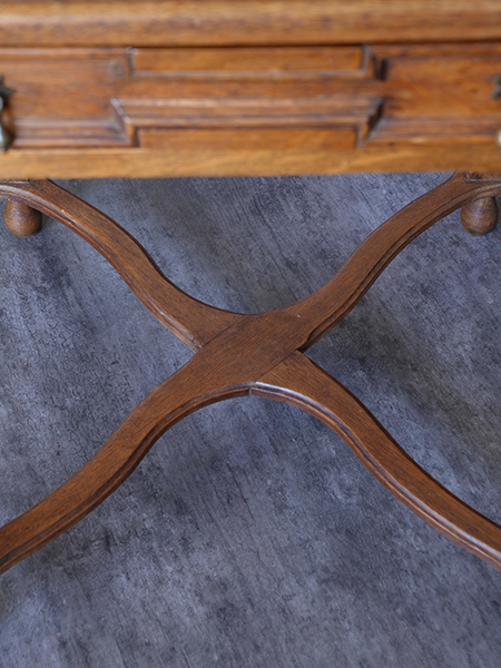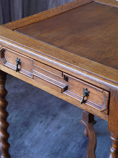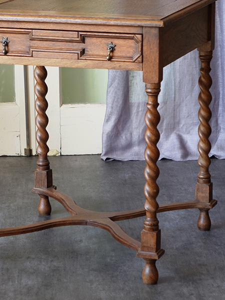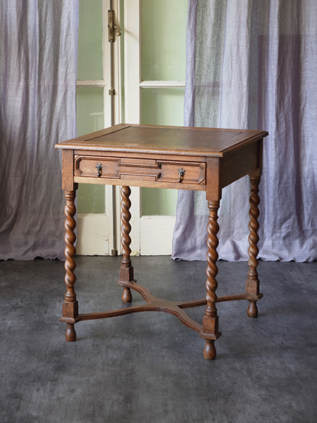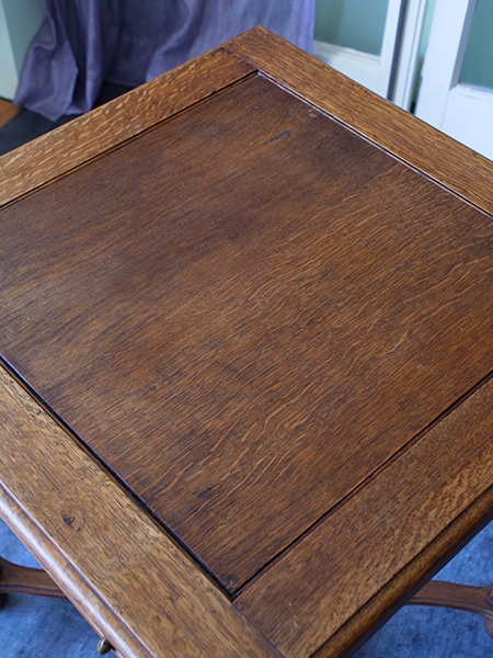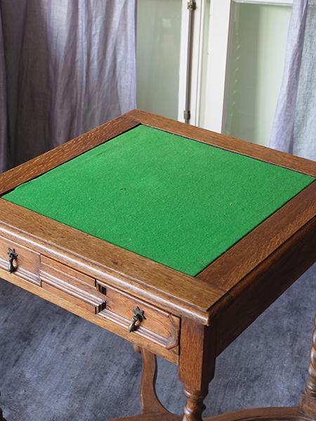 推定1920〜30年代。小ぶりなサイズながら丁寧な細工がされた可愛らしいテーブルです。経年変化を感じる木目がとても良い風合いです。天板をひっくり返すとフェルトの貼られたカードテーブルに変身します。