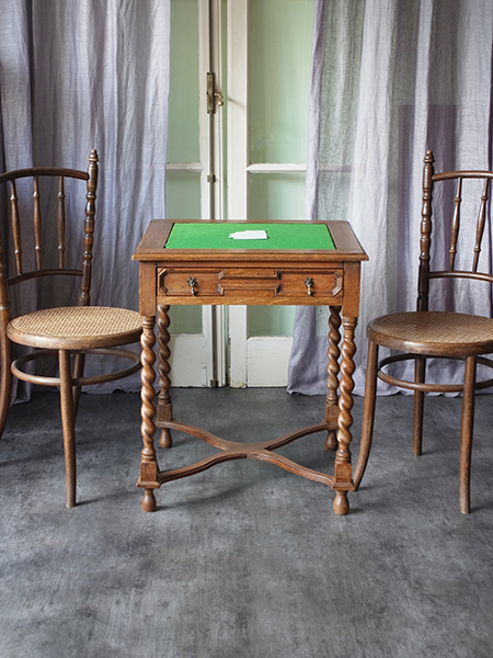 推定1920〜30年代。小ぶりなサイズながら丁寧な細工がされた可愛らしいテーブルです。経年変化を感じる木目がとても良い風合いです。天板をひっくり返すとフェルトの貼られたカードテーブルに変身します。 背景の家具:KV111 ベントウッドチェア