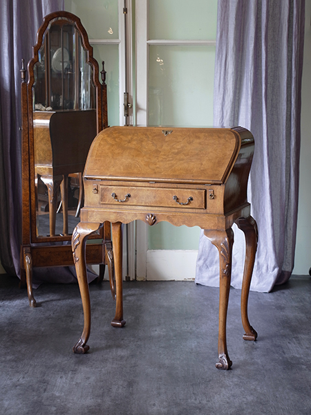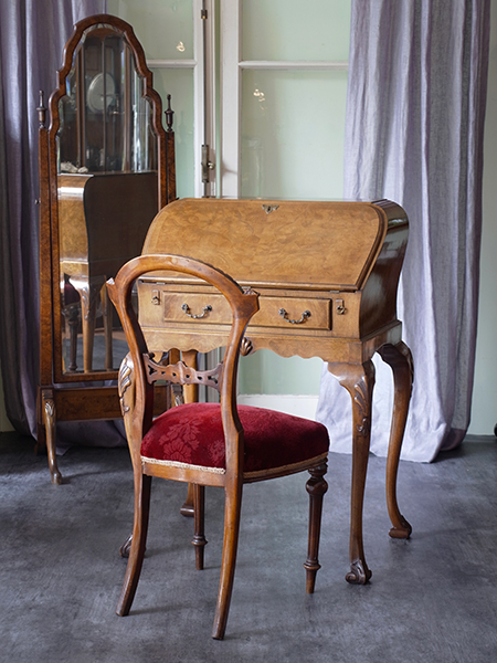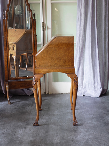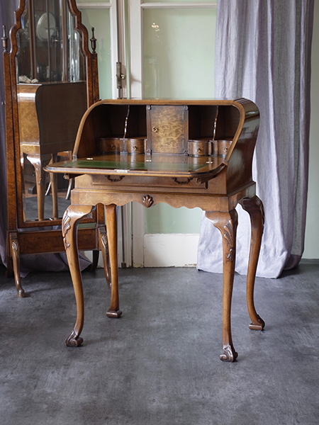 推定1930〜40年代。とても状態のよいウォルナットビビューローです。 天板の革張り部分や引き出しなどとてもきれいです。 ウォルナットの特徴である美しい木目の突き板も美しく、天板を閉じていても 開いていても絵になるビューローです。 書斎だけではなくリビングのコーナーや、ホールなどに置いても良さそう ですね。