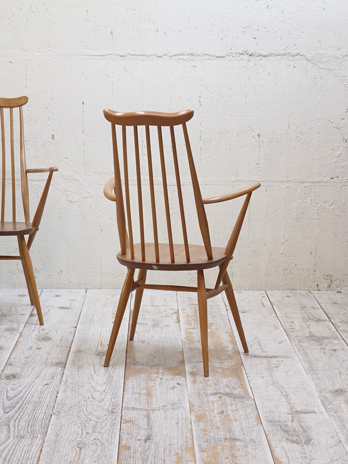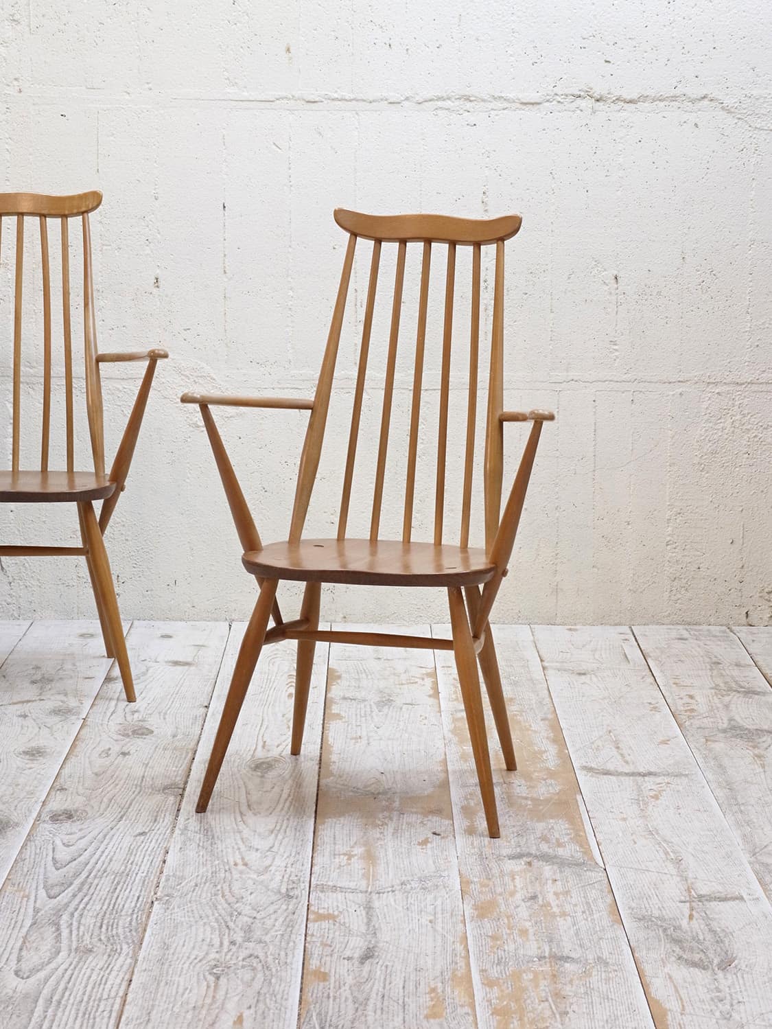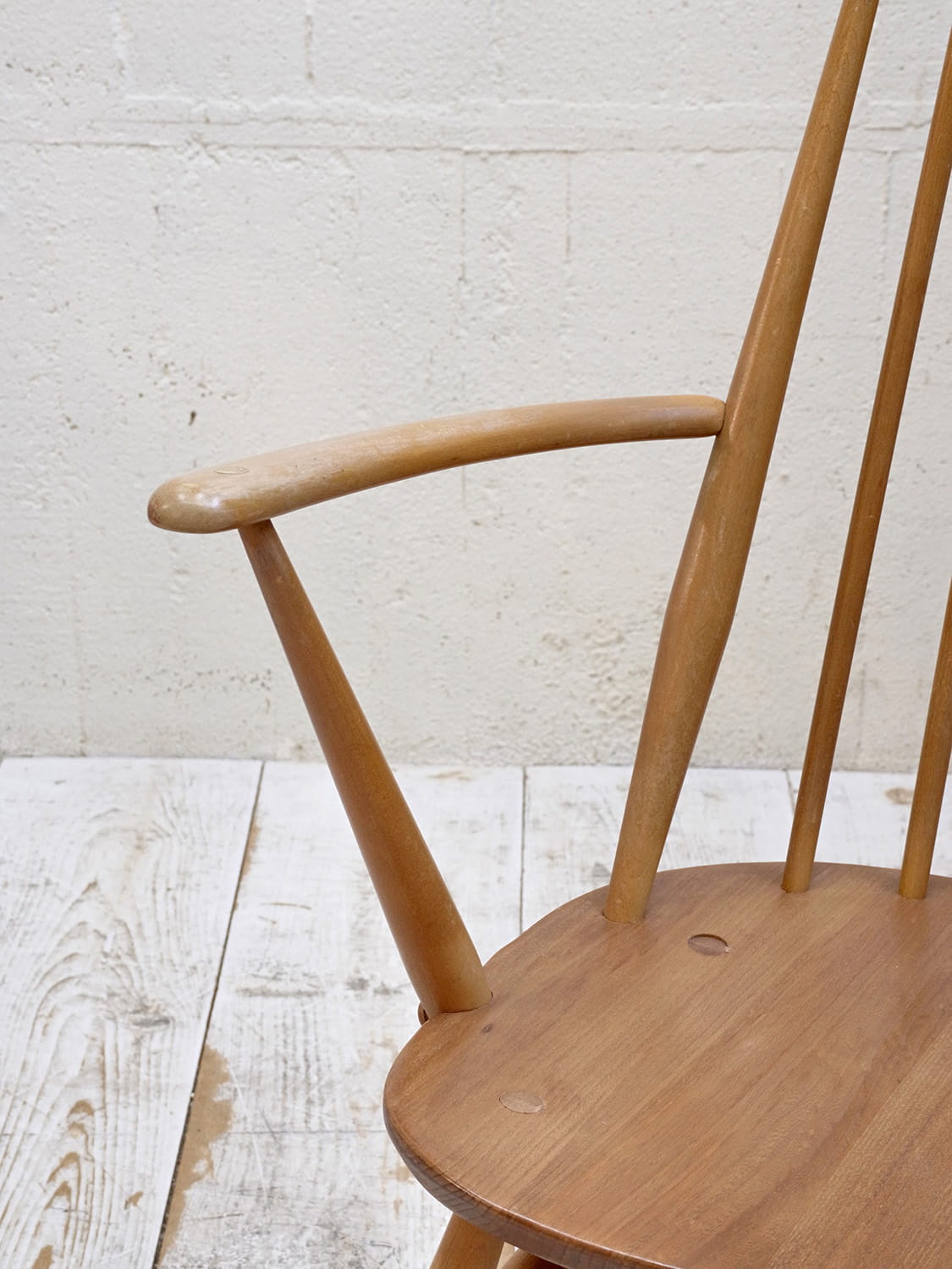 推定1960年代、イギリス製のアーコールチェアです。英国の家具メーカー ERCOL(アーコール社)が 1920年代に製造を始めました。アーコールチェアもベントウッドチェア同様曲木の技術を生かして造られた椅子です。アンティークのアーコールチェアはさまざまなデザインで作られているので、デザインの違うチェアを合わせて楽しむこともできます。こちらの椅子はアーコールチェアの中でも人気のデザインのゴールドスミスチェアです。座面までの高さは41.5cm です。アームまでの高さは67cmです。詳細は右の椅子(1)を撮影しています。アーコール社製品はこちらから。