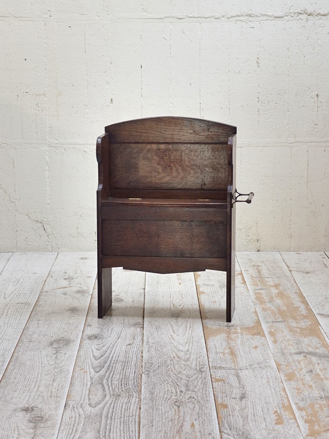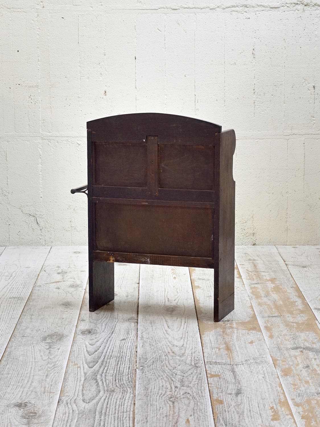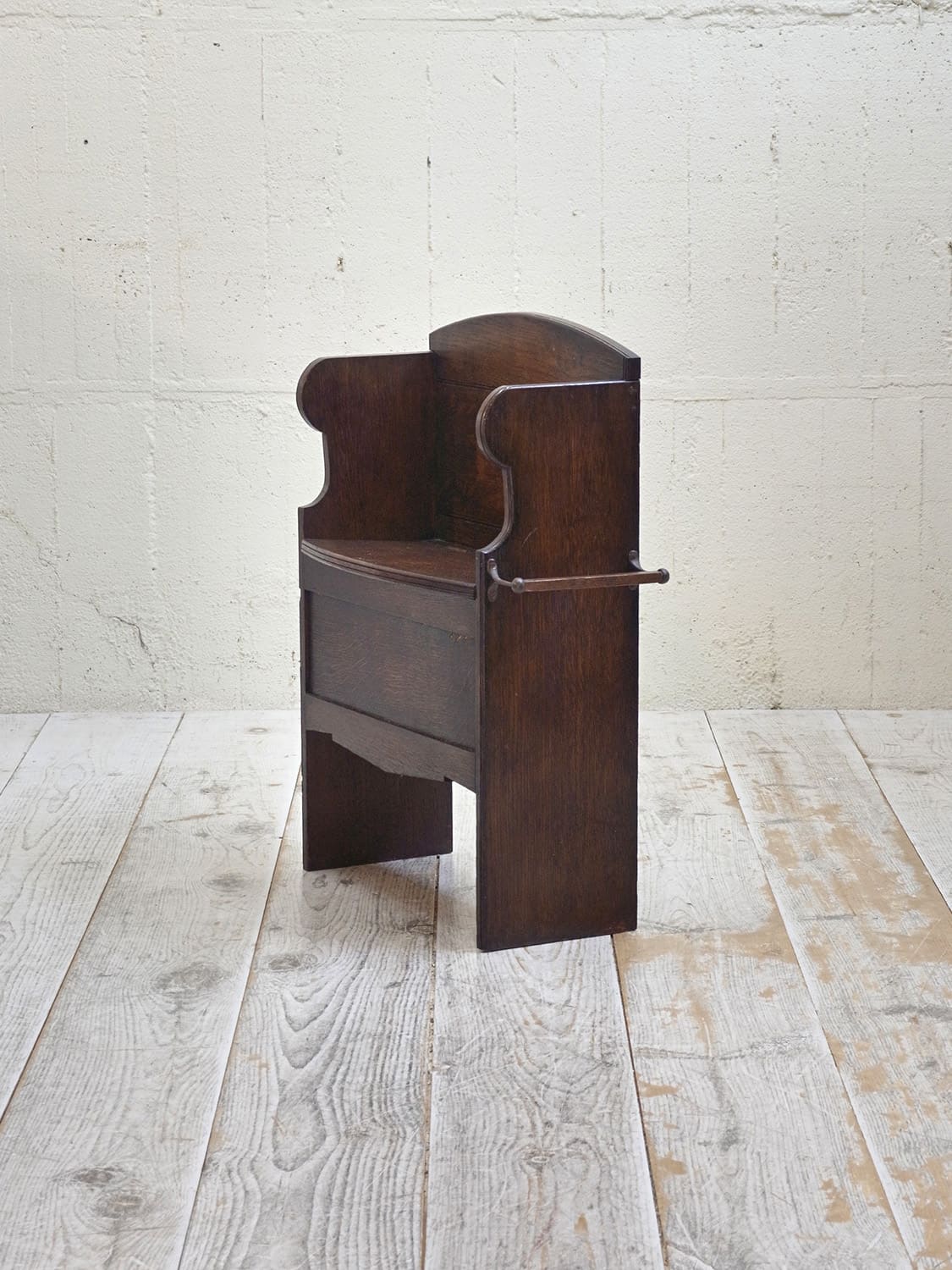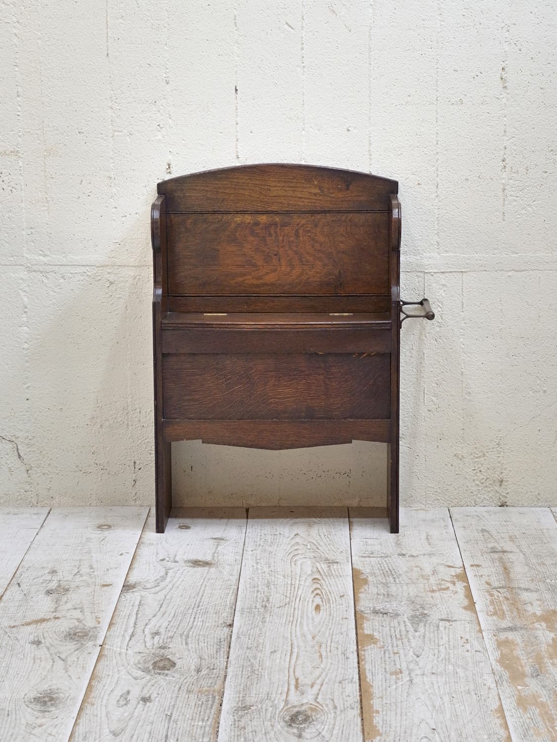 推定1930年代、イギリス製のアンティークオークベンチです。一見座面に収納があり、モンクスベンチのように見えます。その代わり、向かって右側にタオル掛けが付いています。小ぶりなので玄関で靴を履く際の腰掛としてやキッチンでパントリー的な使い方でタオル掛けにキッチンタオルをかけて使用するなど使い方は様々です。座面までの高さは46.5cmです。その他ベンチはこちらから。