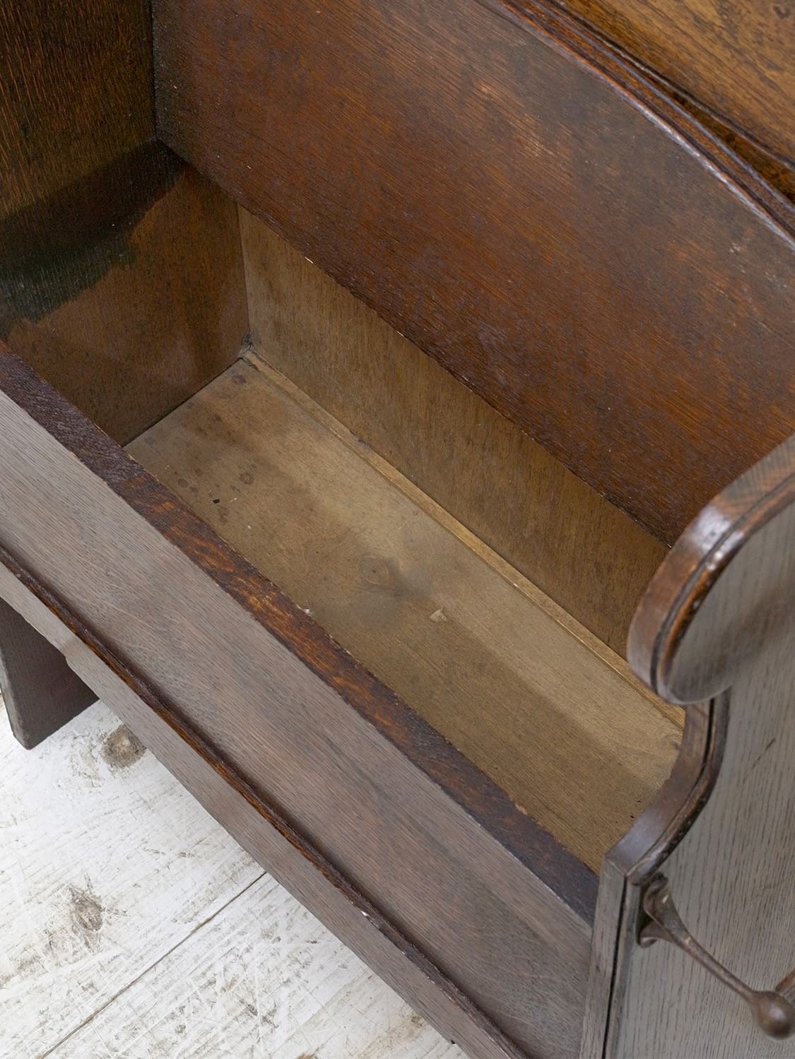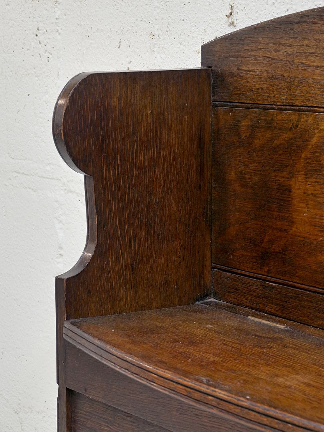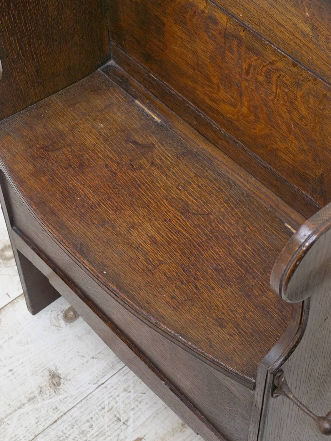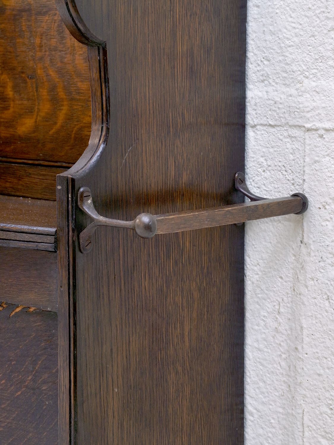 推定1930年代、イギリス製のアンティークオークベンチです。一見座面に収納があり、モンクスベンチのように見えます。その代わり、向かって右側にタオル掛けが付いています。小ぶりなので玄関で靴を履く際の腰掛としてやキッチンでパントリー的な使い方でタオル掛けにキッチンタオルをかけて使用するなど使い方は様々です。座面までの高さは46.5cmです。その他ベンチはこちらから。