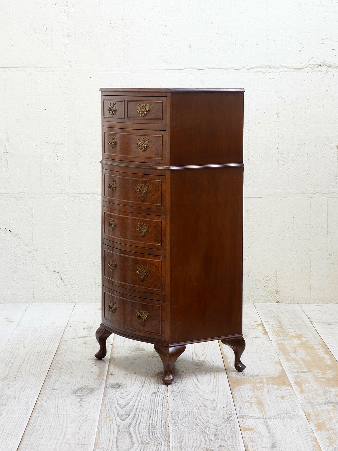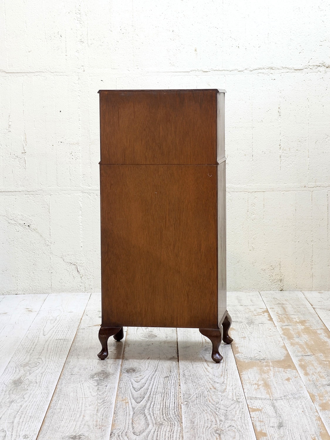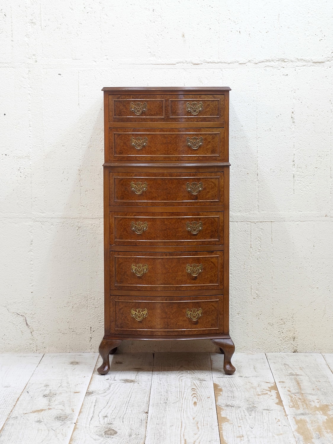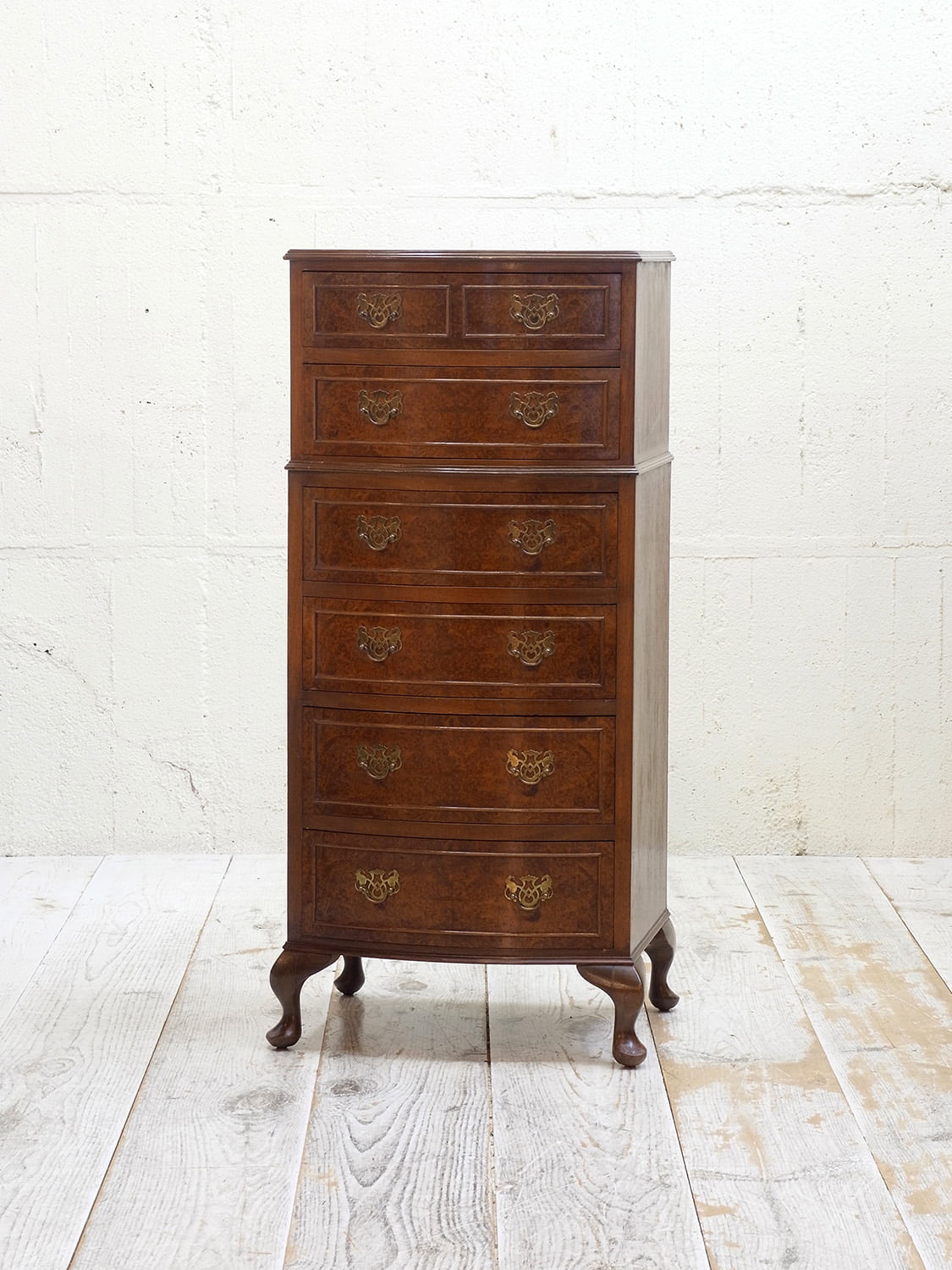 推定1940年代、イギリス製のウォルナットチェストです。イギリスの上流階級で好まれたウォルナットの化粧板を使った優雅で上質なチェストです。6杯も引き出しがありコンパクトながら収納量豊富です。1番上の段は左右に引き出しがあるような作りですが、2段目同様1杯です。リビングやベッドルームなどどこにでも置いて見栄える家具です。イギリスでは「トールボーイ」や「チェストオンチェスト」という愛称で親しまれています。引き出し内寸 W398 D315 上 H83H105/H108 H108/H128/H128mm。その他、チェストはこちらから。