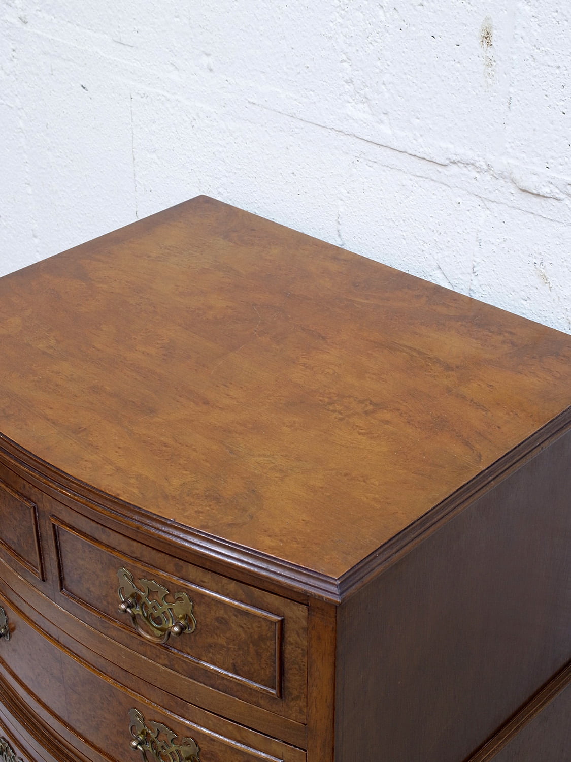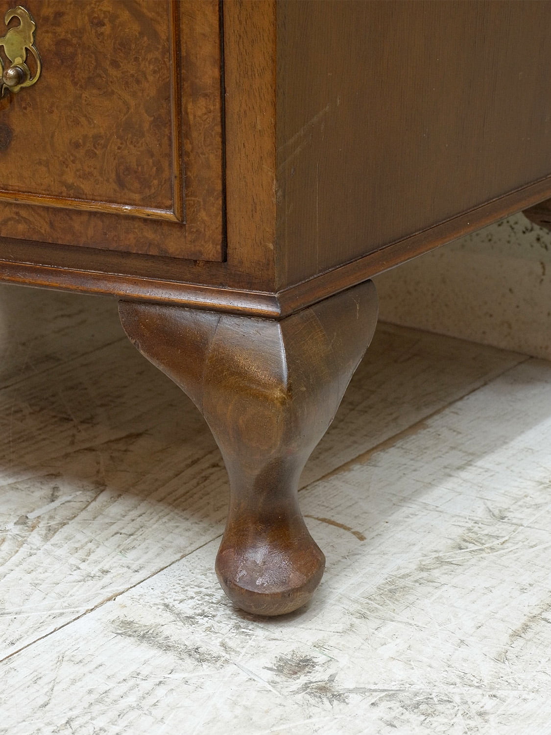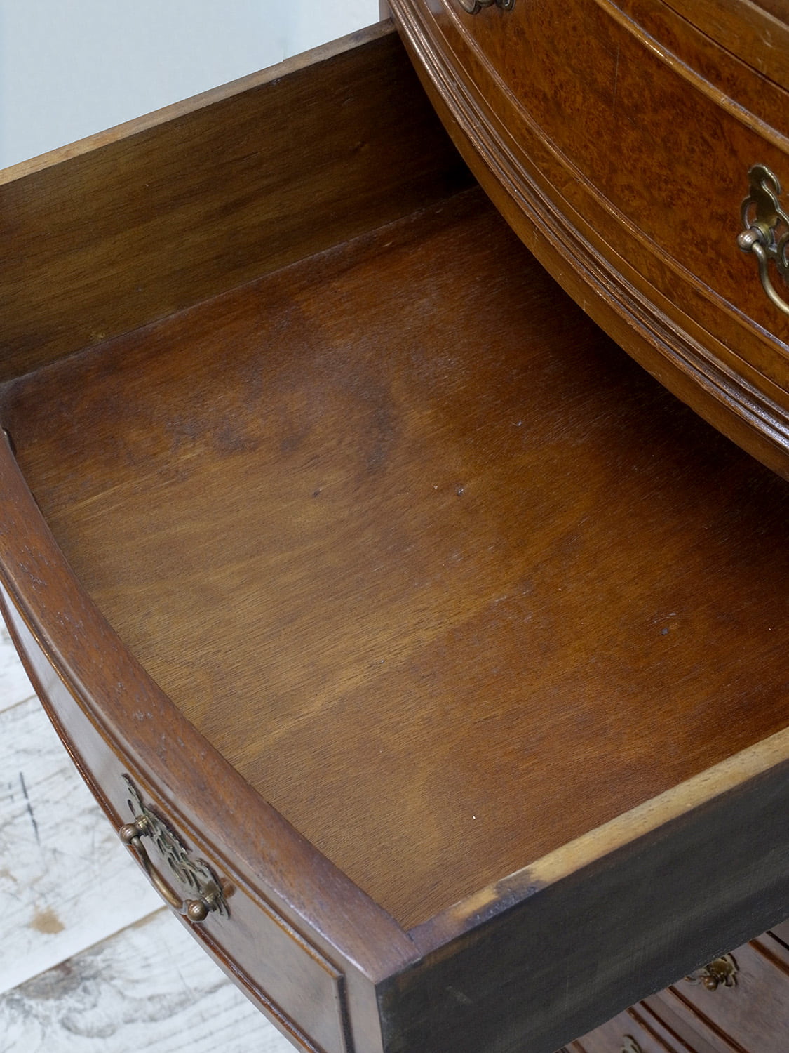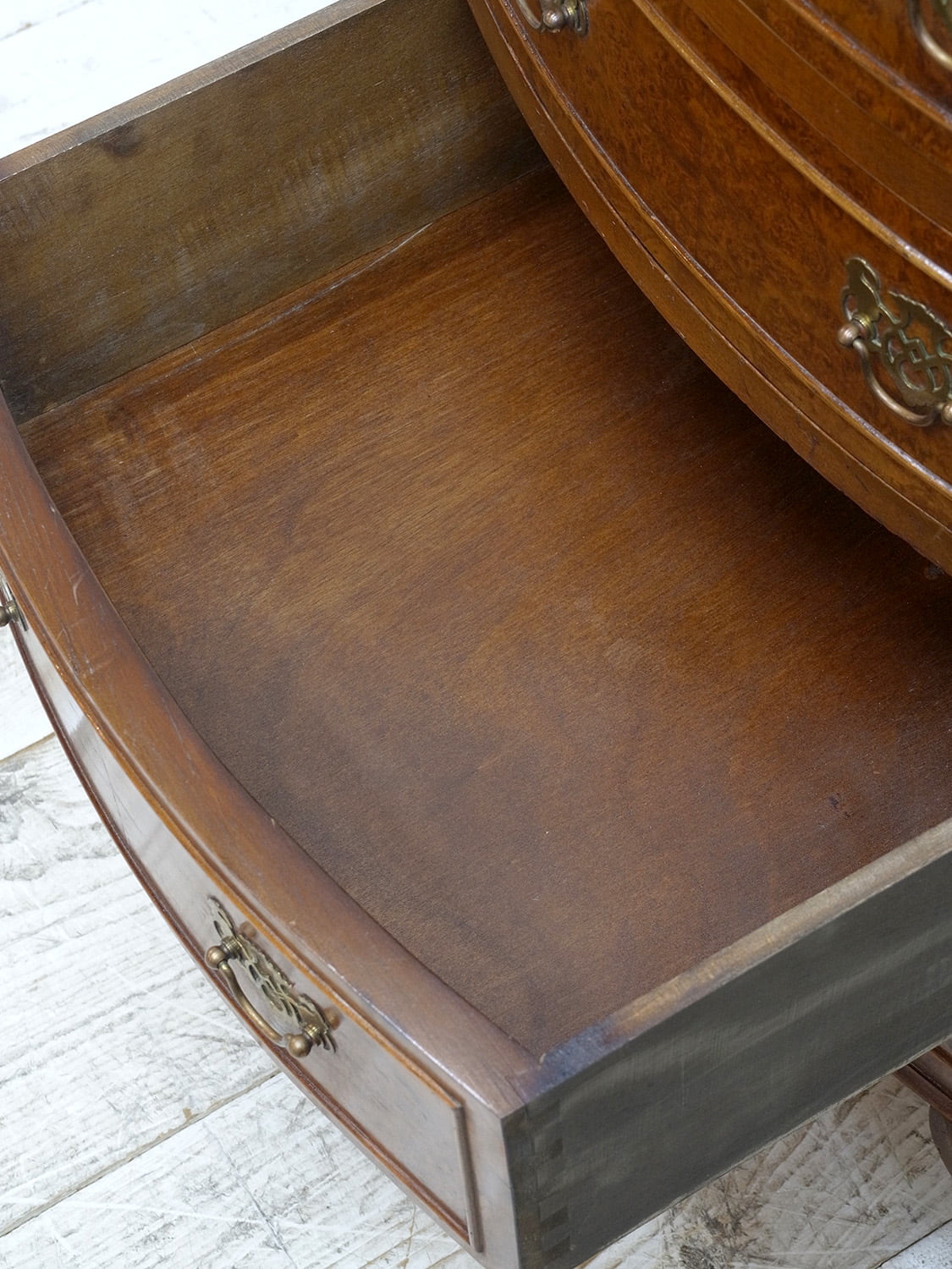 推定1940年代、イギリス製のウォルナットチェストです。イギリスの上流階級で好まれたウォルナットの化粧板を使った優雅で上質なチェストです。6杯も引き出しがありコンパクトながら収納量豊富です。1番上の段は左右に引き出しがあるような作りですが、2段目同様1杯です。リビングやベッドルームなどどこにでも置いて見栄える家具です。イギリスでは「トールボーイ」や「チェストオンチェスト」という愛称で親しまれています。引き出し内寸 W398 D315 上 H83H105/H108 H108/H128/H128mm。その他、チェストはこちらから。