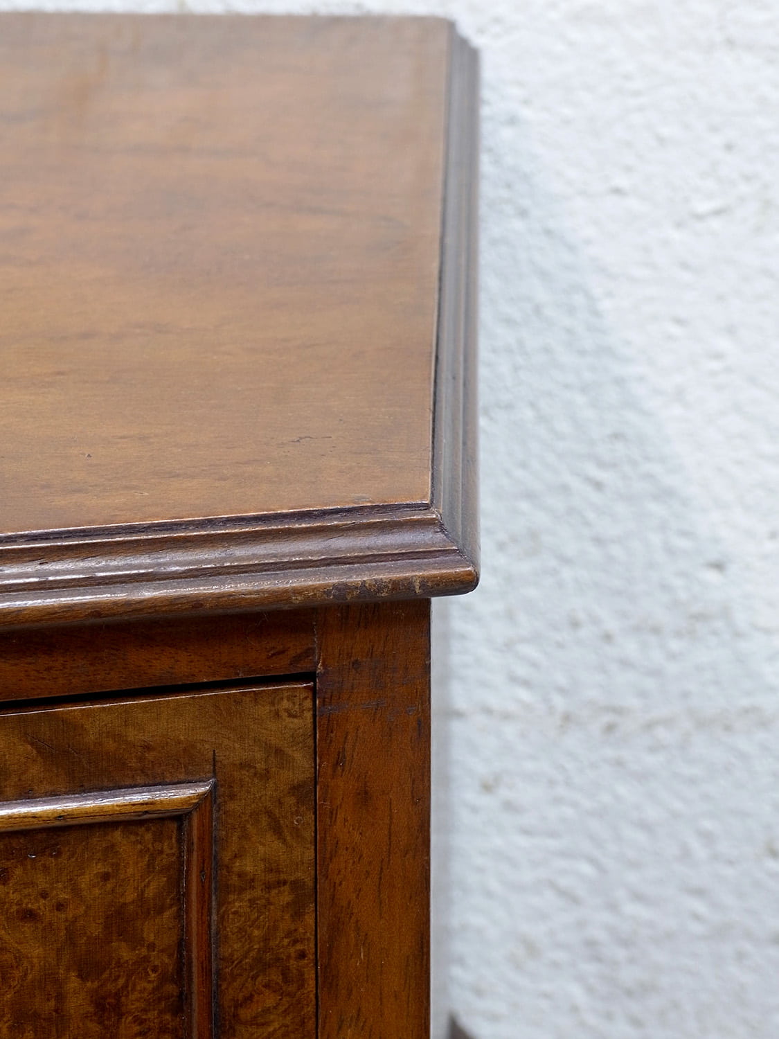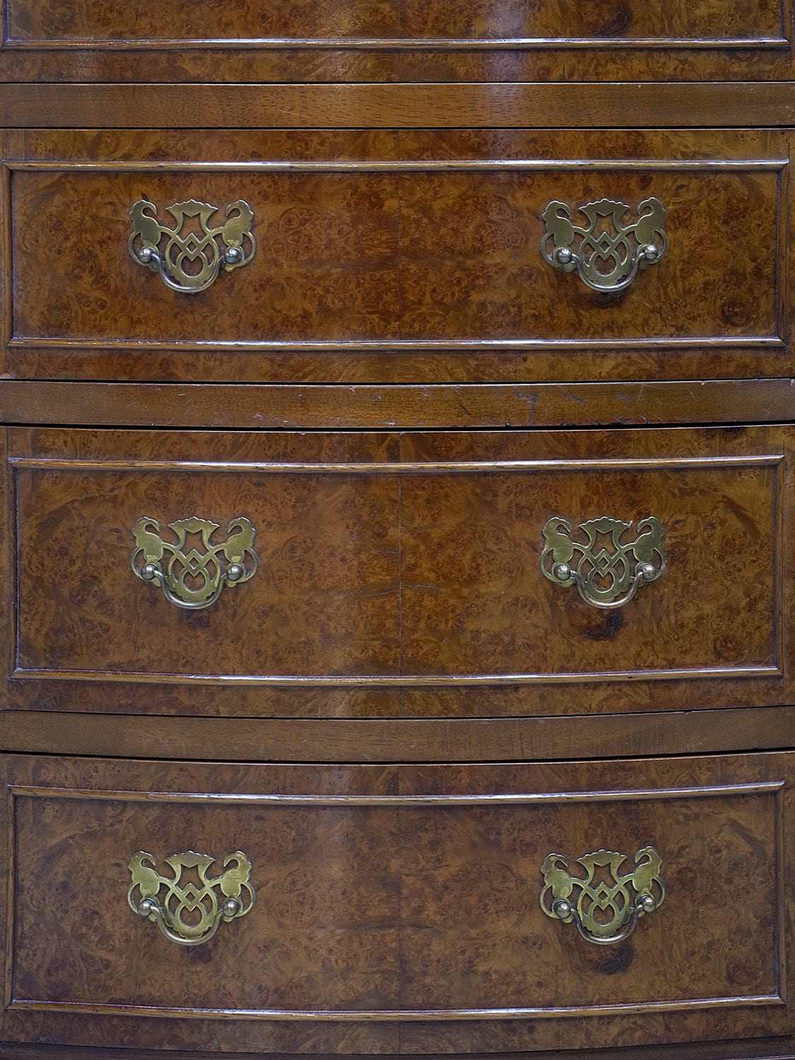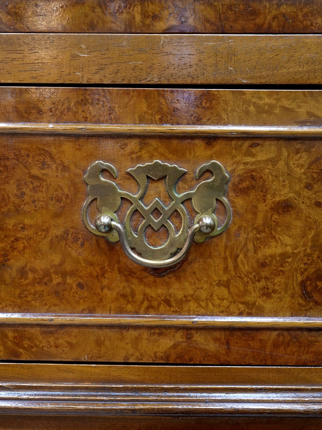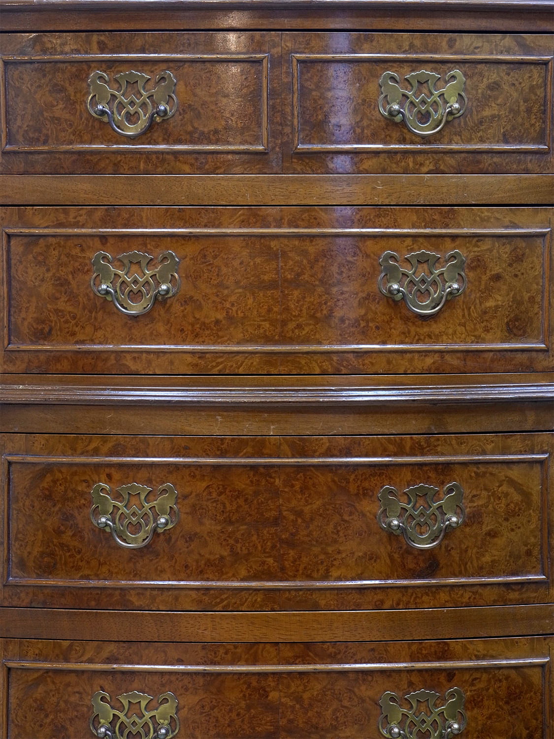 推定1940年代、イギリス製のウォルナットチェストです。イギリスの上流階級で好まれたウォルナットの化粧板を使った優雅で上質なチェストです。6杯も引き出しがありコンパクトながら収納量豊富です。1番上の段は左右に引き出しがあるような作りですが、2段目同様1杯です。リビングやベッドルームなどどこにでも置いて見栄える家具です。イギリスでは「トールボーイ」や「チェストオンチェスト」という愛称で親しまれています。引き出し内寸 W398 D315 上 H83H105/H108 H108/H128/H128mm。その他、チェストはこちらから。