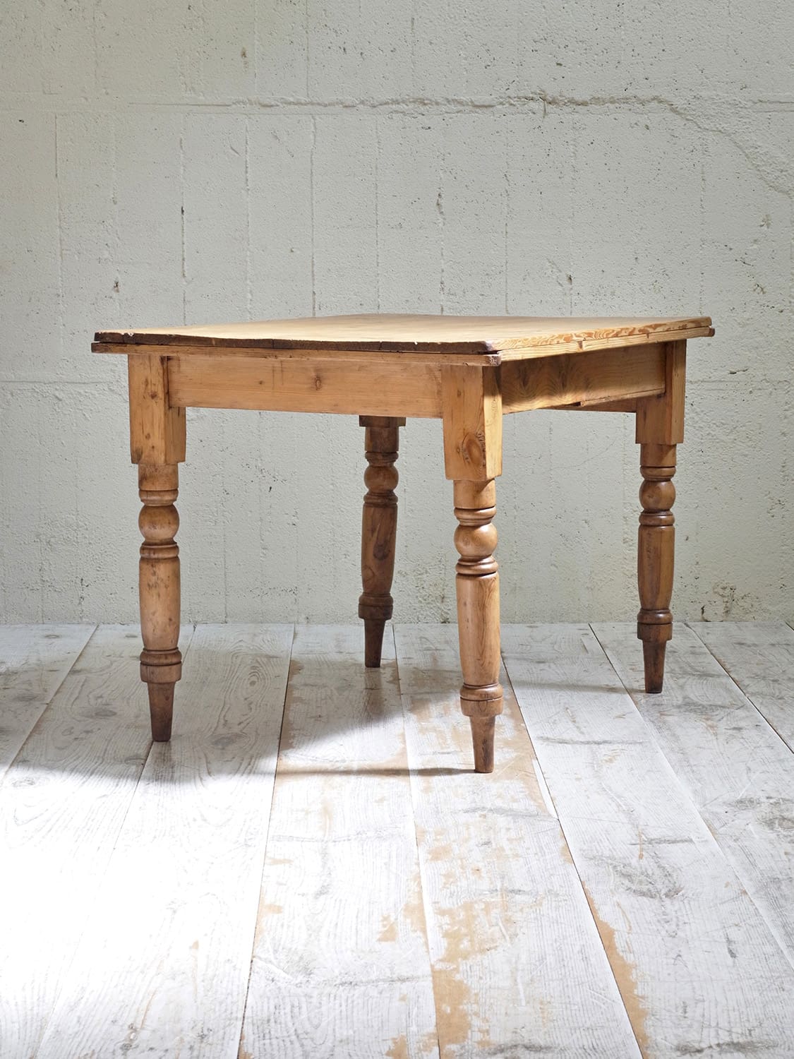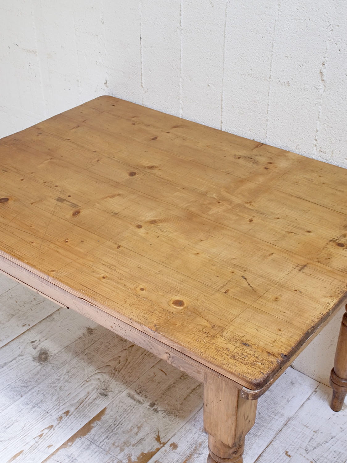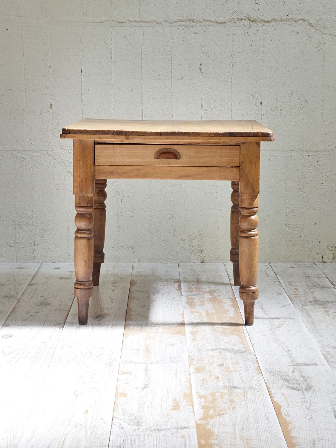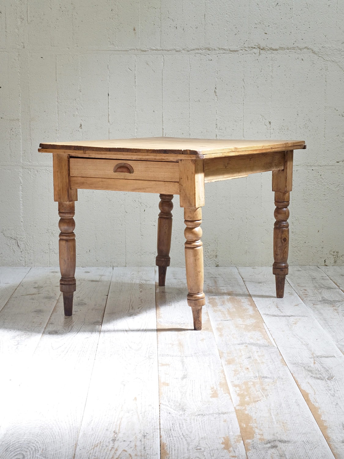 推定1930年代、イギリス製のアンティークパインテーブルです。2人掛けのダイニングテーブルとしておすすめです。小ぶりながらお皿も問題なく置けるサイズ感です。引き出しもカトラリーやランチョンマットなどの収納に最適です。ヴィクトリアンレッグと呼ばれる脚が特徴的で、これぞ王道のアンティークパインのテーブルです。シェルノブも可愛らしいです。引き出しサイズ W500 D370 H57mm。その他パインテーブルはこちらから。