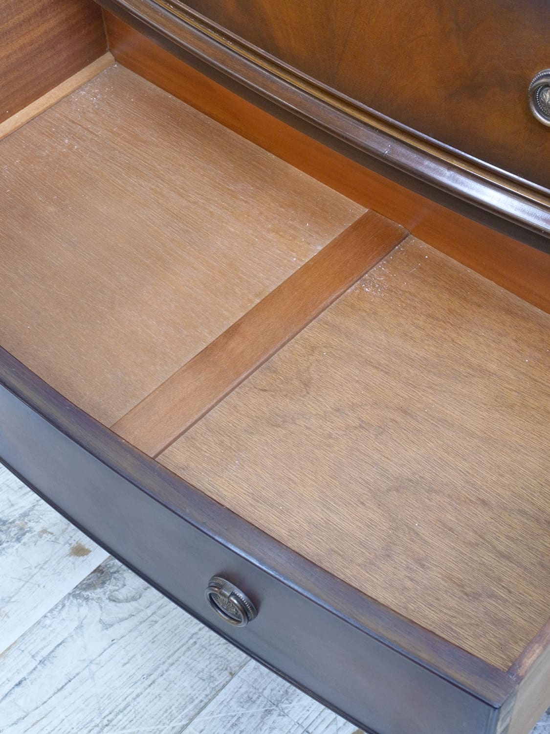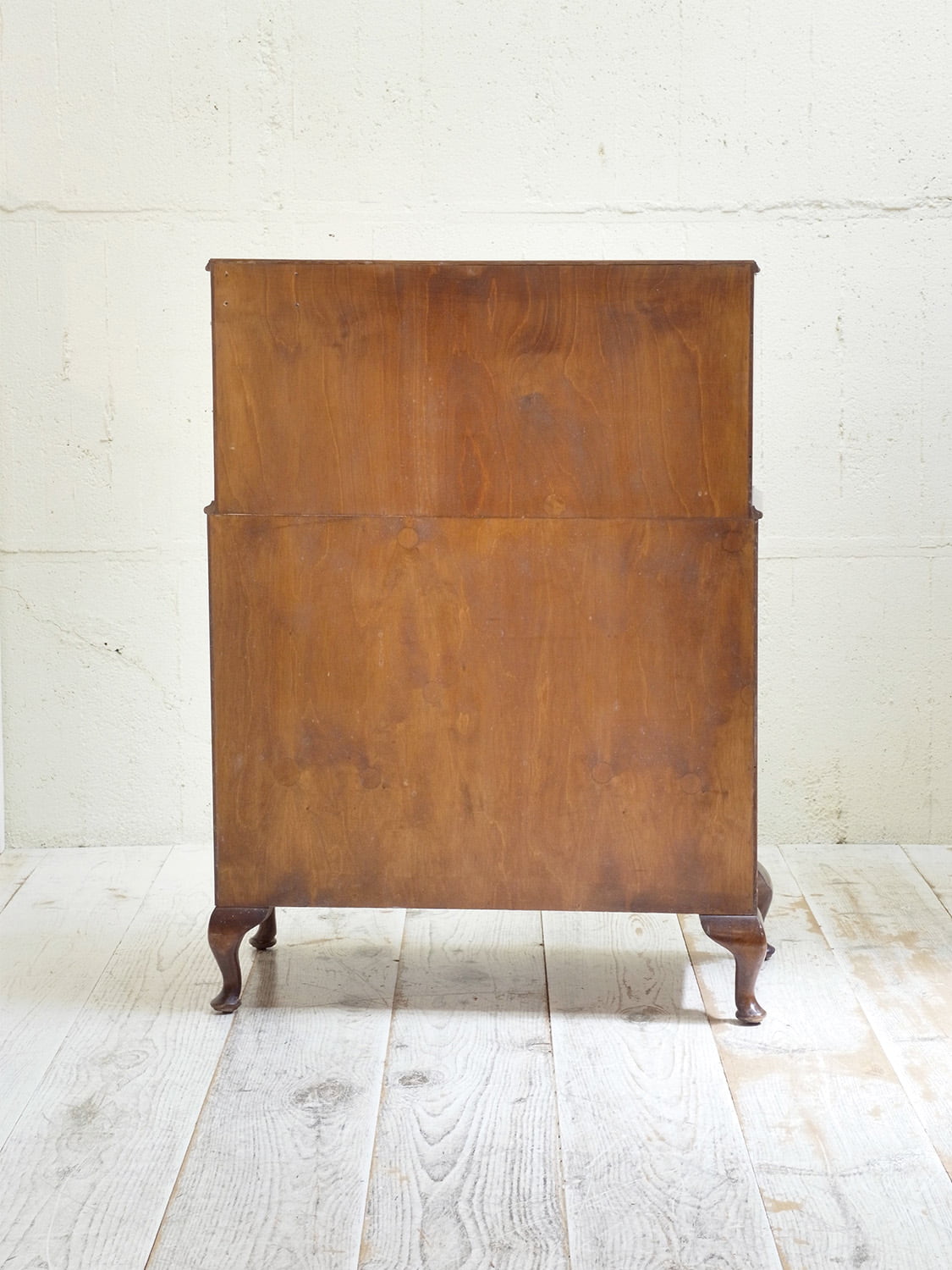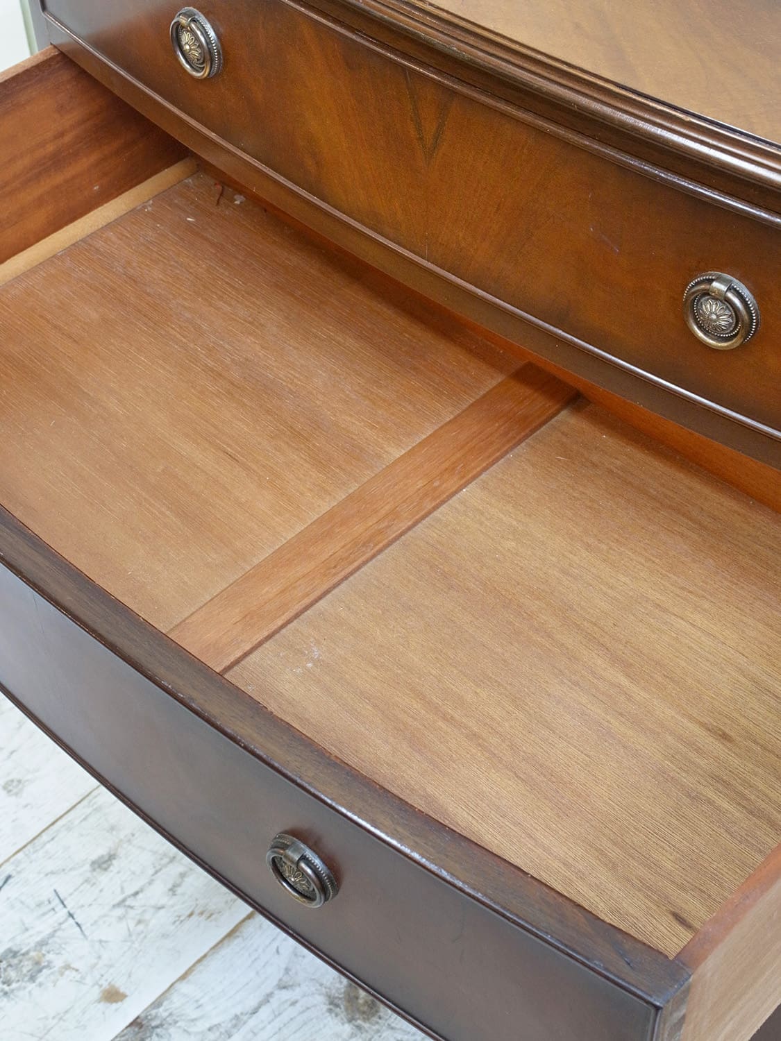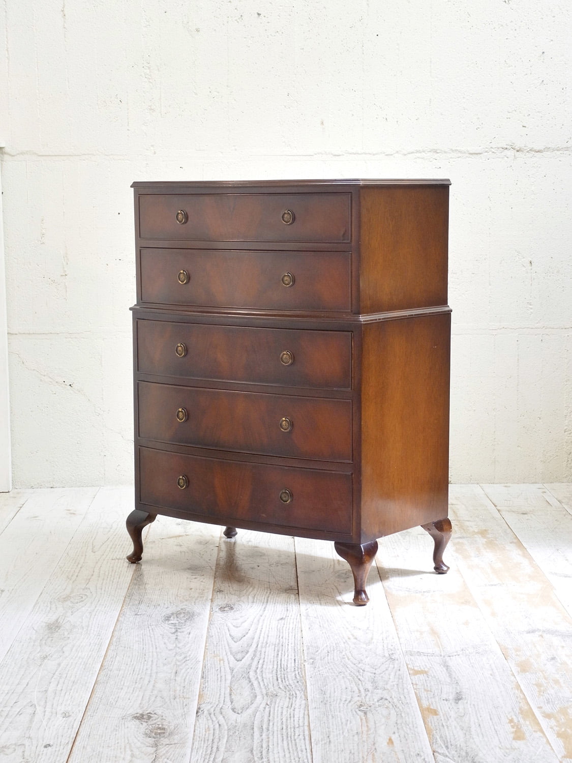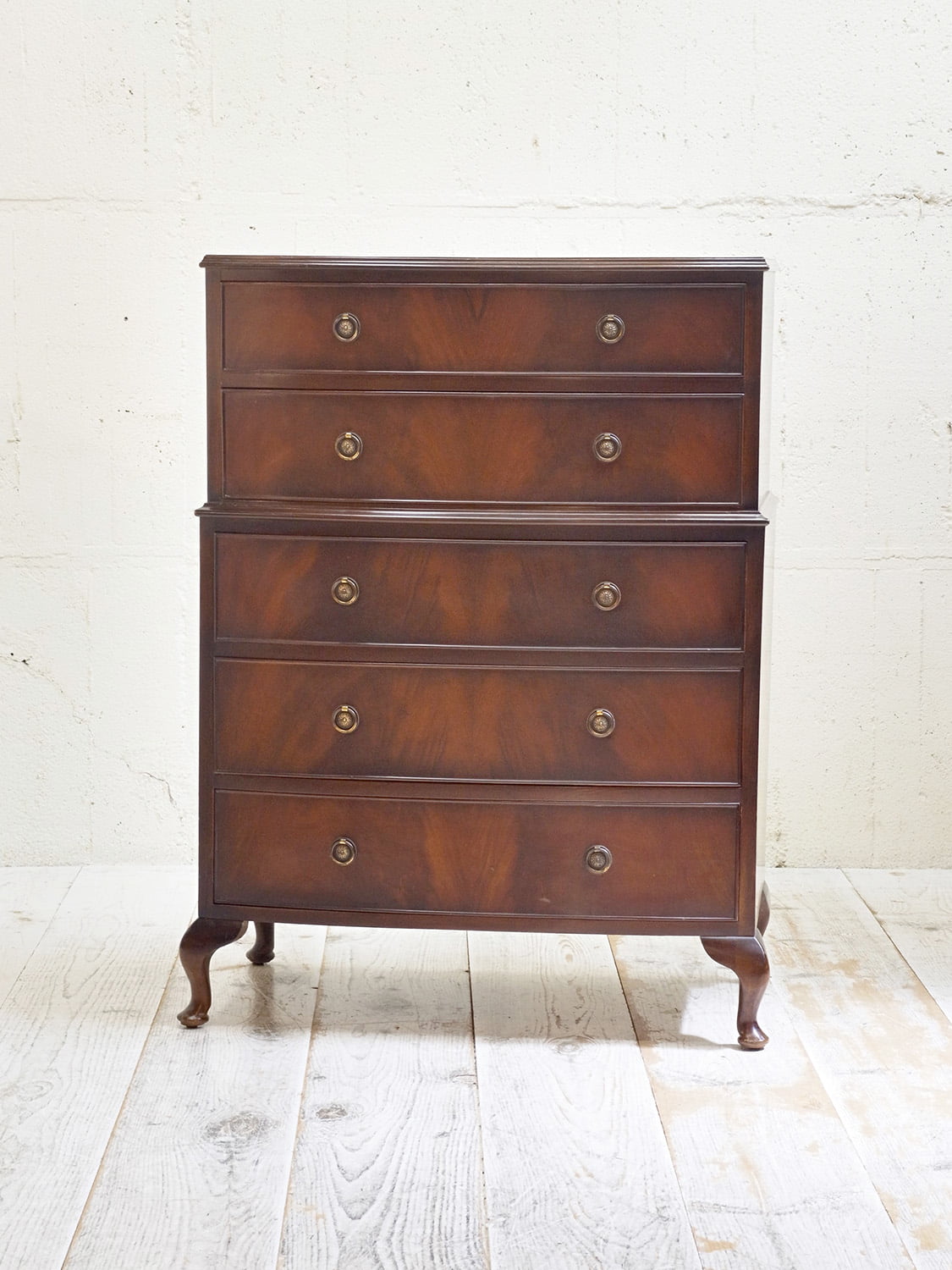 推定1940年代、イギリス製のアンティークマホガニーチェストです。チェストが2つ重なったような作りのこちらのチェストは別名トールボーイとも呼ばれています。通常タイプより横幅がありますが、高さがないので圧迫感があまりなく、マホガニー材の上質なデザインでワンランクアップしたお部屋にしてくれます。引き出し内寸 上 W684 D368 H109/135mm 下 W700 D365 H130/H146/H146mm。その他マホガニーチェストはこちらから。