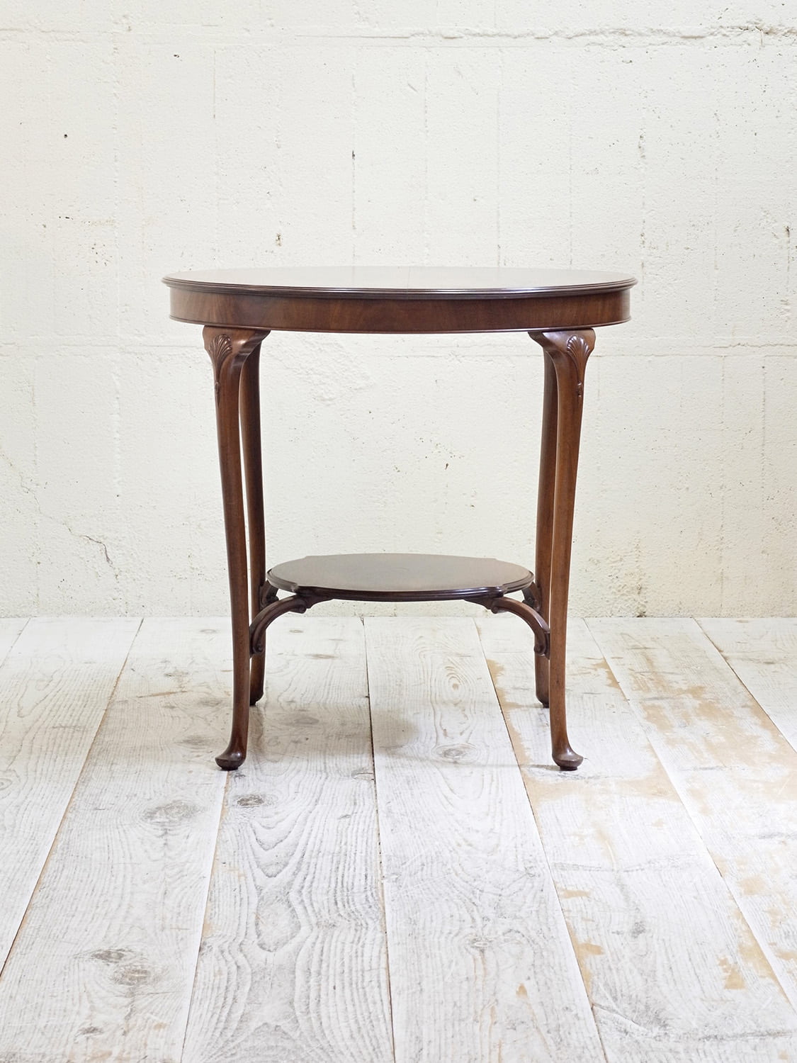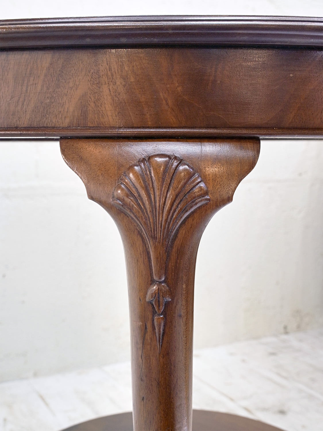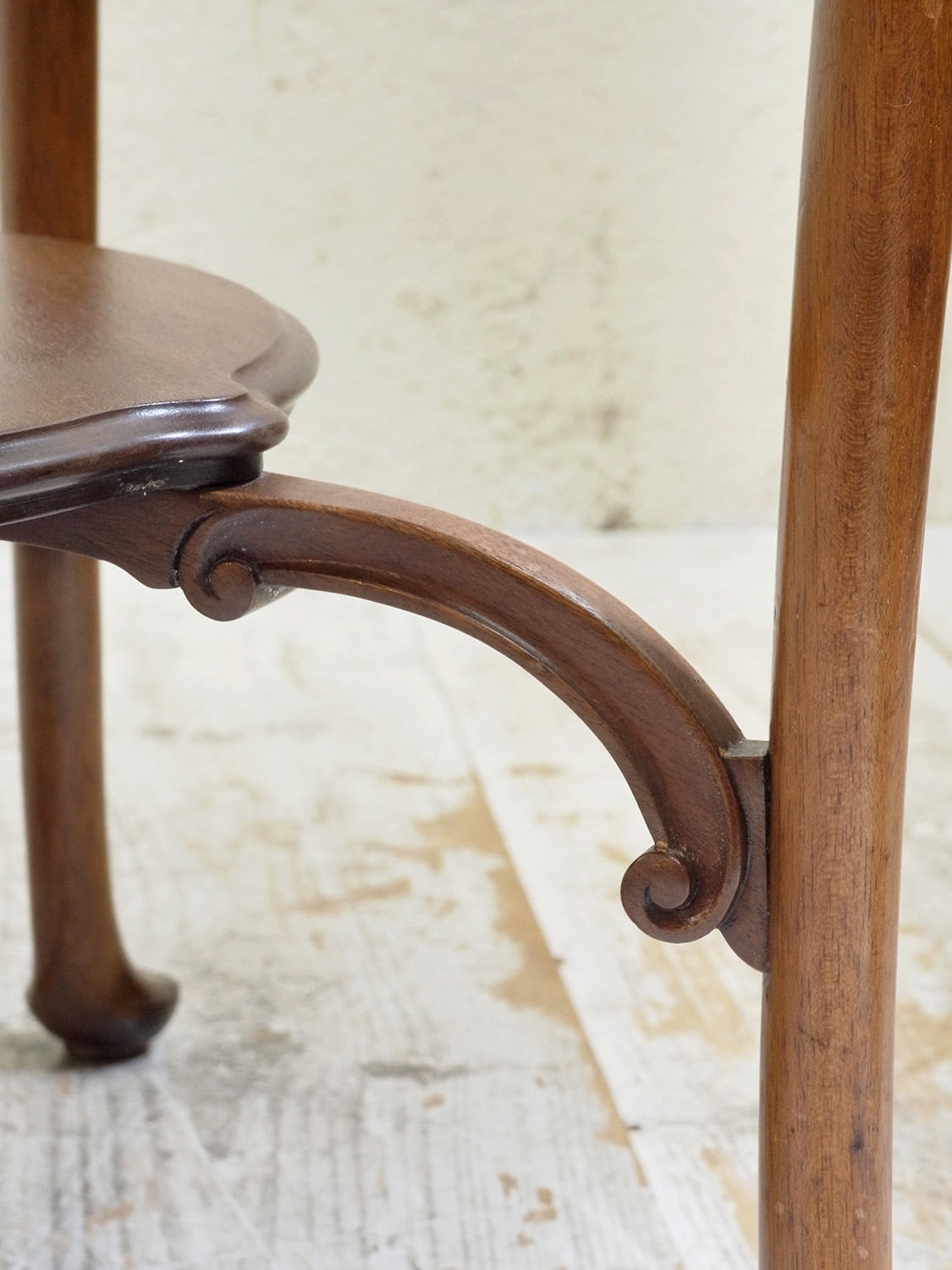 推定1920年代、イギリス製のアンティークマホガニーウィンドウテーブルです。デザイン性の高い上質なマホガニー材で作られています。実用というよりは玄関ホールや名前の通りウィンドウの傍で花台などの魅せる家具としてのご使用がおすすめです。置くだけで映える家具です。下台サイズ W432 D432 天板下からの高さ430mm。その他サイドテーブルはこちらから。