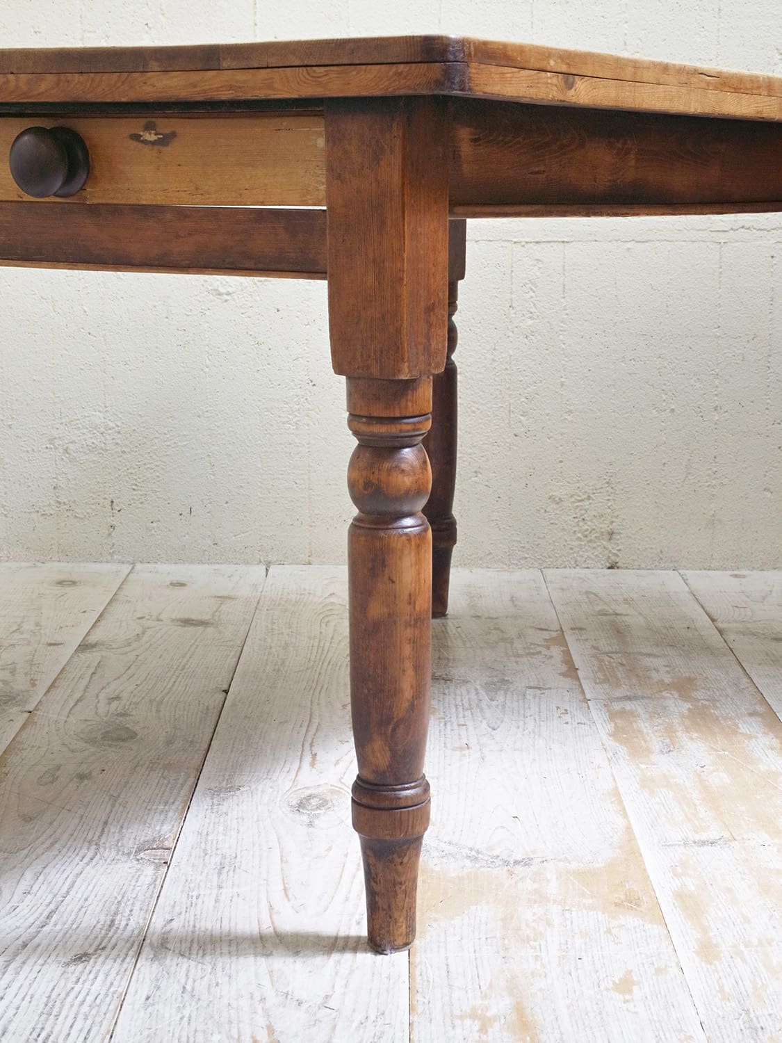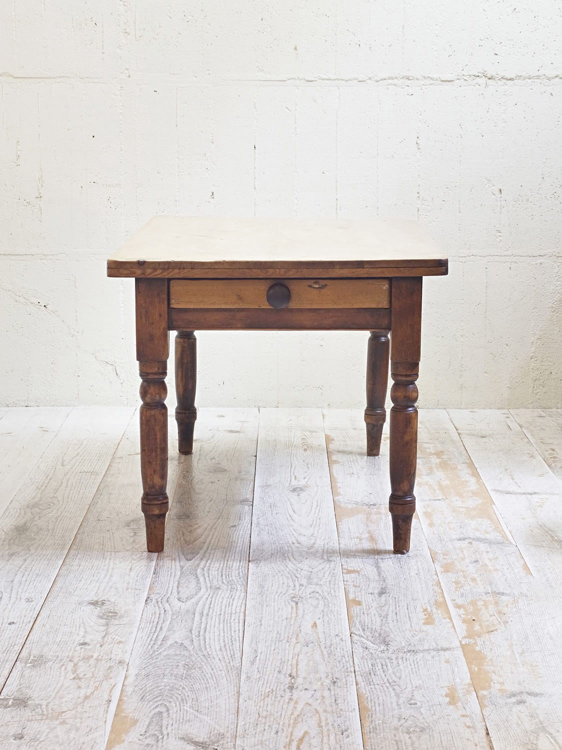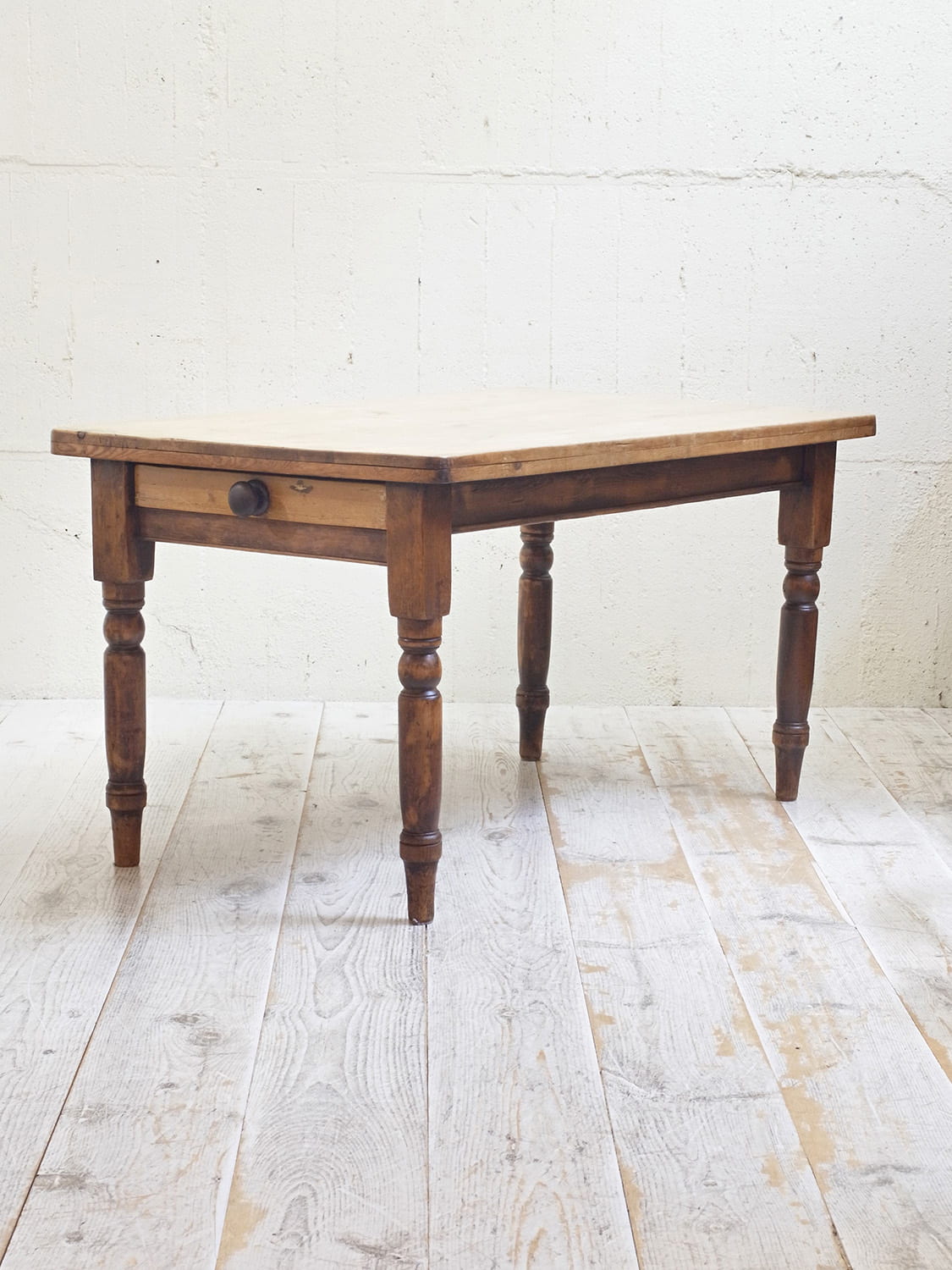 推定1930年代、イギリスのアンティークパインテーブルです。天板と脚の色が異なるテーブルで2人~4人のダイニングテーブルとしてのご使用がおすすめです。とても人気のあるサイズ感です。パイン材のきれいな天板がとても印象的です。天板の角がアールになっているので小さいお子さんがいるご家庭でも安心してご使用いただけます。引き出しサイズ W495 D355 H57mm。その他パインテーブルはこちらから。