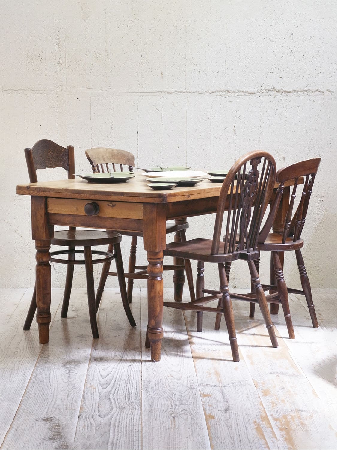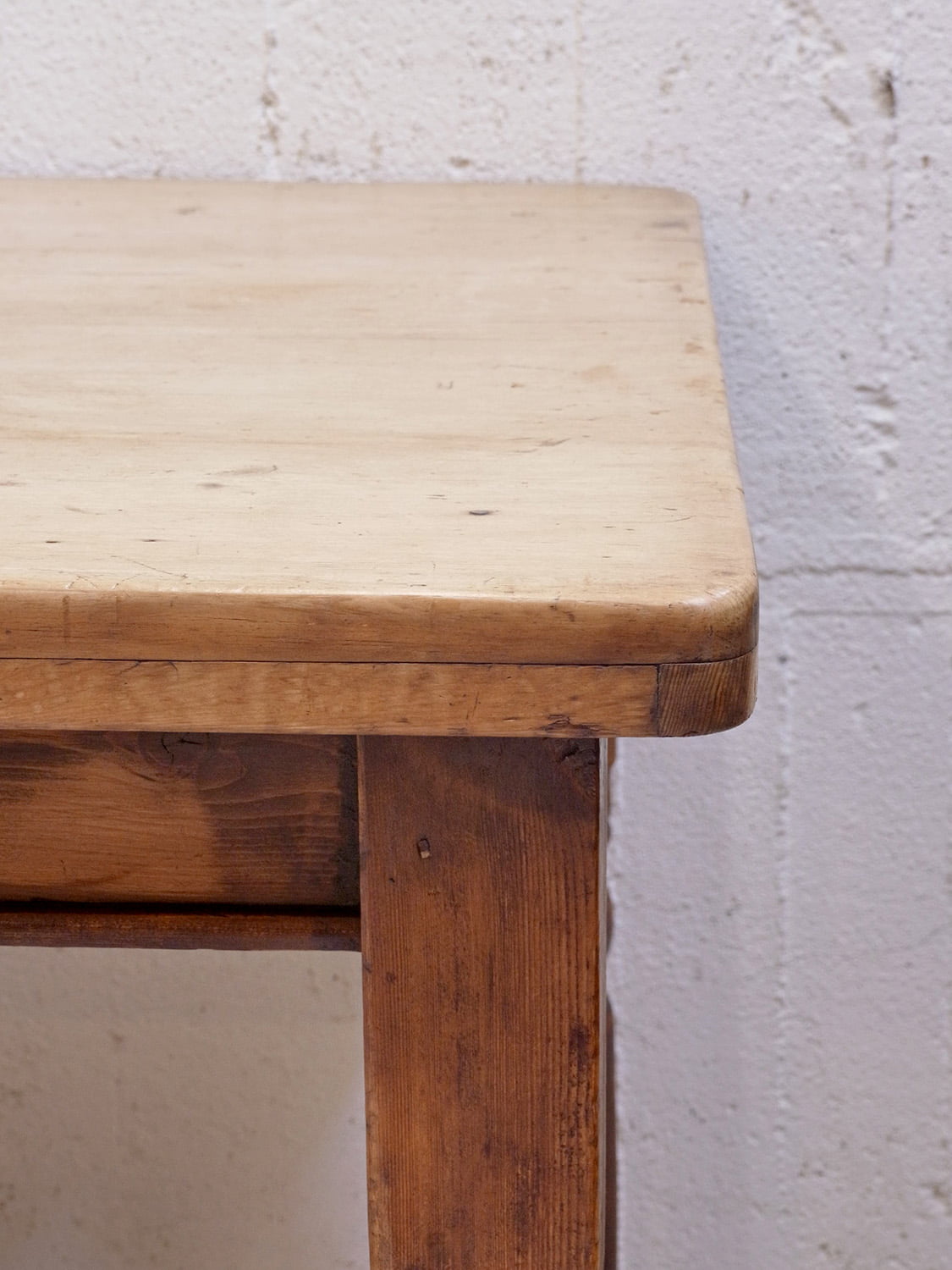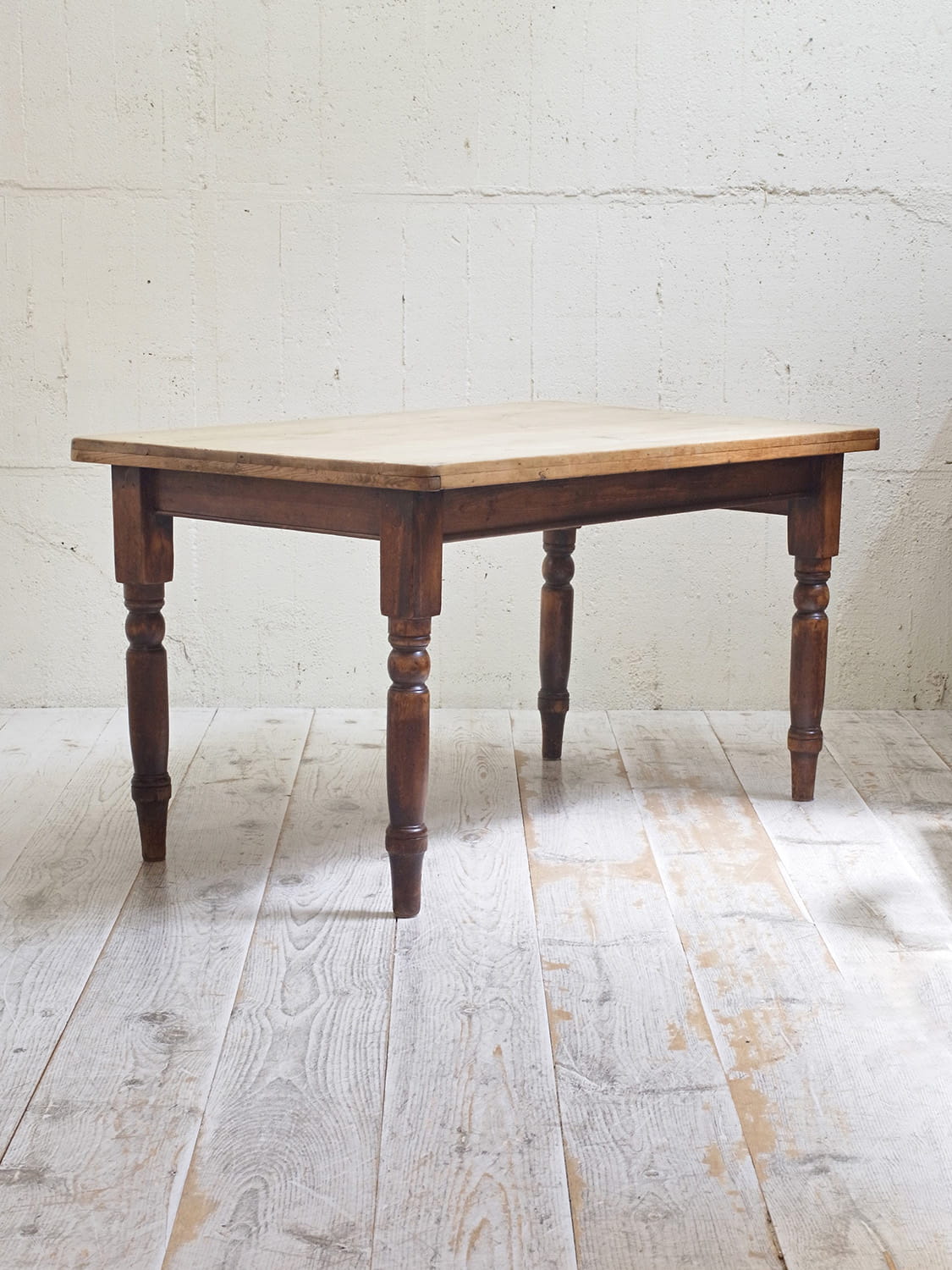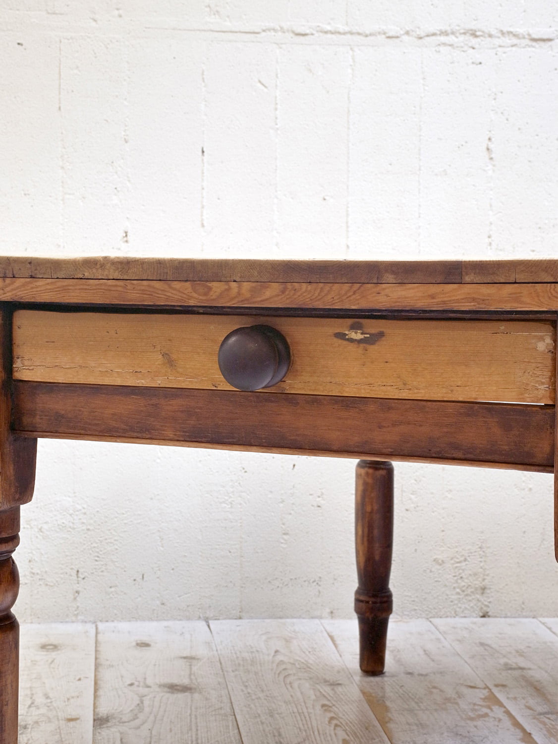 推定1930年代、イギリスのアンティークパインテーブルです。天板と脚の色が異なるテーブルで2人~4人のダイニングテーブルとしてのご使用がおすすめです。とても人気のあるサイズ感です。パイン材のきれいな天板がとても印象的です。天板の角がアールになっているので小さいお子さんがいるご家庭でも安心してご使用いただけます。引き出しサイズ W495 D355 H57mm。その他パインテーブルはこちらから。