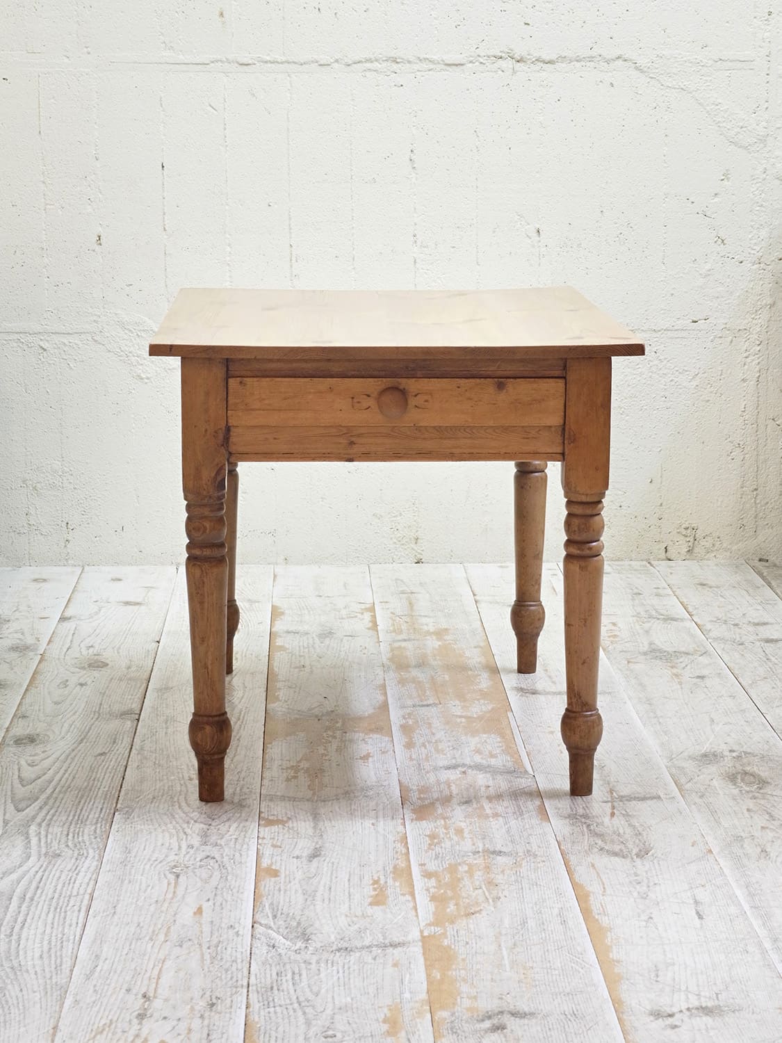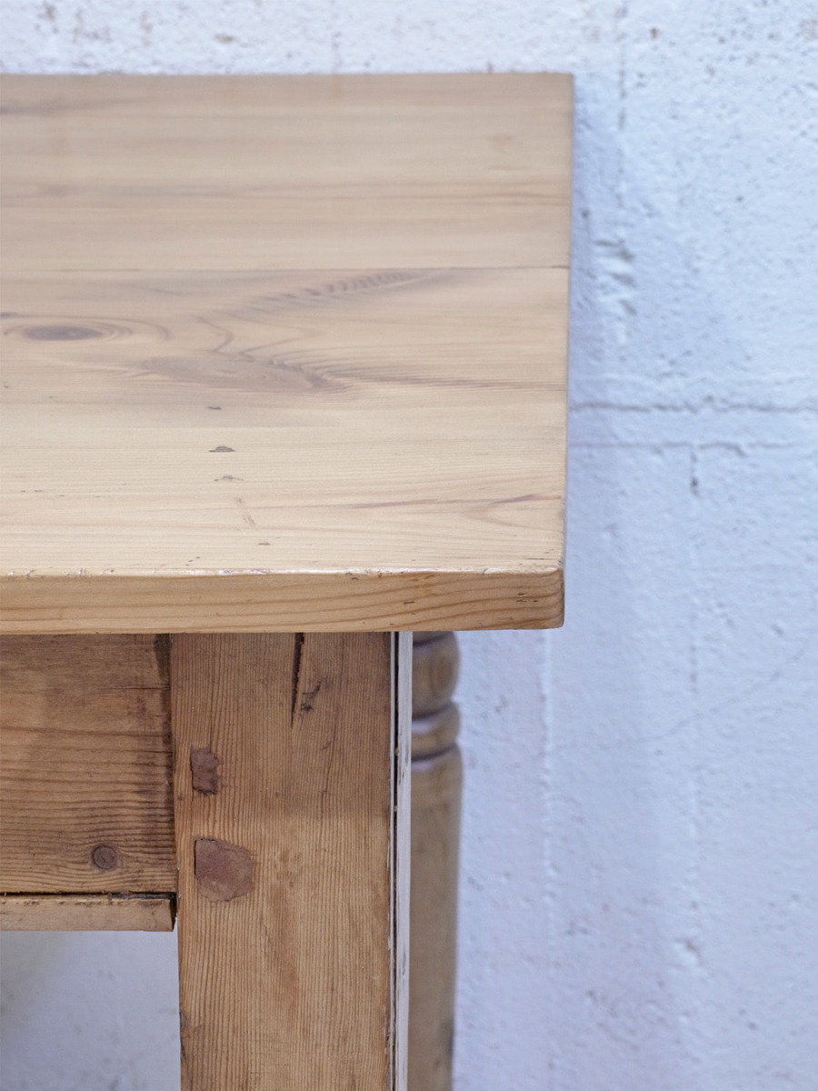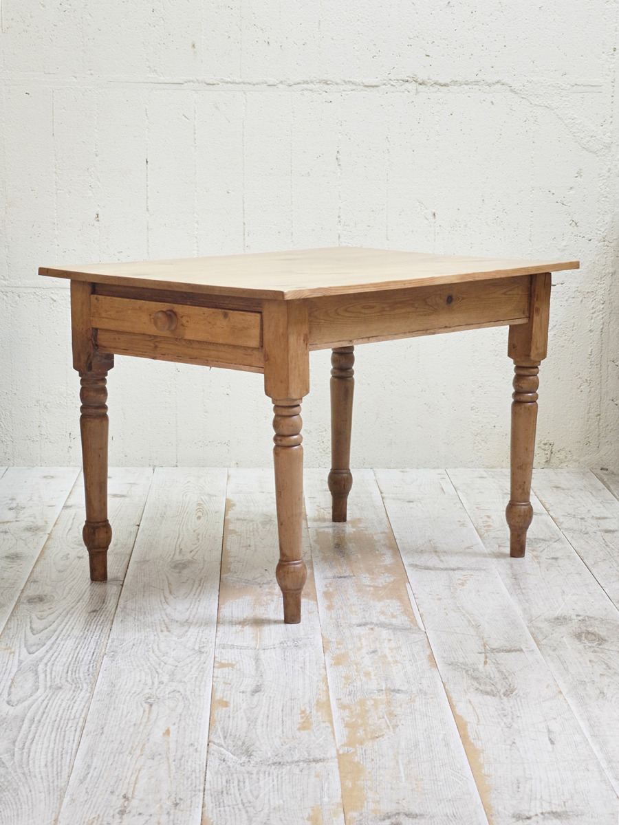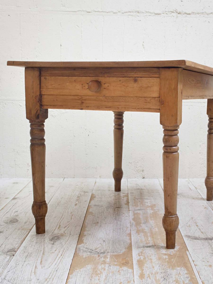 推定1930年代、イギリス製のアンティークパインテーブルです。2人掛けのダイニングテーブルとしておすすめです。小ぶりながらお皿も問題なく置けるサイズ感です。引き出しもカトラリーやランチョンマットなどの収納に最適です。これぞ王道のアンティークパインのテーブルです。引き出しサイズ W498 D385 H59mm。その他パインテーブルはこちらから。