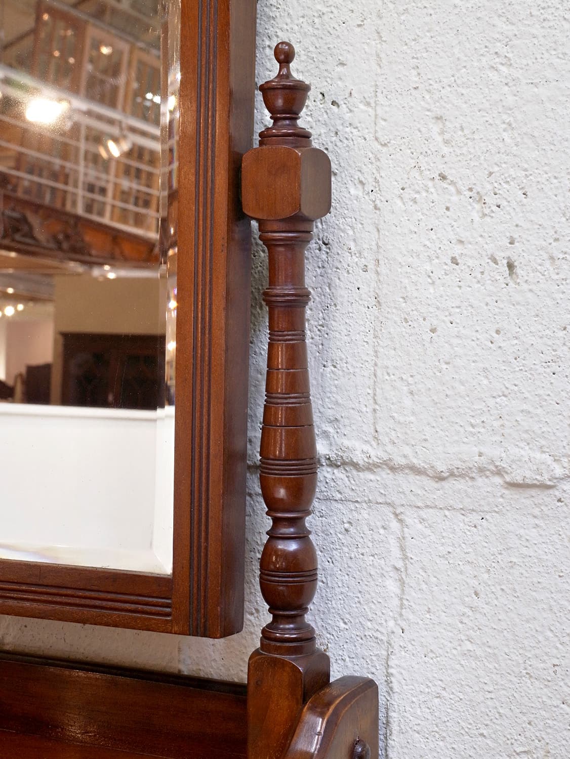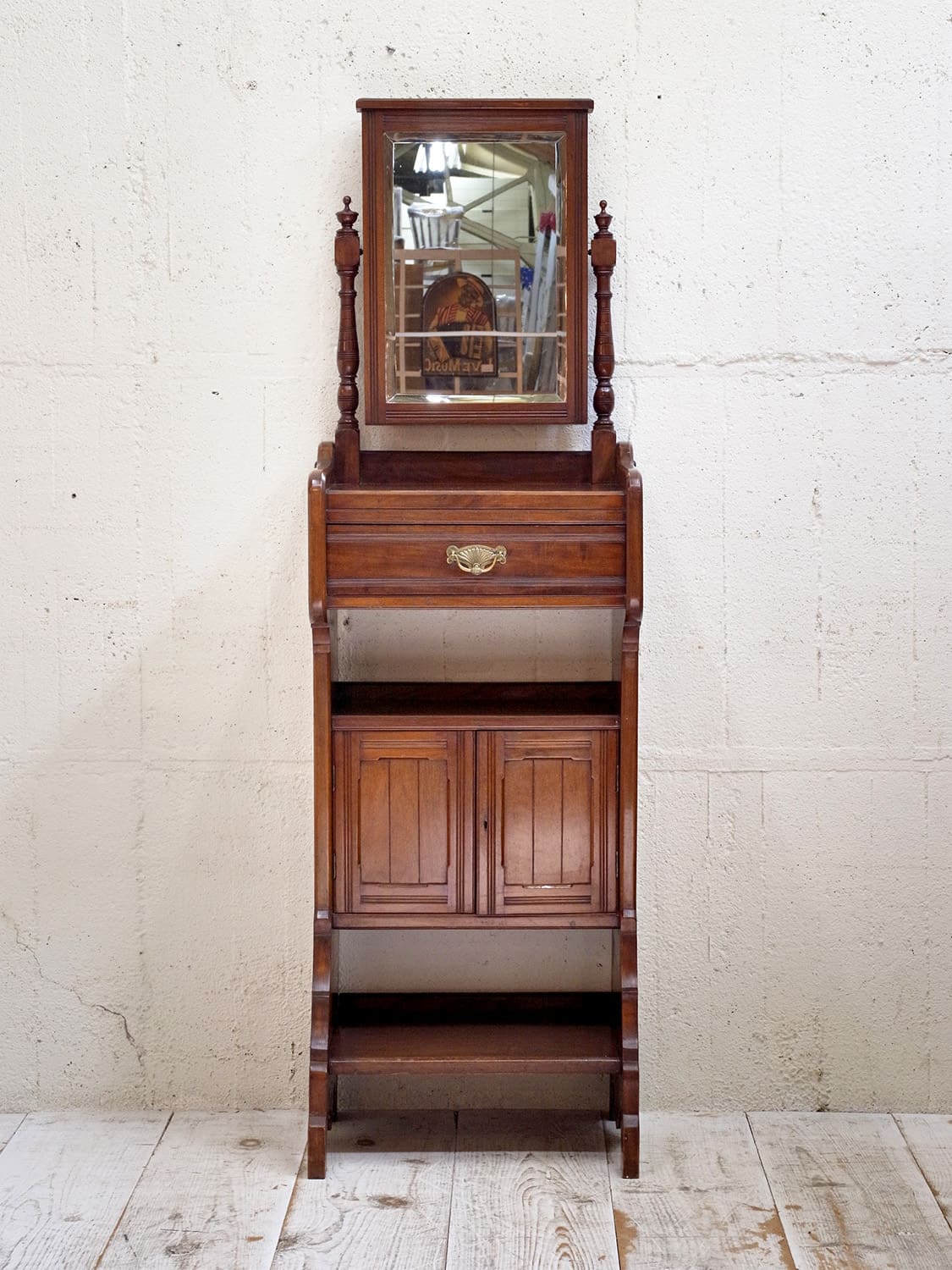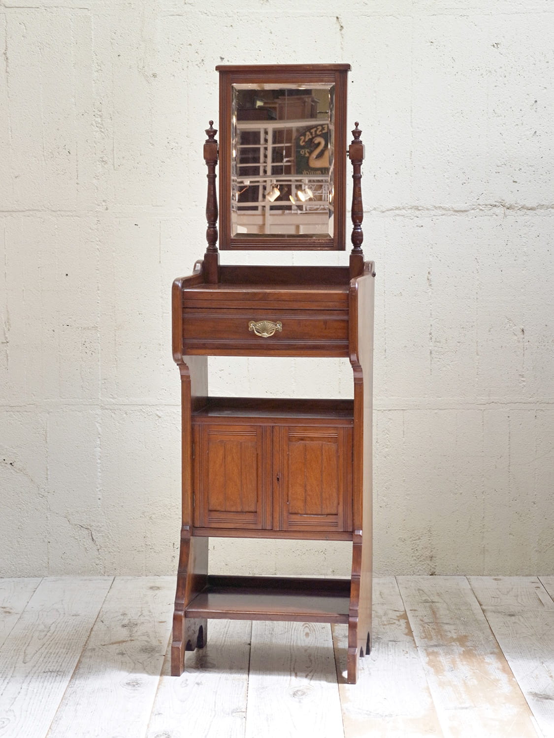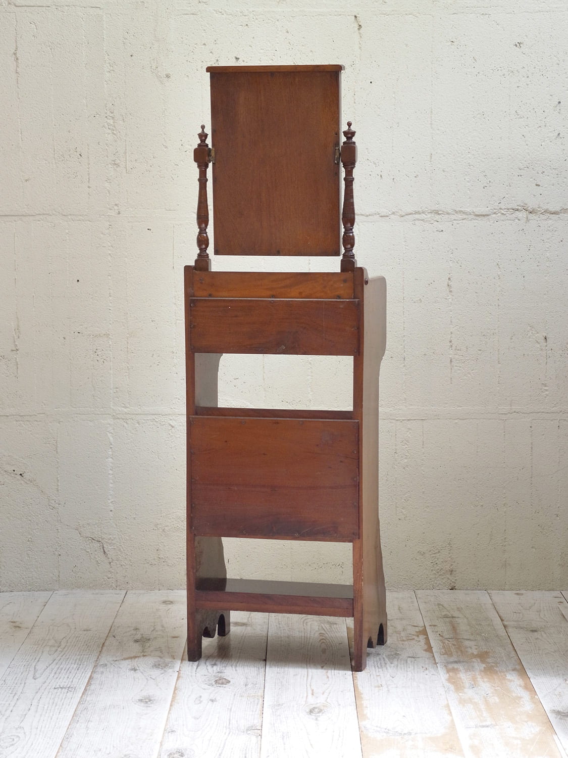 推定1930年代、イギリス製のアンティークジェントルマンスタンドです。英国紳士が身だしなみを整えるために作られた家具です。ミラー部分は少し角度を変えることもできます。上質なマホガニー材で作られており、デザイン性、実用性を兼ね備えた家具です。ショップの什器としてのご使用もおすすめです。ミラー部分サイズ W350 H473mm、天板までの高さは980mm、引き出し内寸 W400 D265 H80mm。