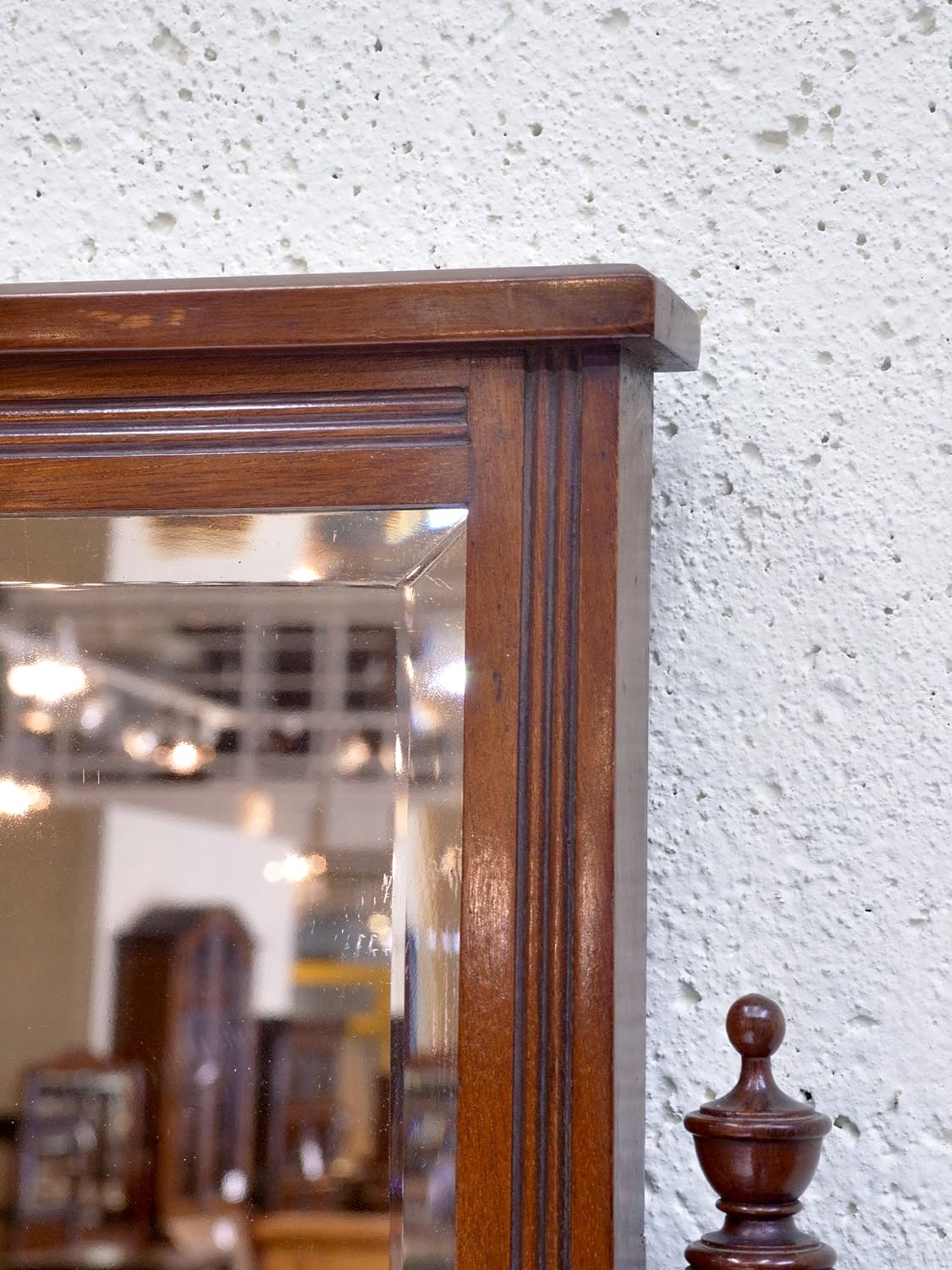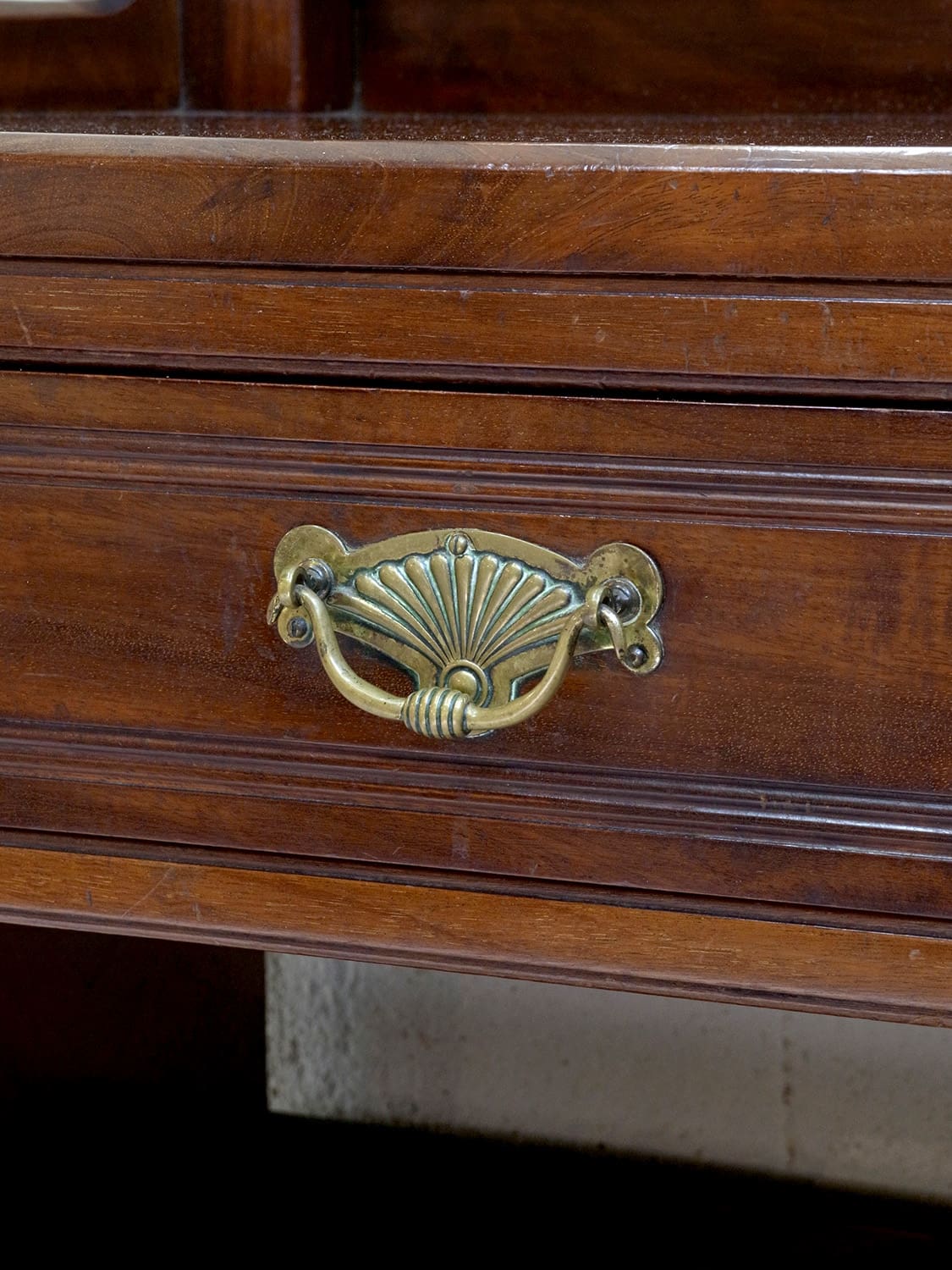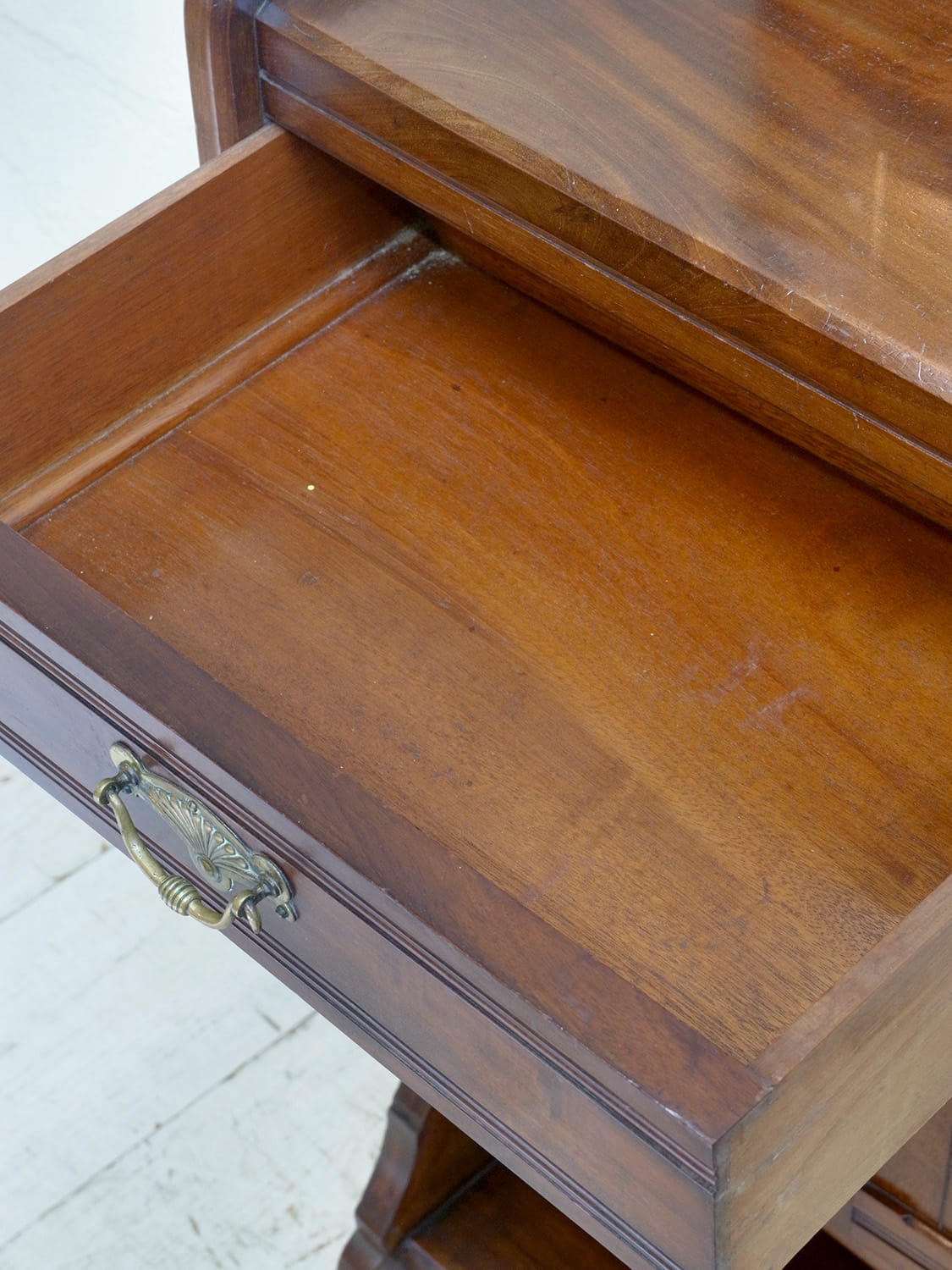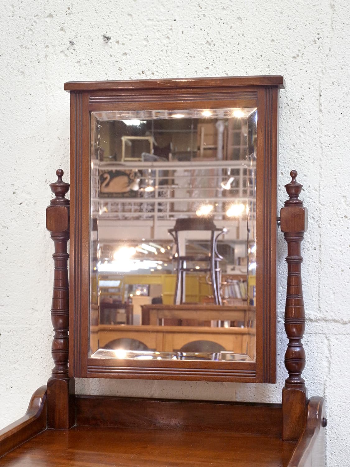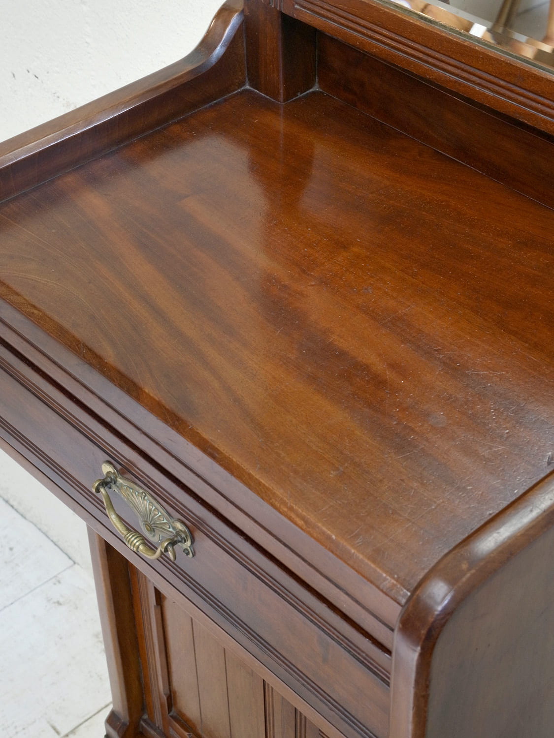推定1930年代、イギリス製のアンティークジェントルマンスタンドです。英国紳士が身だしなみを整えるために作られた家具です。ミラー部分は少し角度を変えることもできます。上質なマホガニー材で作られており、デザイン性、実用性を兼ね備えた家具です。ショップの什器としてのご使用もおすすめです。ミラー部分サイズ W350 H473mm、天板までの高さは980mm、引き出し内寸 W400 D265 H80mm。