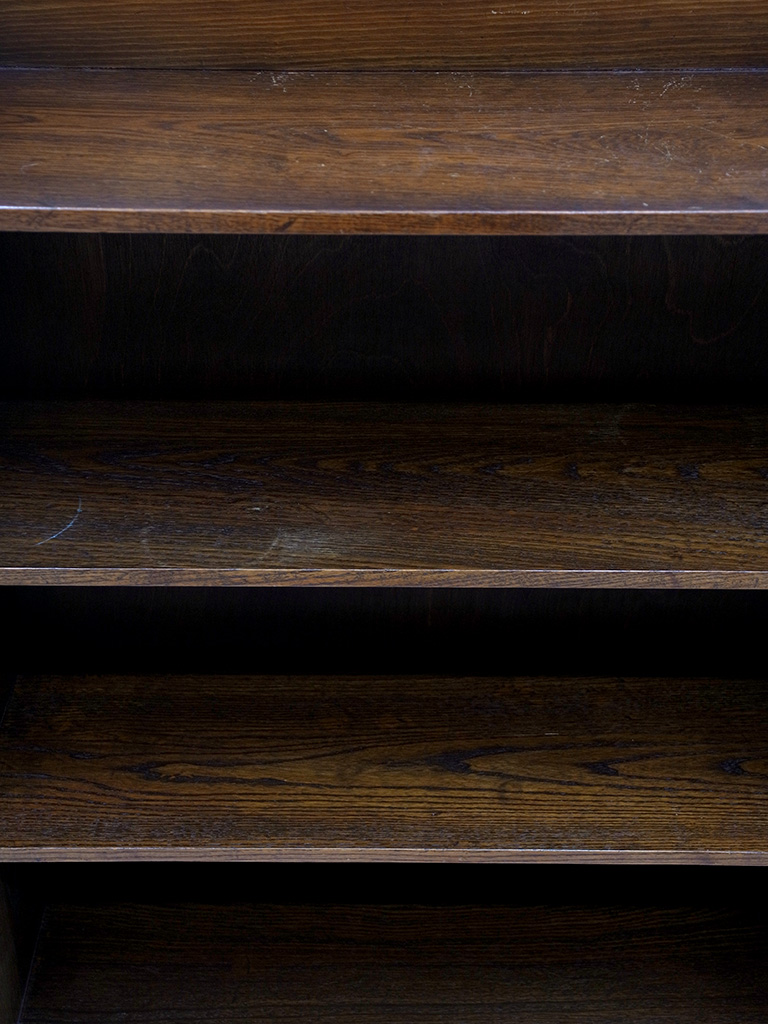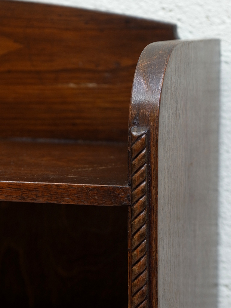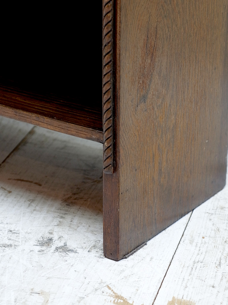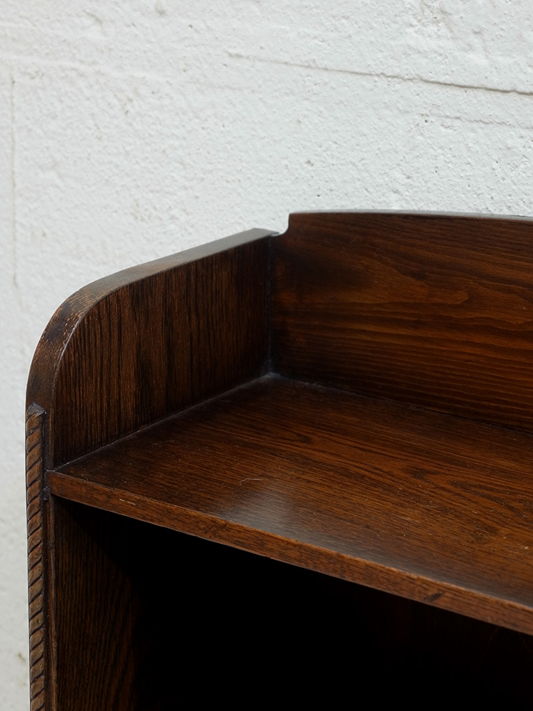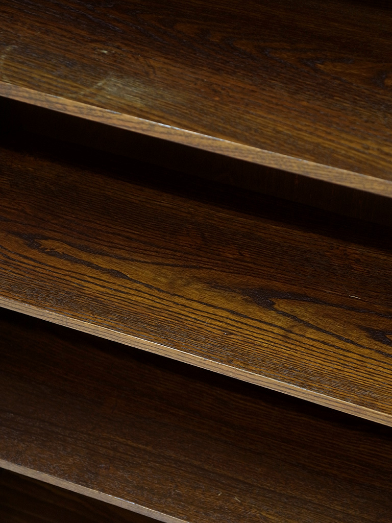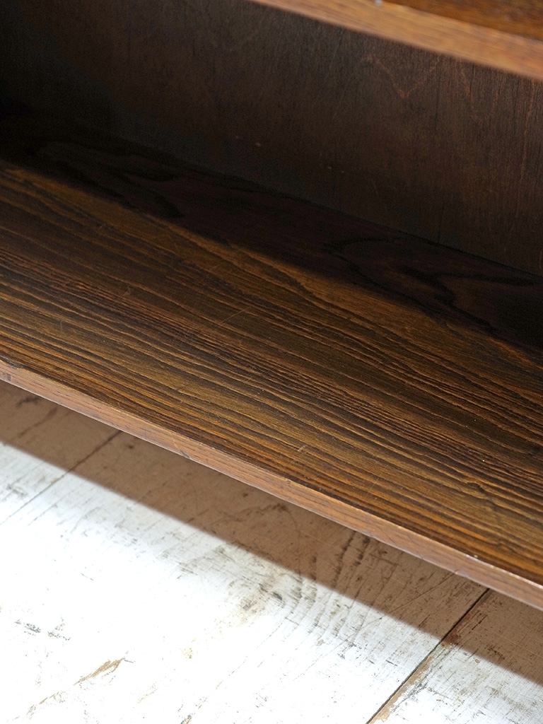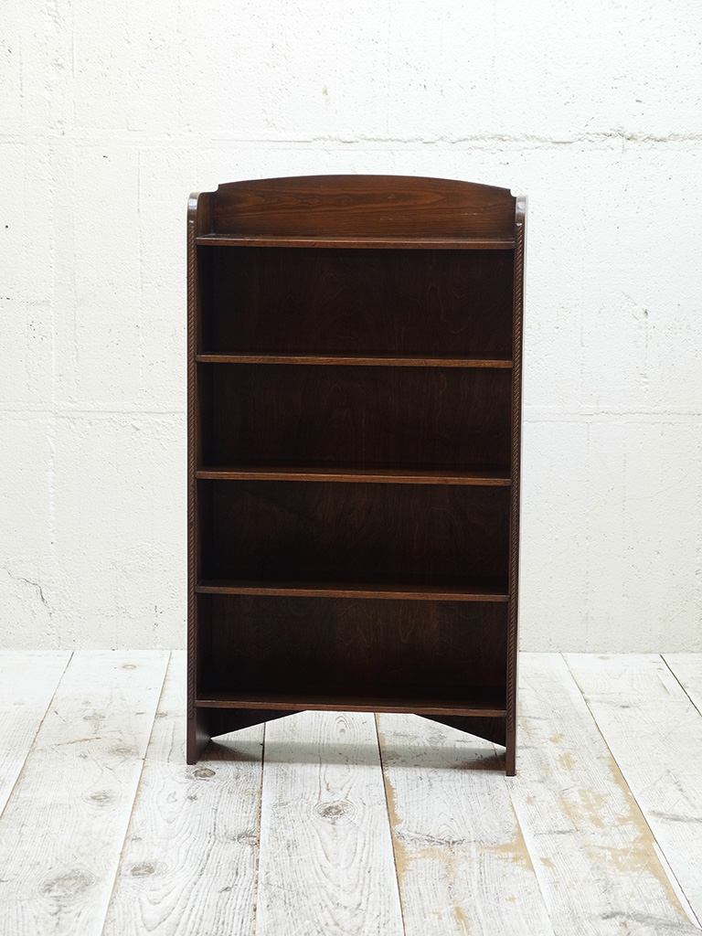 推定1930年代、イギリス製のアンティークオークブックシェルフです。シンプルなデザインで奥行が浅く大きいわけではないですが、収納量が豊富です。本棚としてのご使用はもちろんコレクションの飾り棚としてのご使用もおすすめです。棚板内寸 W580 D185 上からH105/H200/H205/H205/H205。その他ブックシェルフはこちらから。