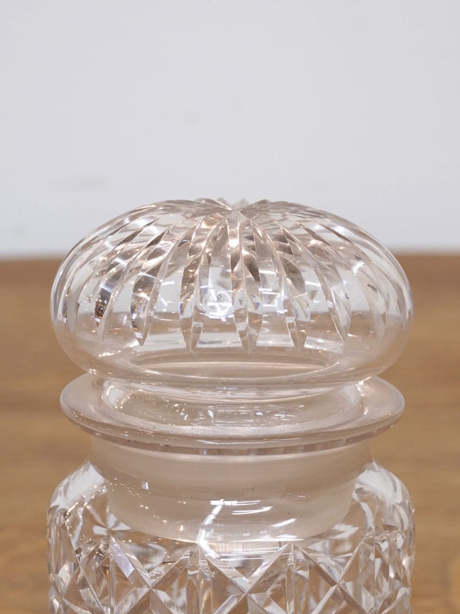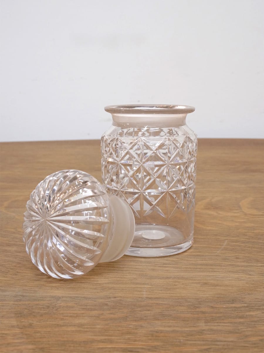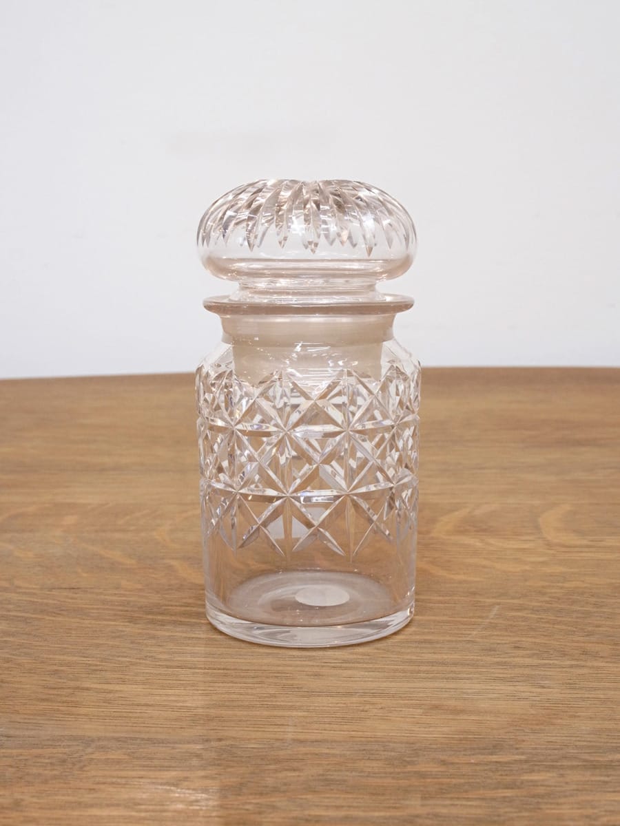推定1940年代、イギリス製のカッティングガラスピクルスジャーです。深いカッティングが施され、光の入り方がきれいです。小物入れとしてなどのご使用がおすすめです。集合画像では真ん中の者です。その他ガラス小物はこちらから。