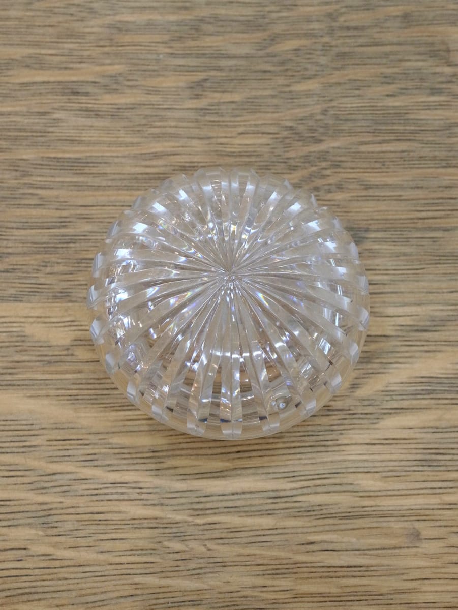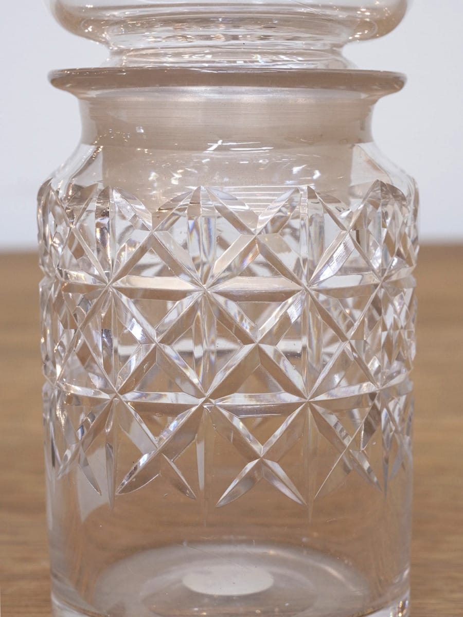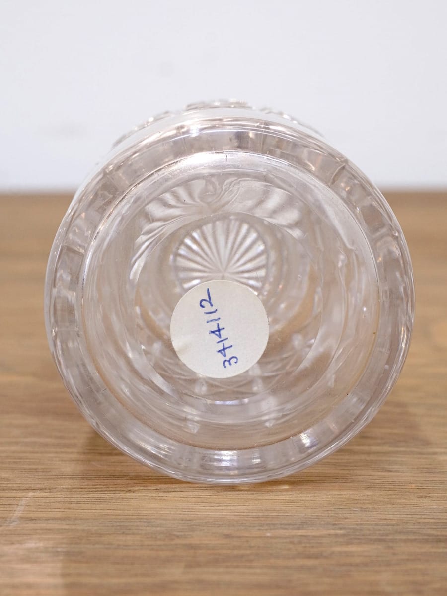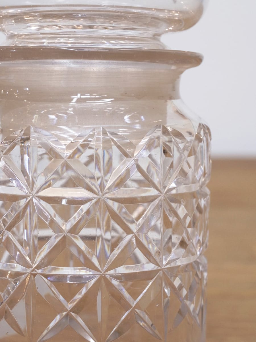 推定1940年代、イギリス製のカッティングガラスピクルスジャーです。深いカッティングが施され、光の入り方がきれいです。小物入れとしてなどのご使用がおすすめです。集合画像では真ん中の者です。その他ガラス小物はこちらから。
