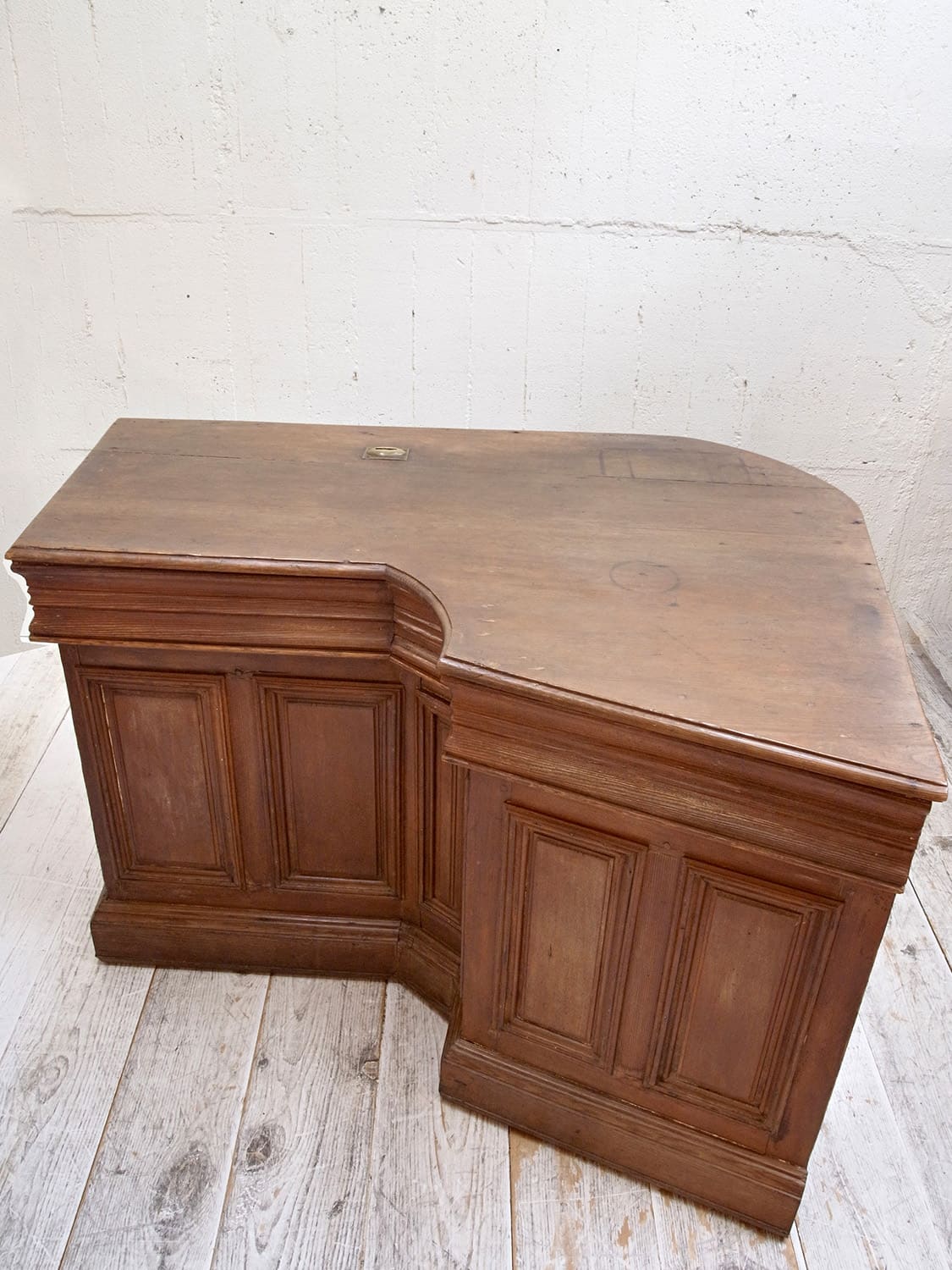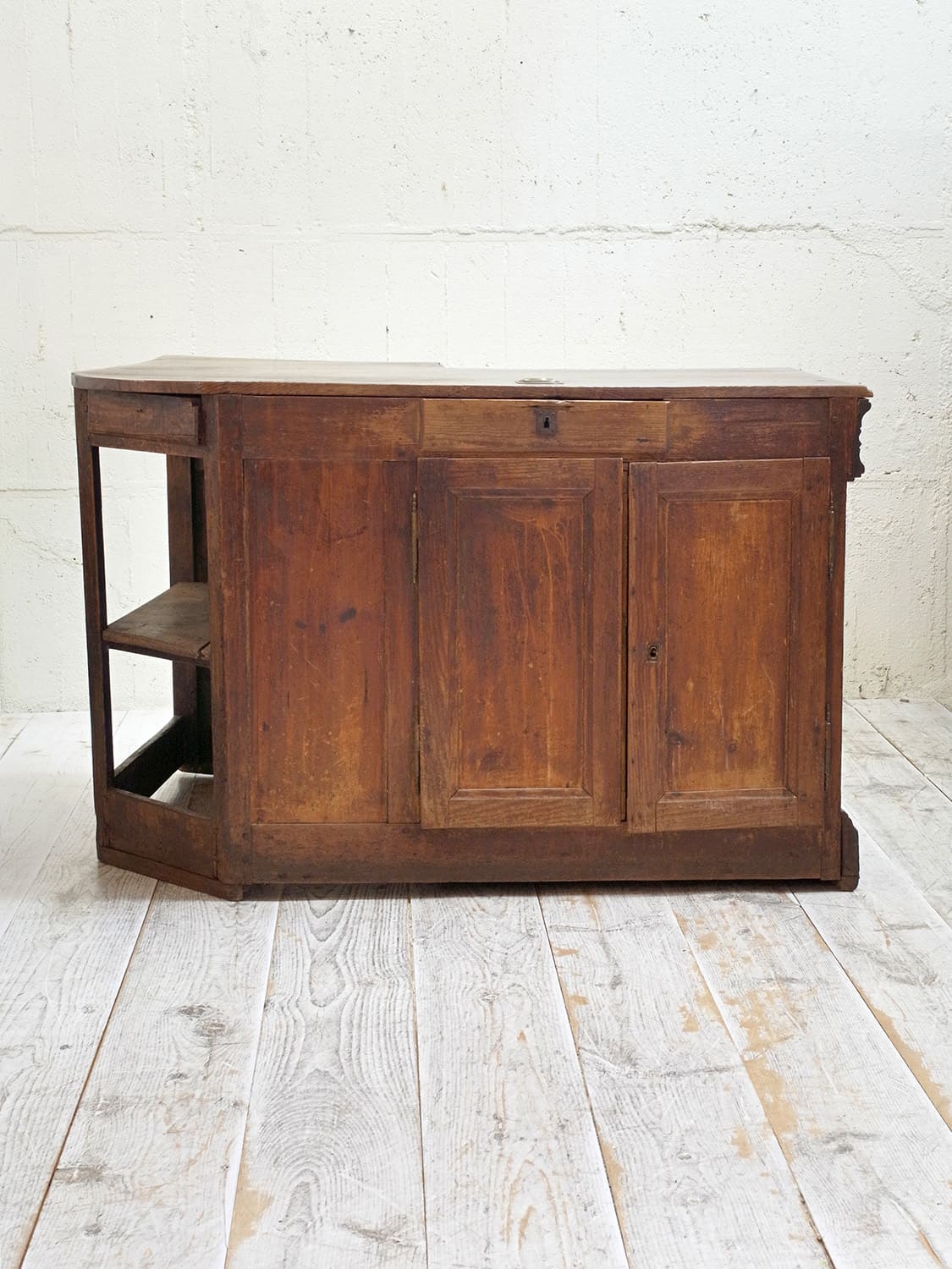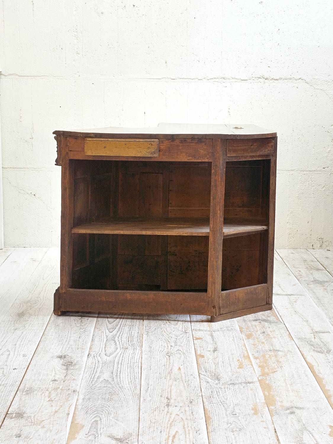 推定1910年代、フランス製のアンティークショップカウンターです。当時引き出しにコインを入れていたようで、天板から直接引き出しにコインを入れることができる作りです。扉内の下やシェルフ部分の下は空洞です(床が見える)。置く場所が限られる家具ですが、ピッタリと収まるととても映える家具でお店の印象をアップしてくれること間違いなしです。その他カウンターはこちらから。
