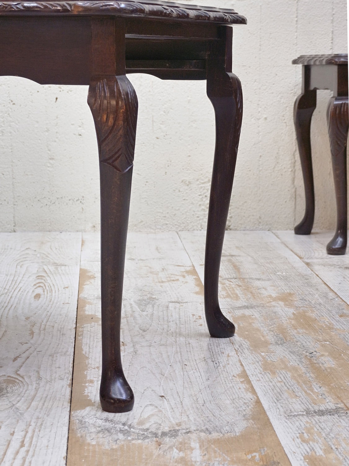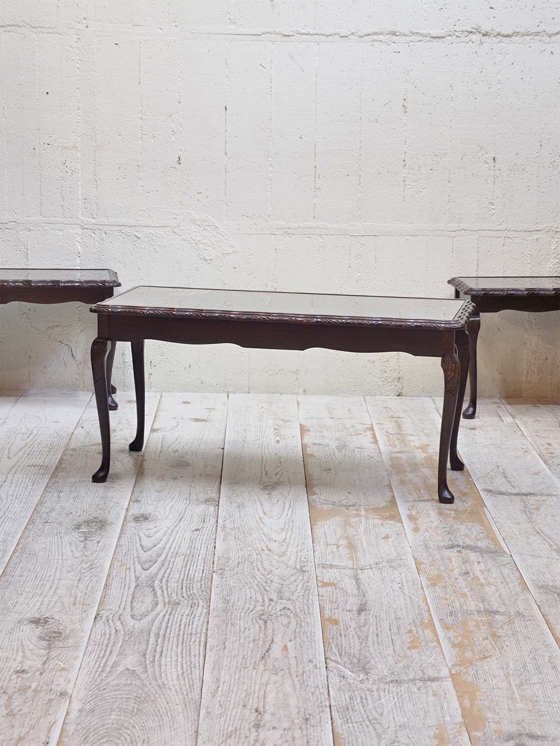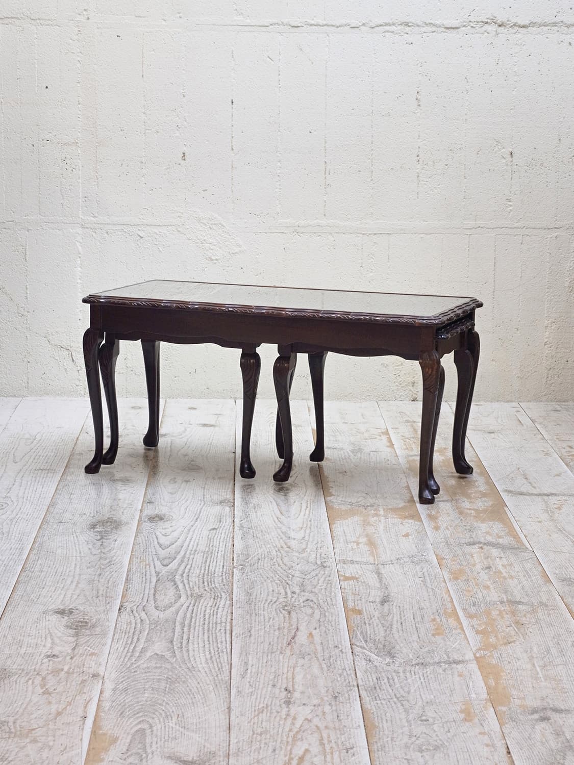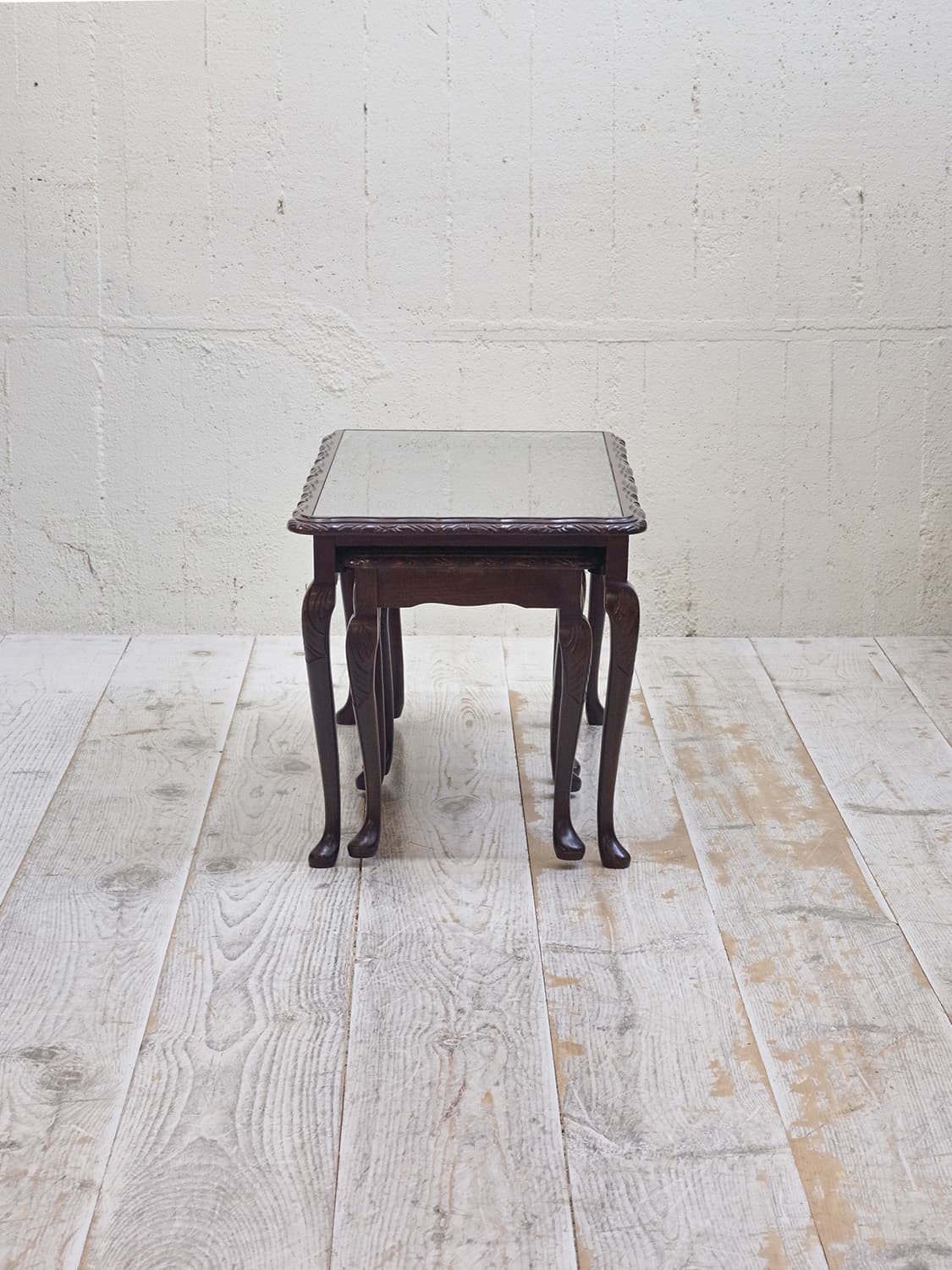 推定1930年代、イギリス製のアンティークマホガニーネストテーブルです。ネストテーブルとは大きさ違いのテーブルが入れ子式になっているもの。こちらのネストテーブルは左右から同サイズテーブルが出てくる仕様です。普段はコーヒーテーブルとして使用し、来客時は入れ子になっているテーブルを取り出してテーブルスペースを増やすしてこともできるという機能的な作りになっています。こちらの大のテーブルにはレールが付いていて少し浮かせて収納することができます。天板にはガラス板があるので冷たい(熱い)飲み物を気兼ねなく置くことができます。その他ネストテーブルはこちらから。