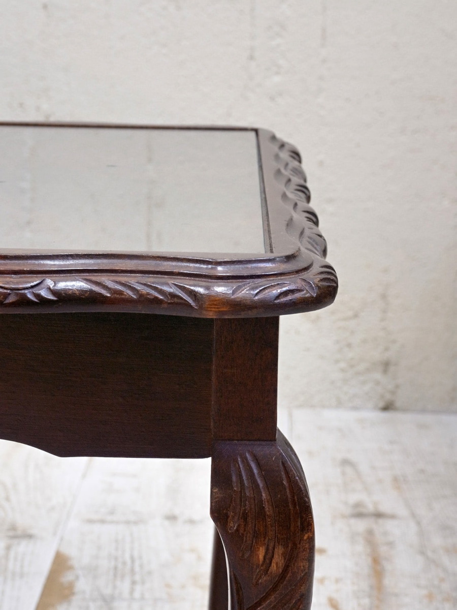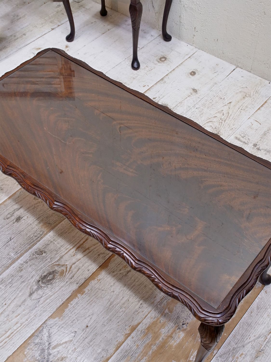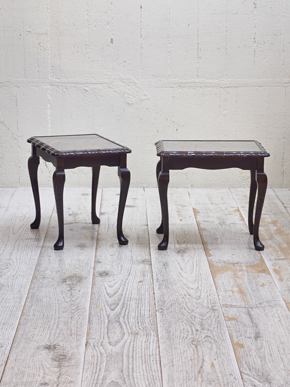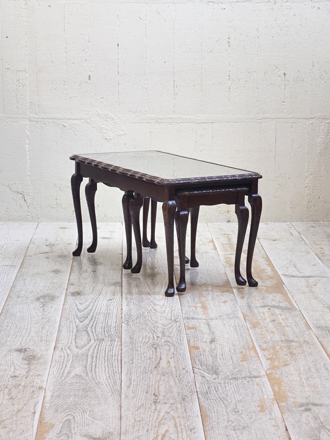 推定1930年代、イギリス製のアンティークマホガニーネストテーブルです。ネストテーブルとは大きさ違いのテーブルが入れ子式になっているもの。こちらのネストテーブルは左右から同サイズテーブルが出てくる仕様です。普段はコーヒーテーブルとして使用し、来客時は入れ子になっているテーブルを取り出してテーブルスペースを増やすしてこともできるという機能的な作りになっています。こちらの大のテーブルにはレールが付いていて少し浮かせて収納することができます。天板にはガラス板があるので冷たい(熱い)飲み物を気兼ねなく置くことができます。その他ネストテーブルはこちらから。