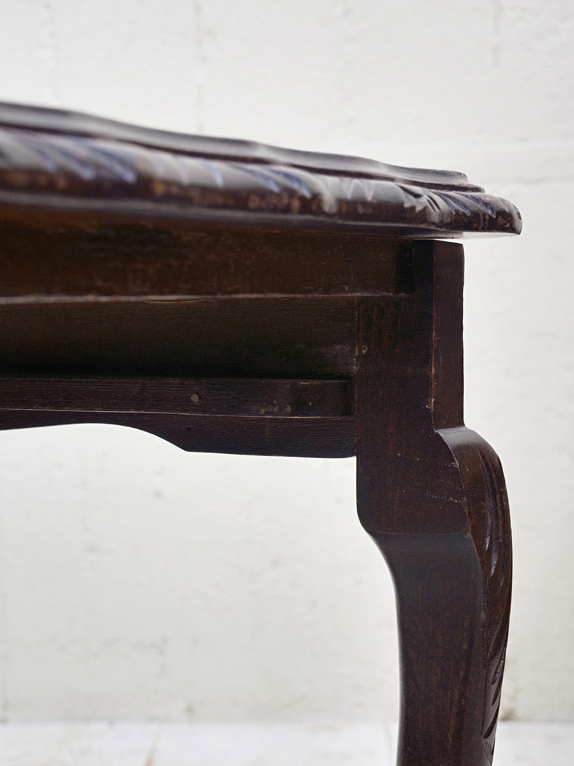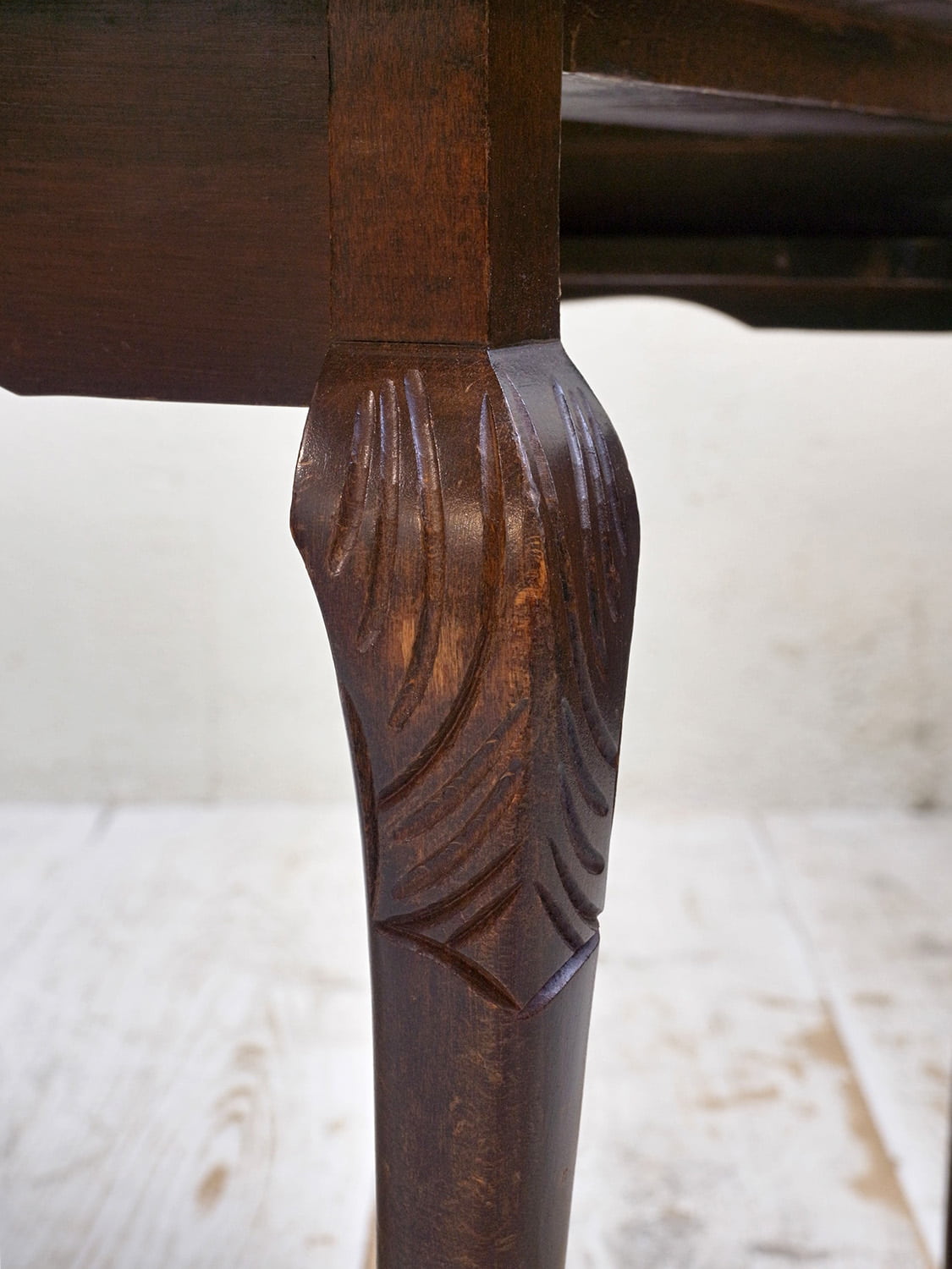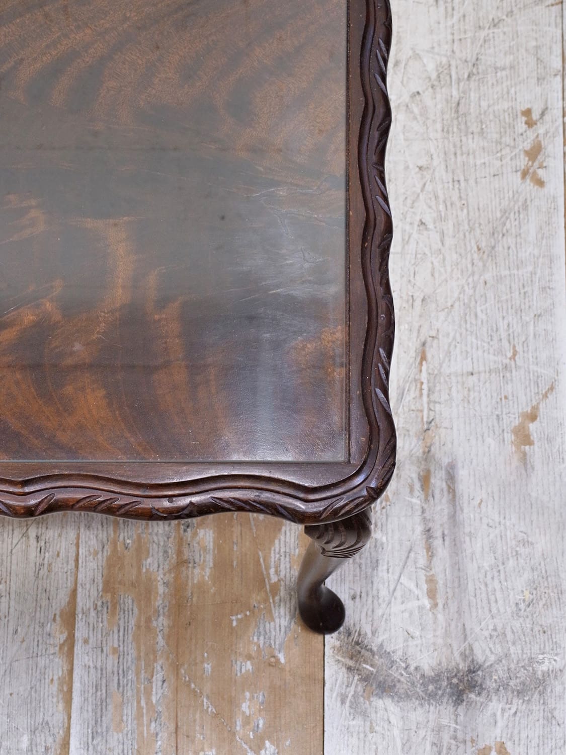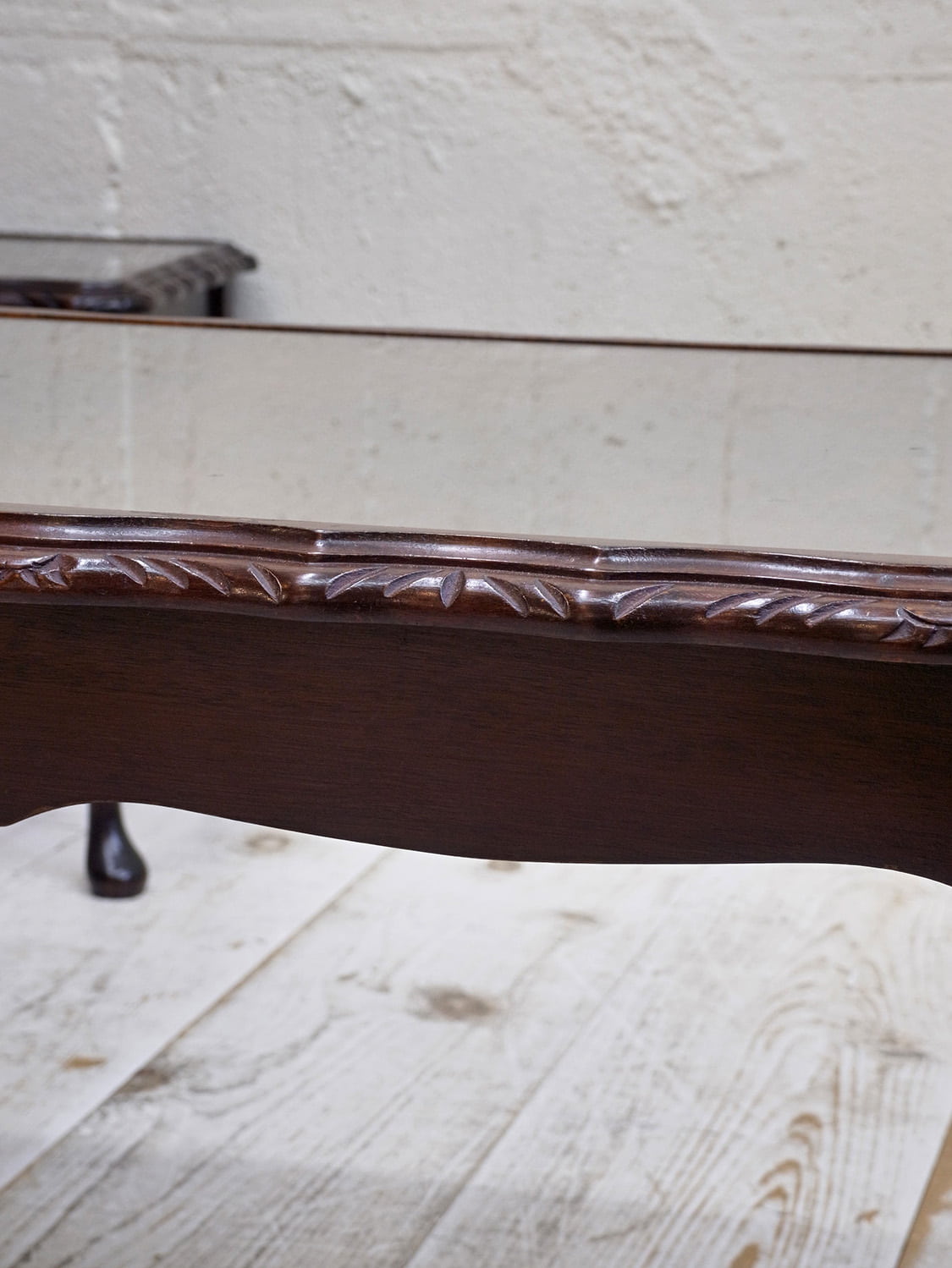 推定1930年代、イギリス製のアンティークマホガニーネストテーブルです。ネストテーブルとは大きさ違いのテーブルが入れ子式になっているもの。こちらのネストテーブルは左右から同サイズテーブルが出てくる仕様です。普段はコーヒーテーブルとして使用し、来客時は入れ子になっているテーブルを取り出してテーブルスペースを増やすしてこともできるという機能的な作りになっています。こちらの大のテーブルにはレールが付いていて少し浮かせて収納することができます。天板にはガラス板があるので冷たい(熱い)飲み物を気兼ねなく置くことができます。その他ネストテーブルはこちらから。