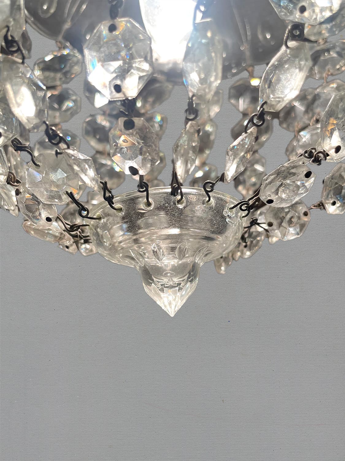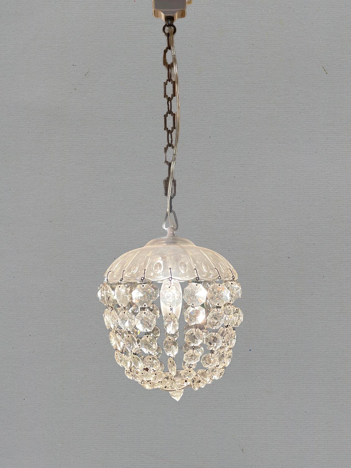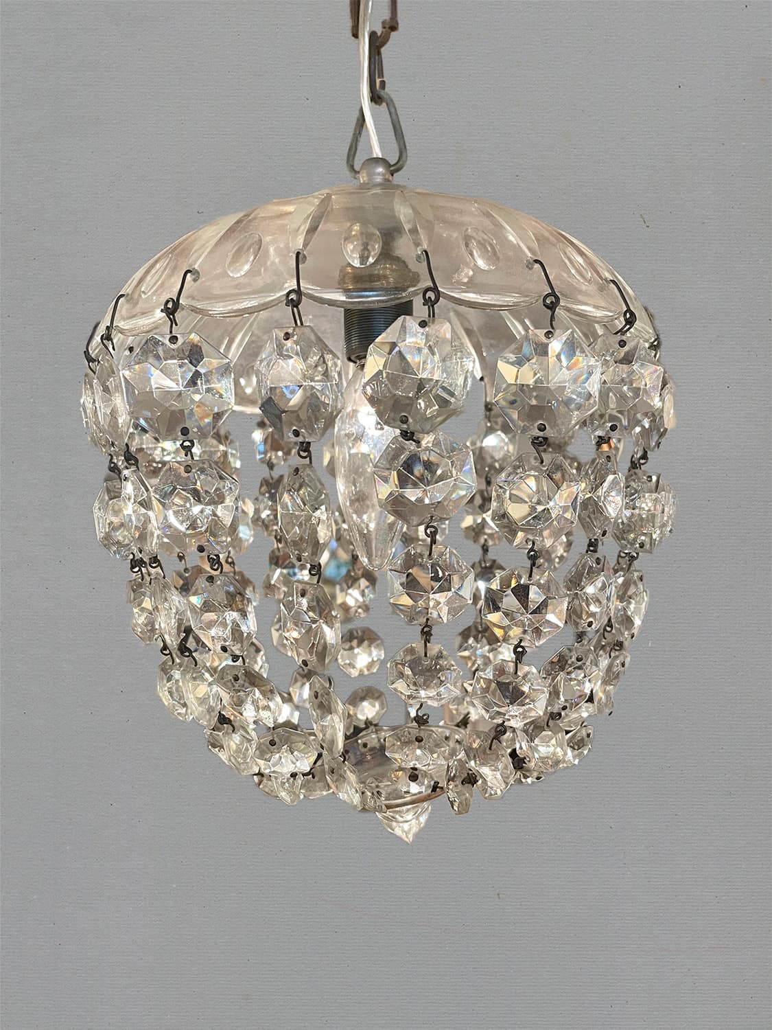 推定1930年代。クリスタルガラスの陰影が壁に映り幻想的な空間になります。 小ぶりなシャンデリアなので引っかけシーリングでの取り付けが可能です。コードが短く36.5cmです。手作りで作られているため形が少しいびつですが、アンティークならではです。(透明コード E17 40W 引っ掛けシーリング灯具含む)
