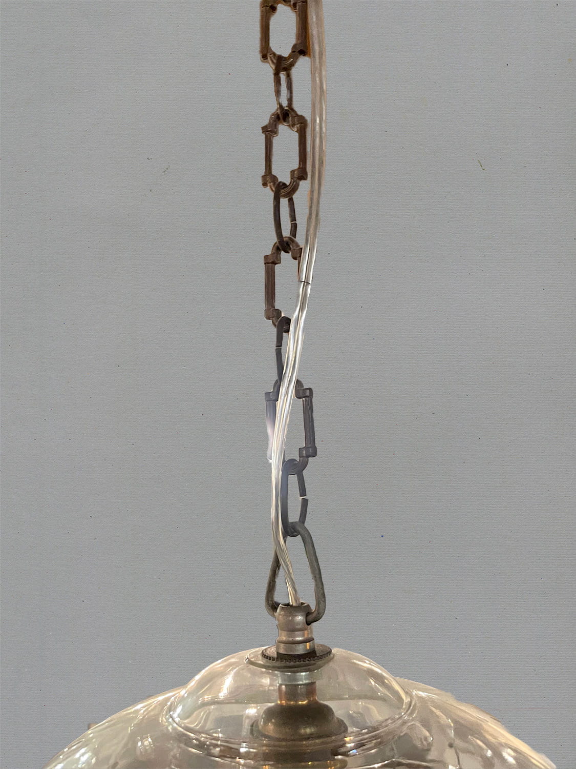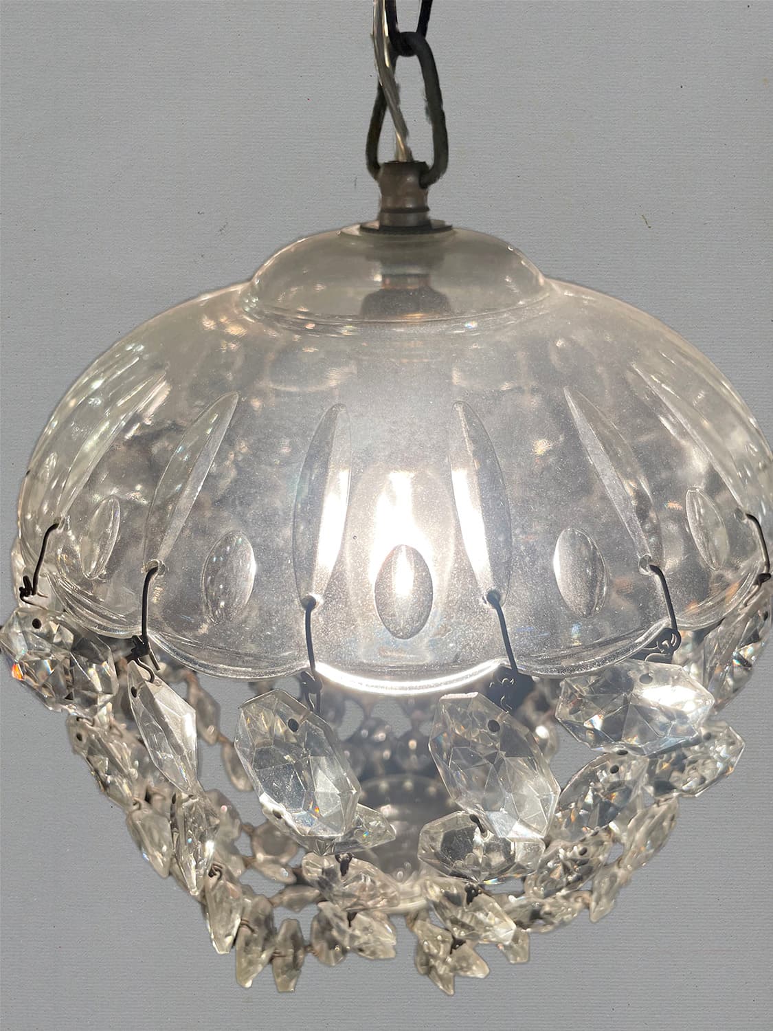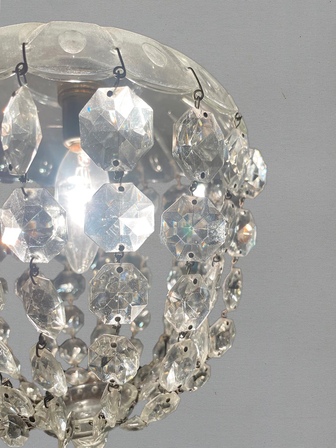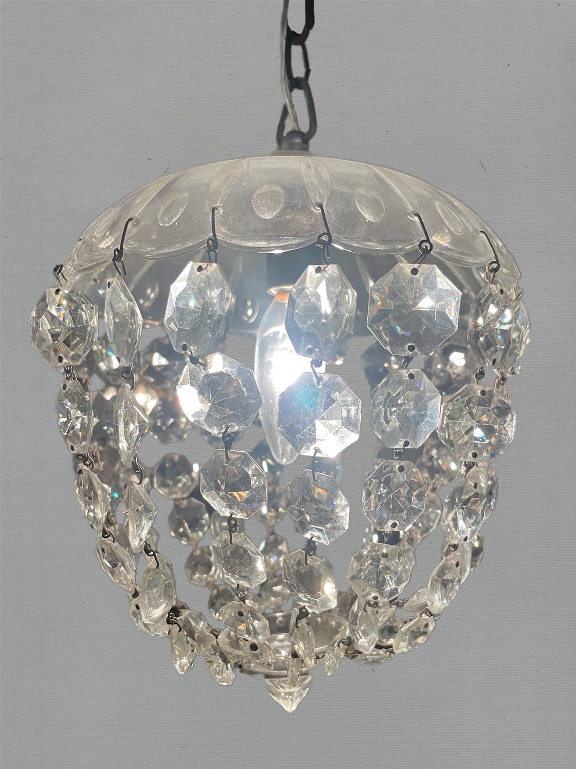 推定1930年代。クリスタルガラスの陰影が壁に映り幻想的な空間になります。 小ぶりなシャンデリアなので引っかけシーリングでの取り付けが可能です。コードが短く36.5cmです。手作りで作られているため形が少しいびつですが、アンティークならではです。(透明コード E17 40W 引っ掛けシーリング灯具含む)