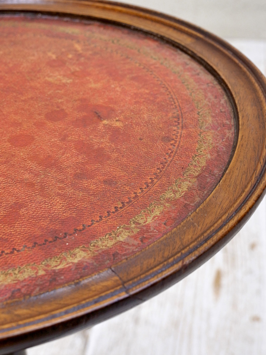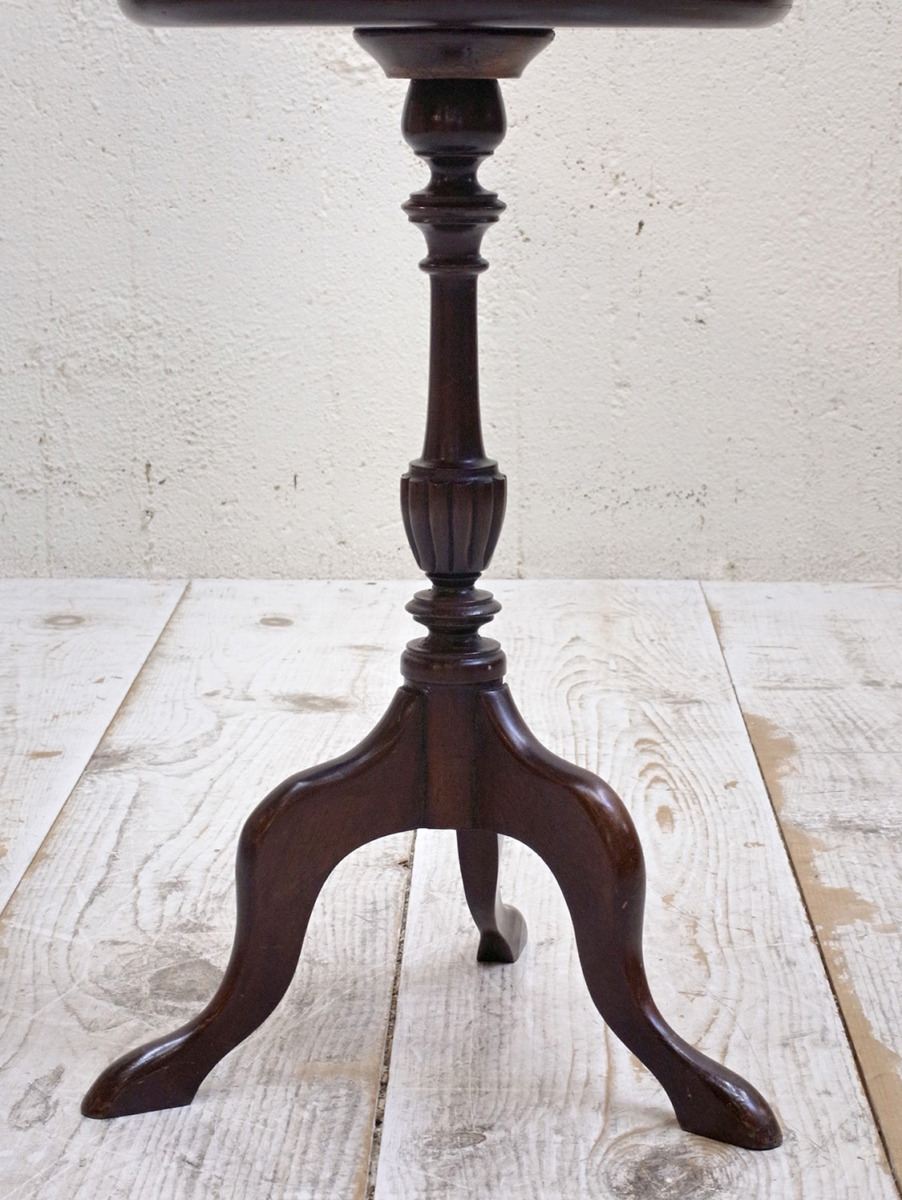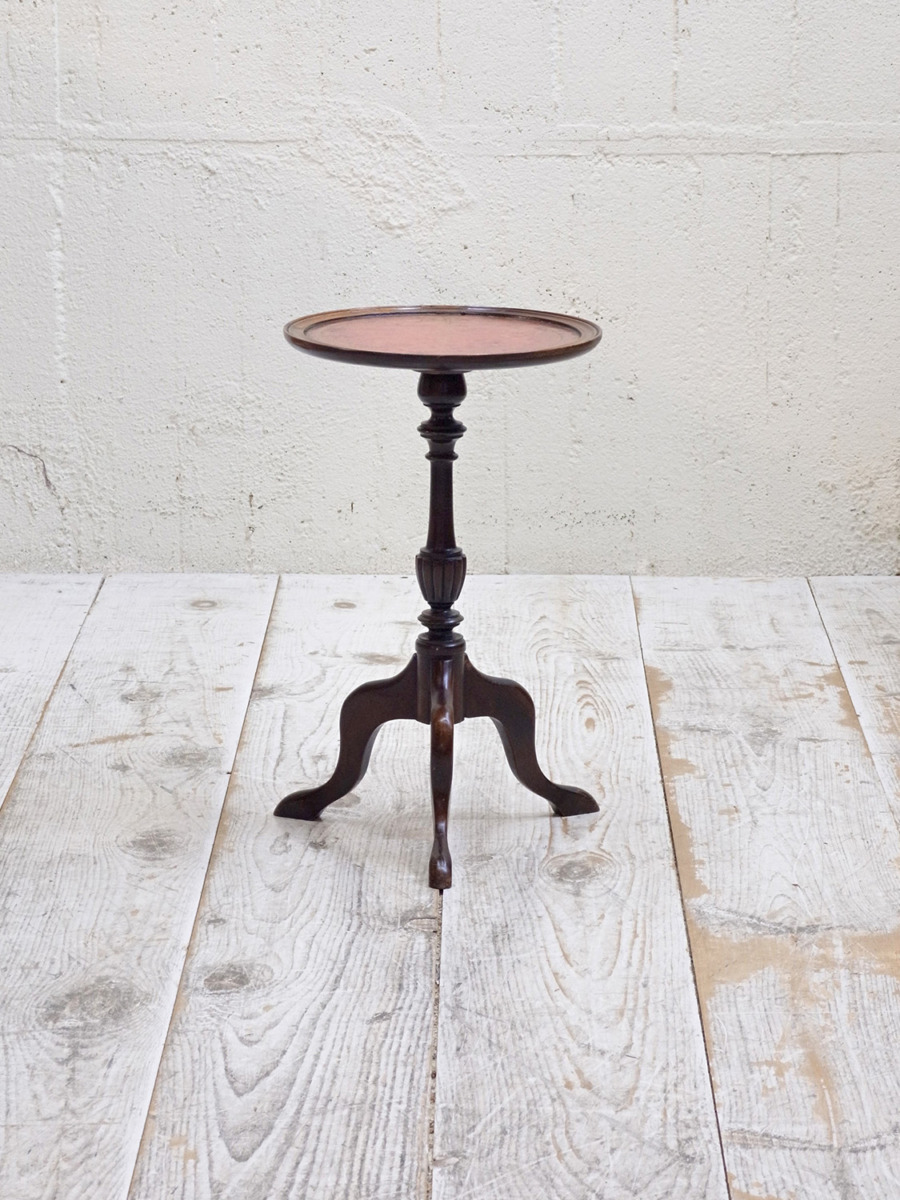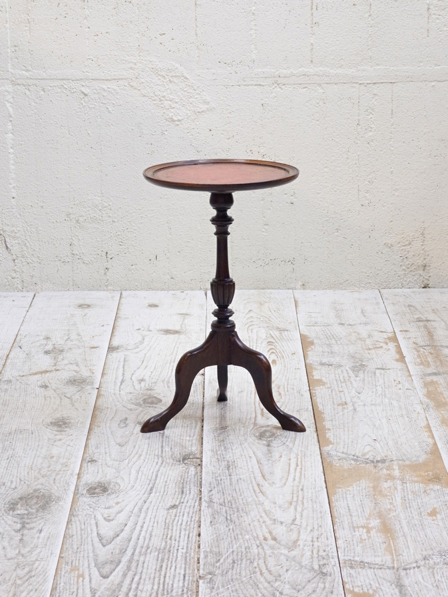 推定1920年代、イギリス製のマホガニーワインテーブルです。繊細なシルエットですが安定感があり、ソファ横やベッド横でちょっとしたものを置く小さなサイドテーブルとして重宝します。天板には箔押しのされた赤い革が張られています。小ぶりなのでお部屋に取り入れやすく置くだけで華やかな印象となる家具です。その他ワインテーブルはこちらから。