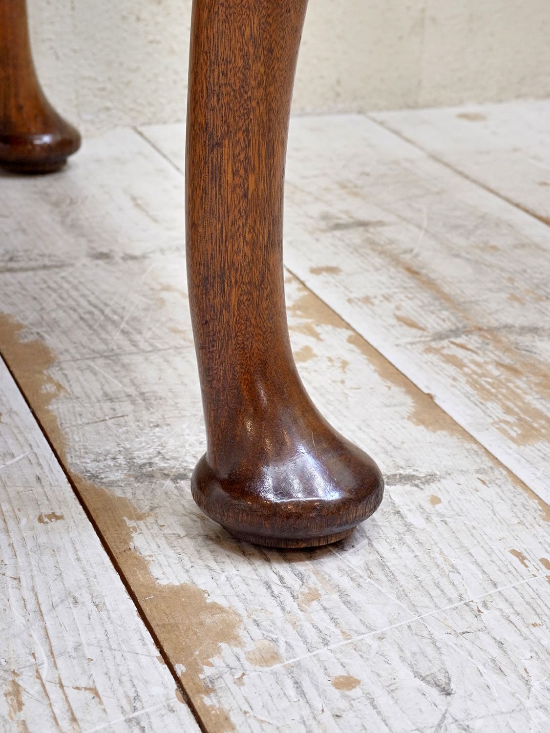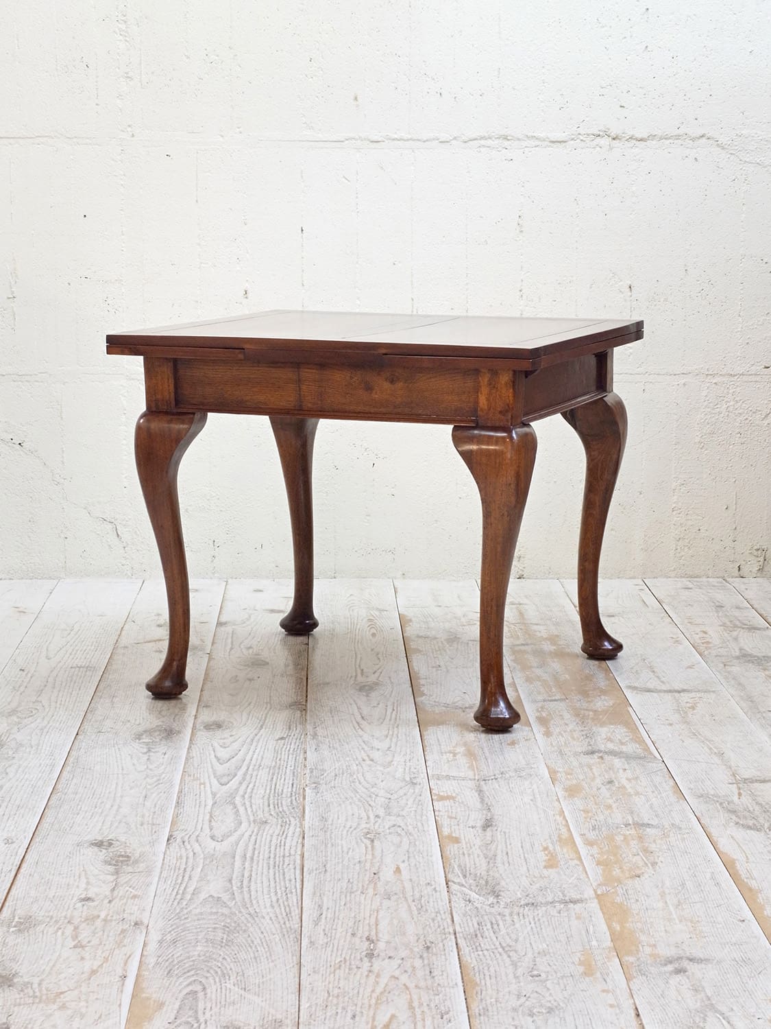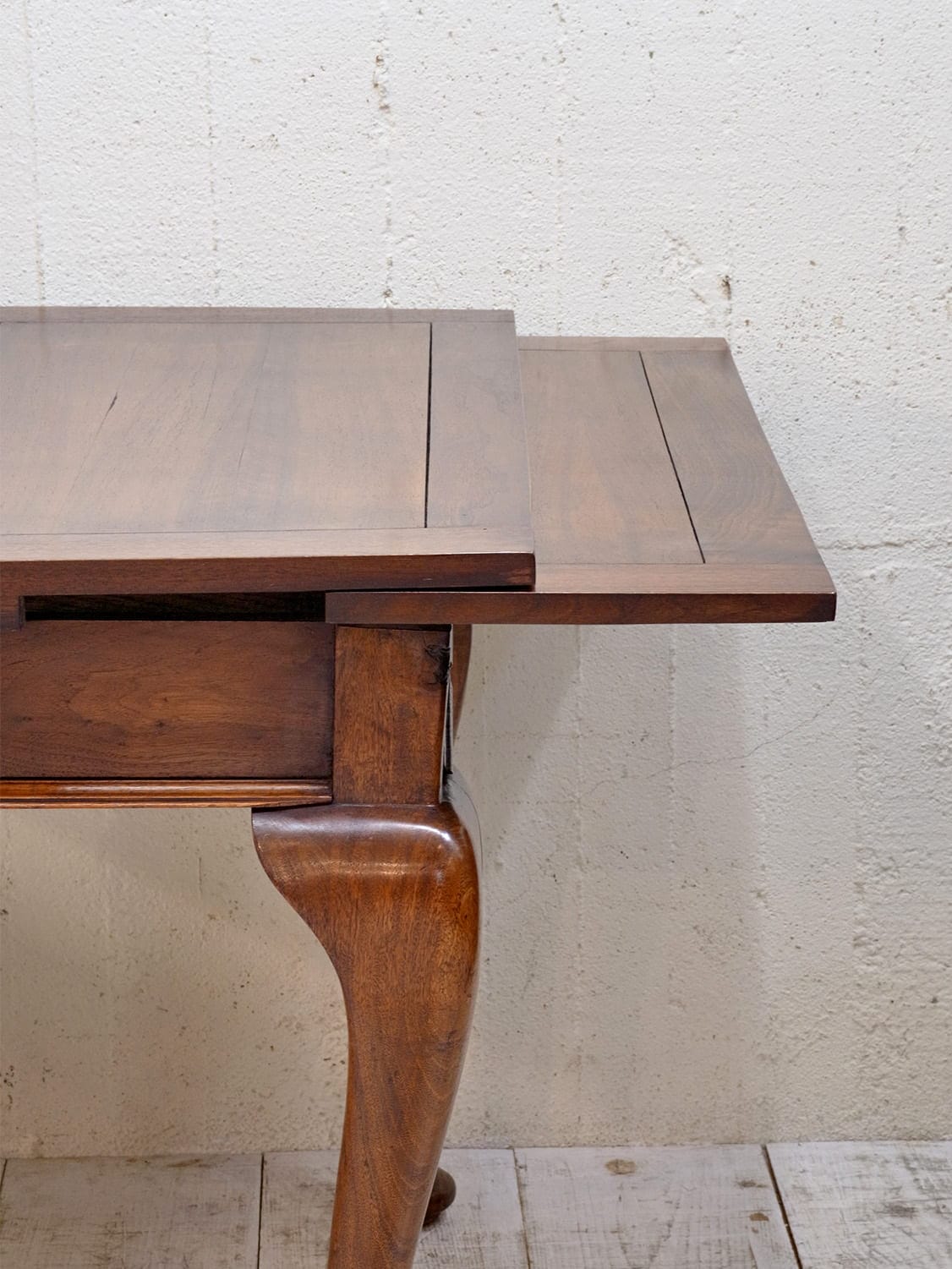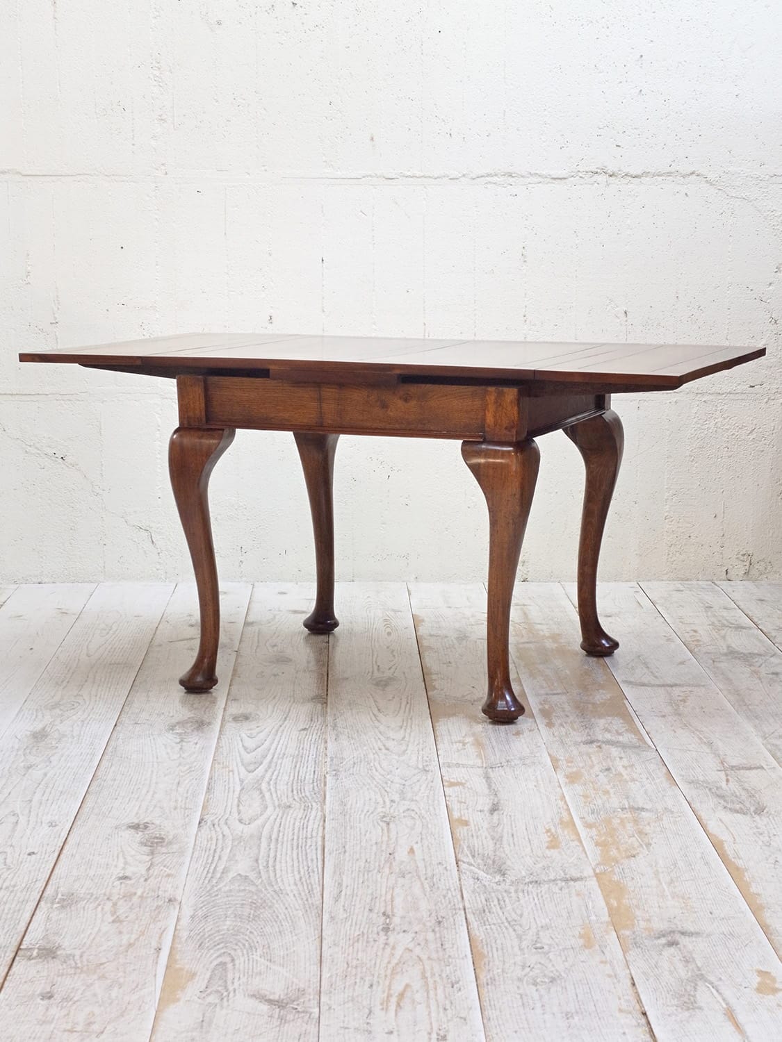 推定1930年代、イギリス製のマホガニードローリーフテーブルです。イギリスの伝統的なスタイルのひとつで、天板が左右に伸張することができます。来客時には天板を広げることができる機能的なテーブルです。幅890mmに左右300mmのリーフが伸びます。ドローリーフテーブルのスタンダードタイプよりほんの少し小さいタイプで、猫脚が特徴的です。4本脚のドローリーフテーブルは椅子の出し入れがしやすく人気があります。またオーク材で作られることが多いドローリーフテーブルなのでマホガニー材は少し珍しいです。リーフを広げて4人掛けでもゆったり、閉じた状態でも2人で使用することができます。その他ドローリーフテーブルはこちらから。
