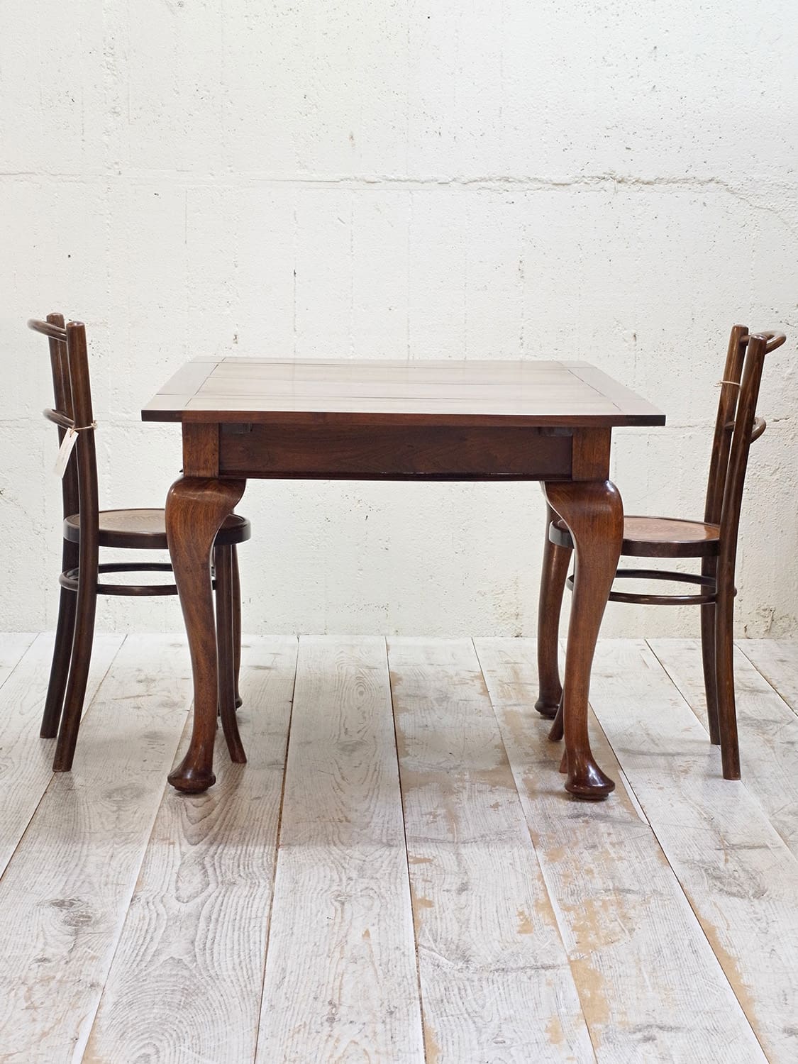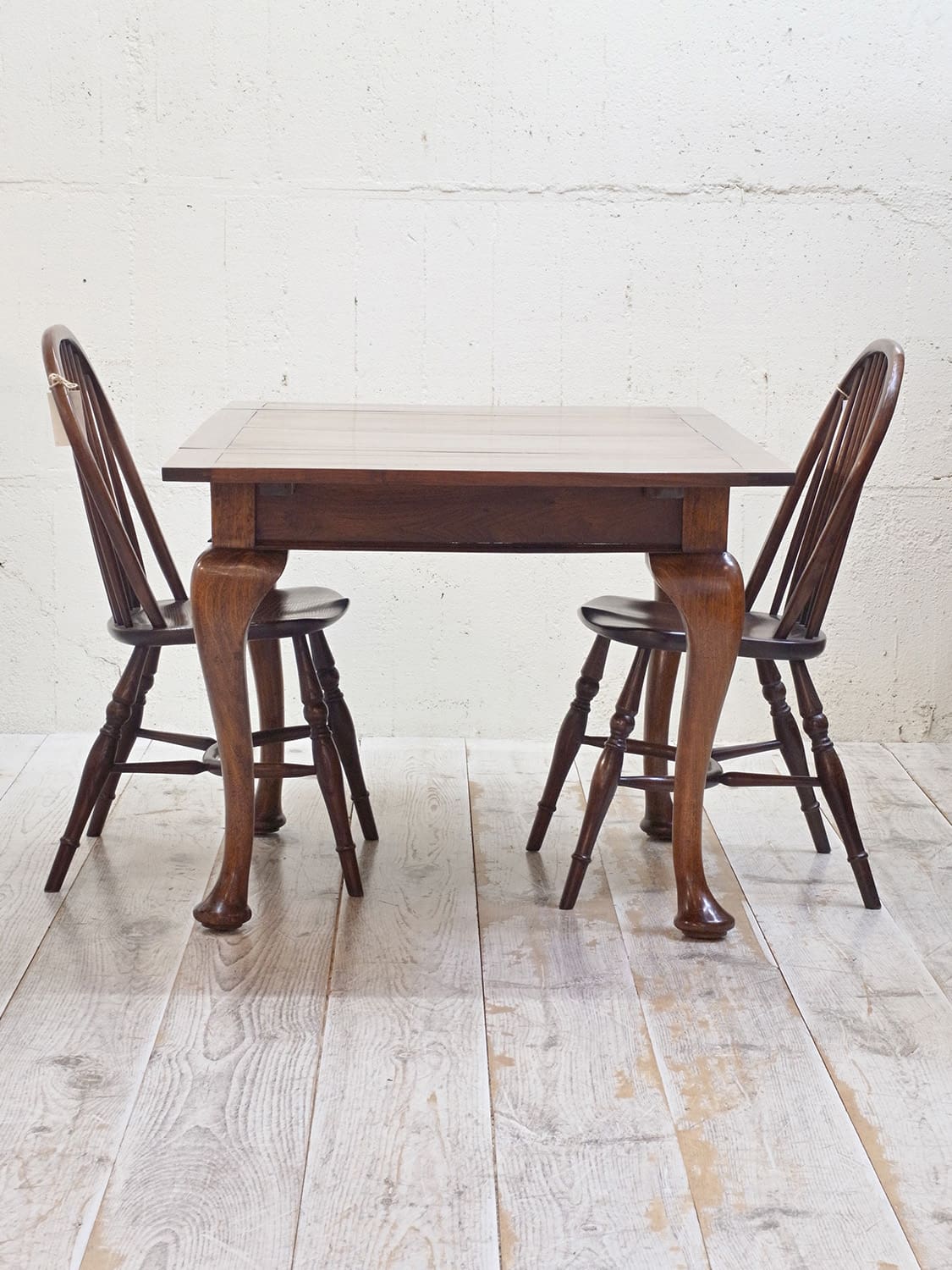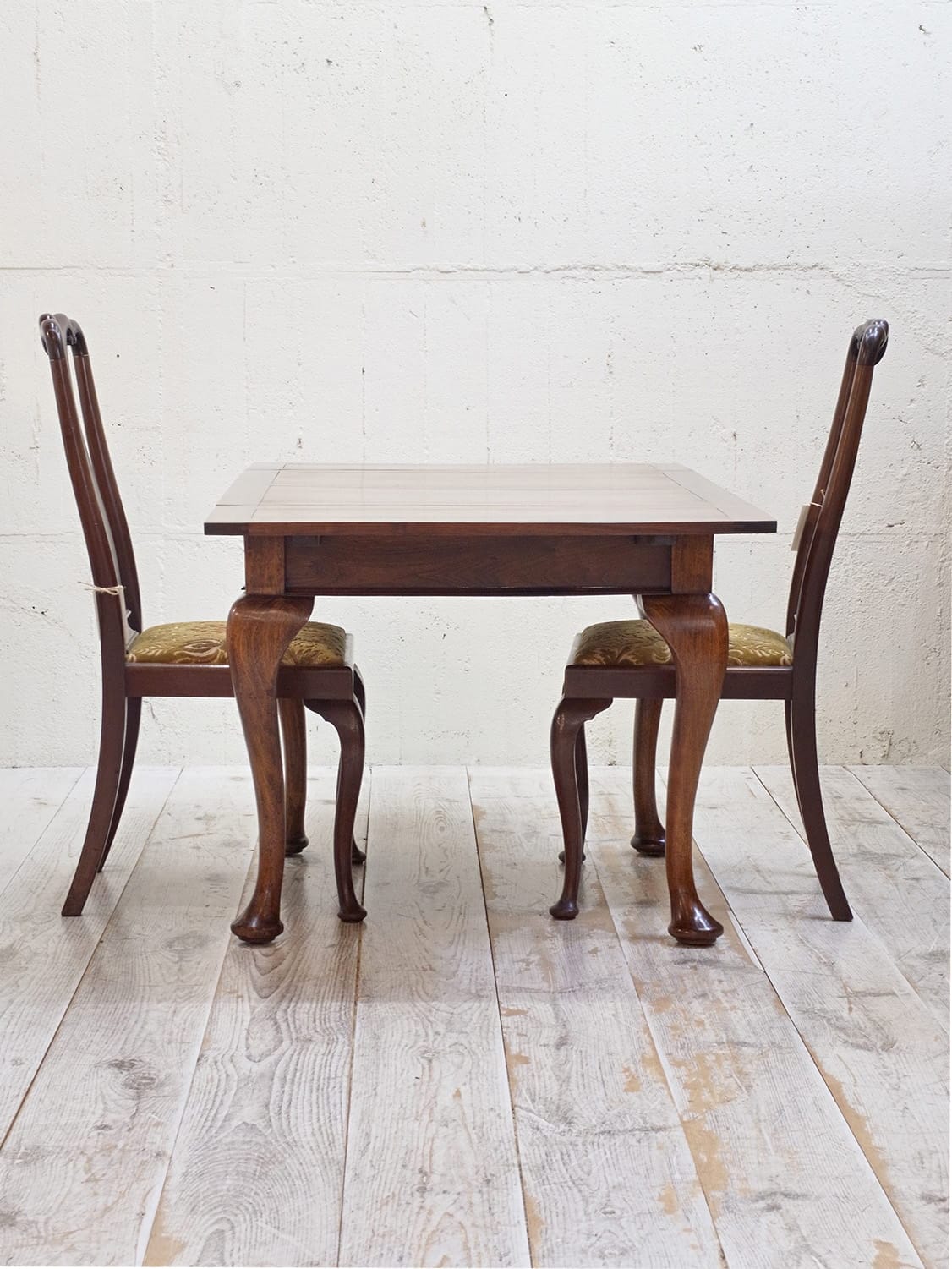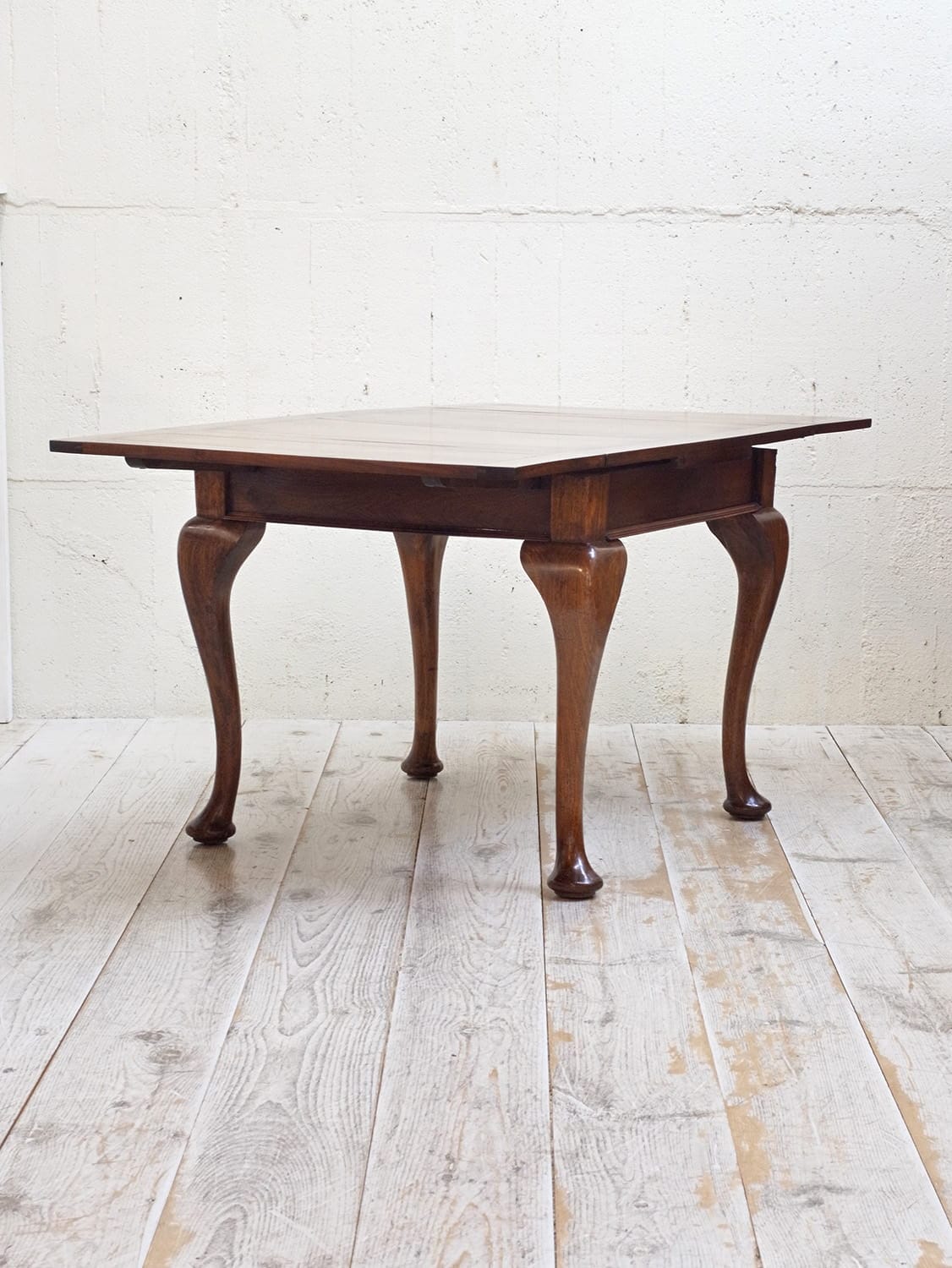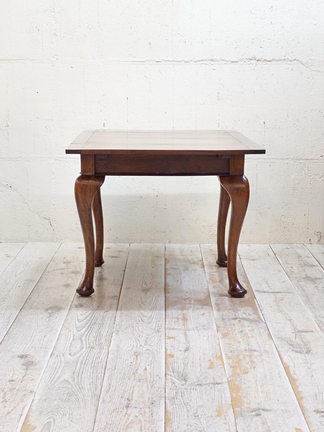推定1930年代、イギリス製のマホガニードローリーフテーブルです。イギリスの伝統的なスタイルのひとつで、天板が左右に伸張することができます。来客時には天板を広げることができる機能的なテーブルです。幅890mmに左右300mmのリーフが伸びます。ドローリーフテーブルのスタンダードタイプよりほんの少し小さいタイプで、猫脚が特徴的です。4本脚のドローリーフテーブルは椅子の出し入れがしやすく人気があります。またオーク材で作られることが多いドローリーフテーブルなのでマホガニー材は少し珍しいです。リーフを広げて4人掛けでもゆったり、閉じた状態でも2人で使用することができます。その他ドローリーフテーブルはこちらから。