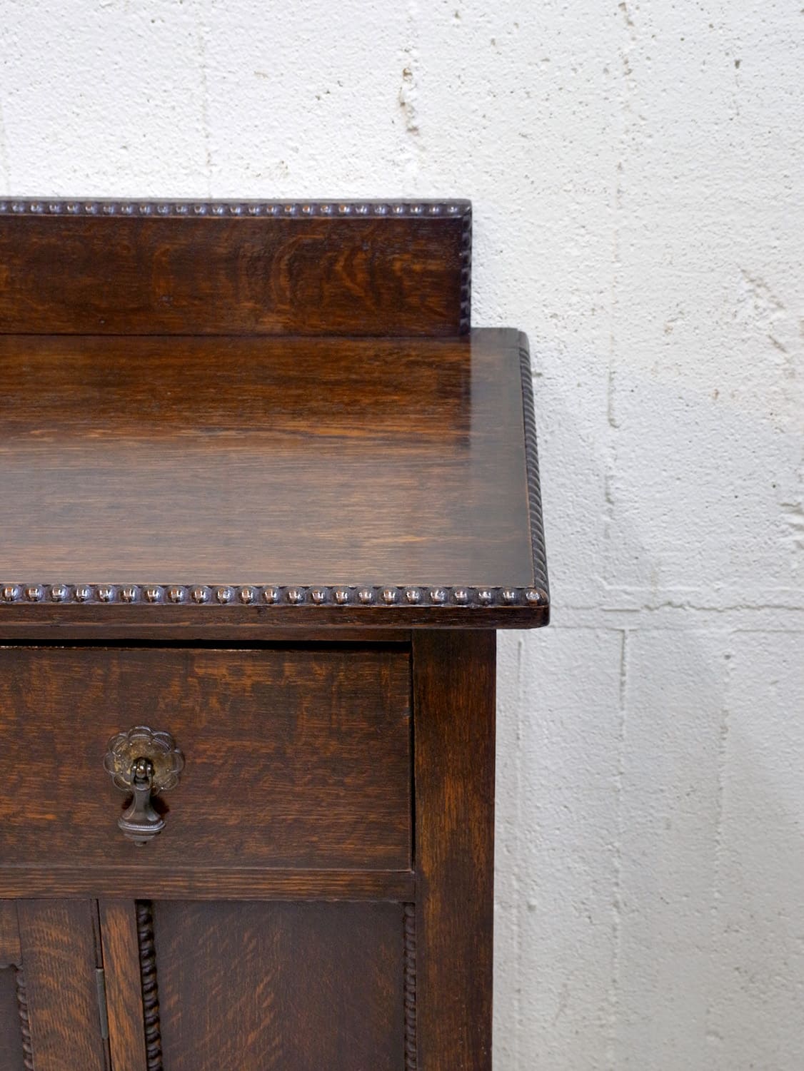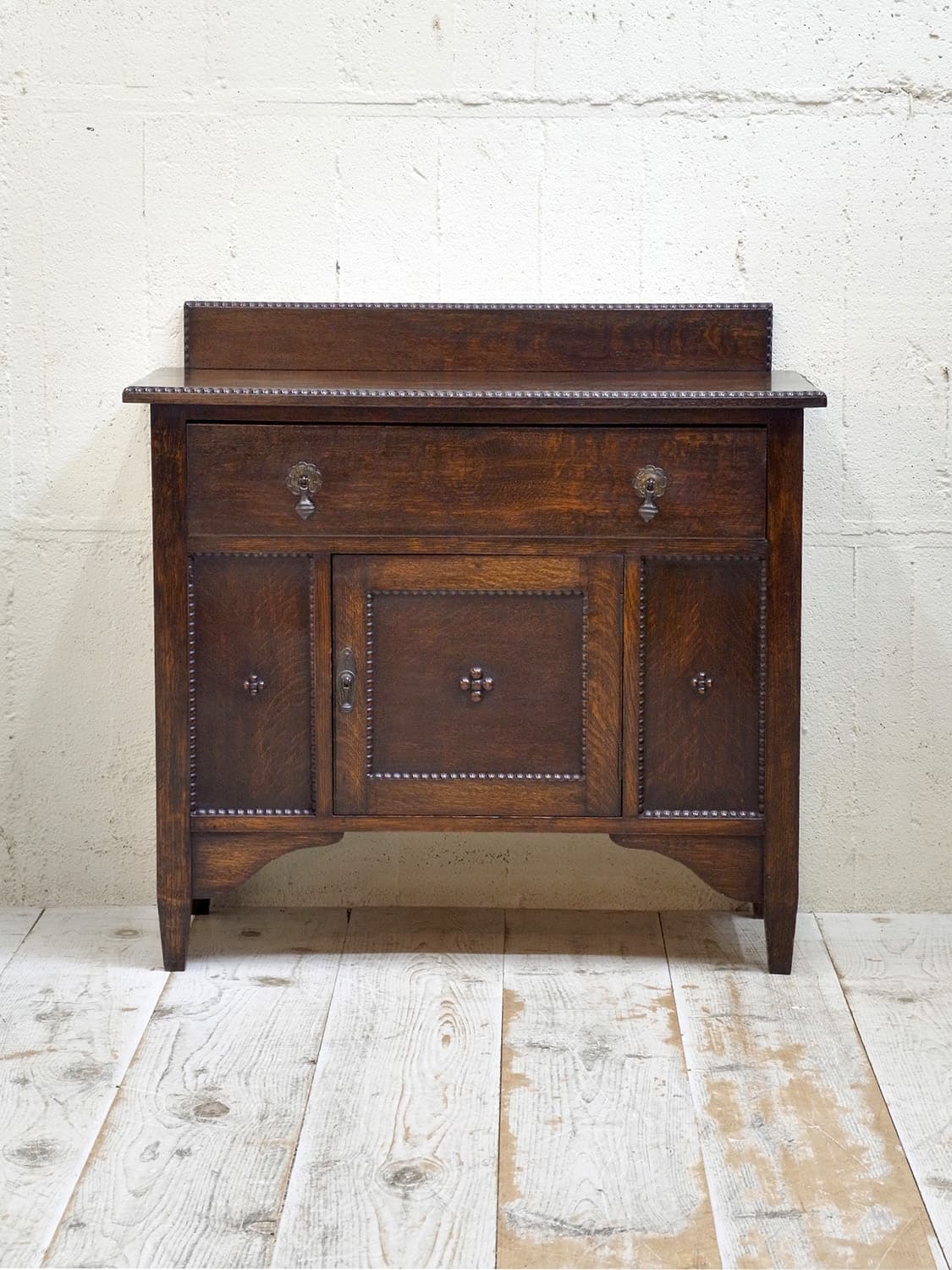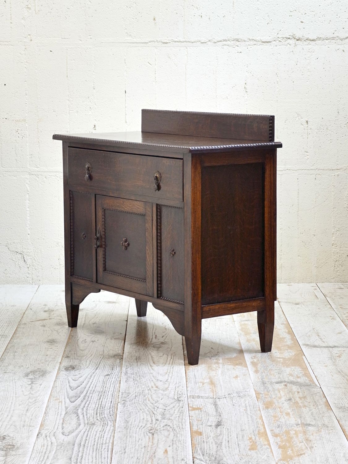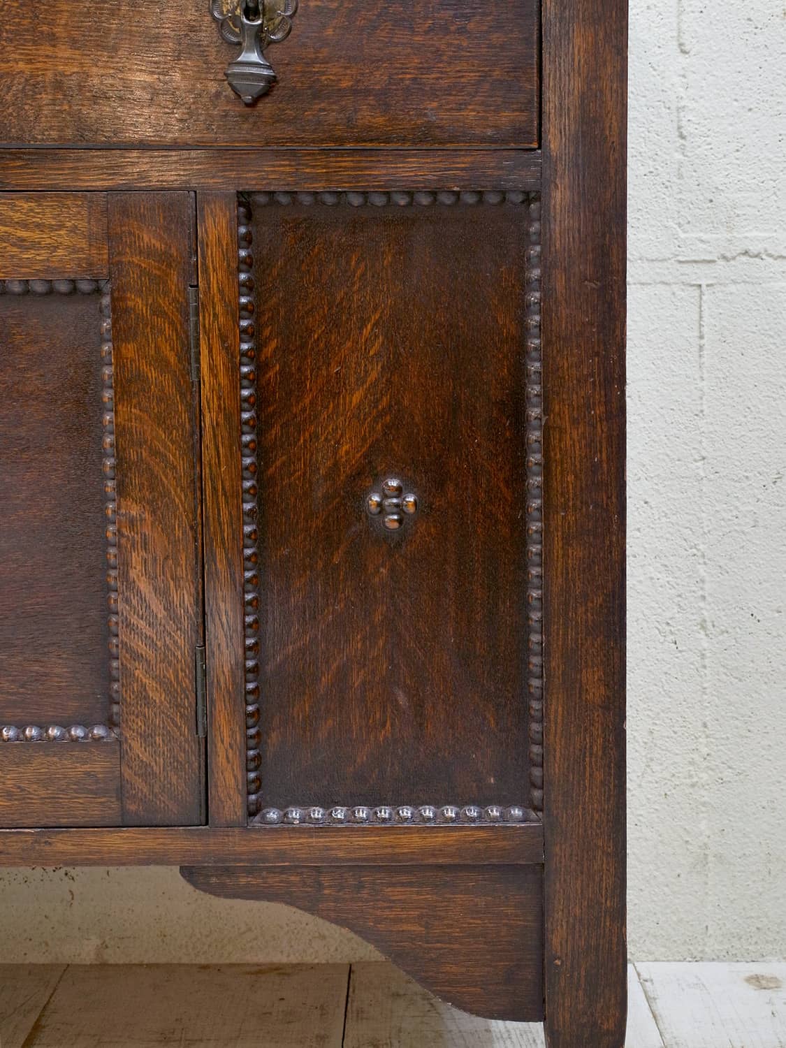 推定1930年代、イギリス製アンティークオークキャビネットです。コンパクトなサイズ感で収納とディスプレイ両方を兼ね備えた家具でリビングなどでサイドボードのようにご使用いただけます。天板までの高さは79cm。引き出し内寸 W743 D335 H130mm。扉内寸 W830 D340 H353mm。その他、オークキャビネットはこちらから。