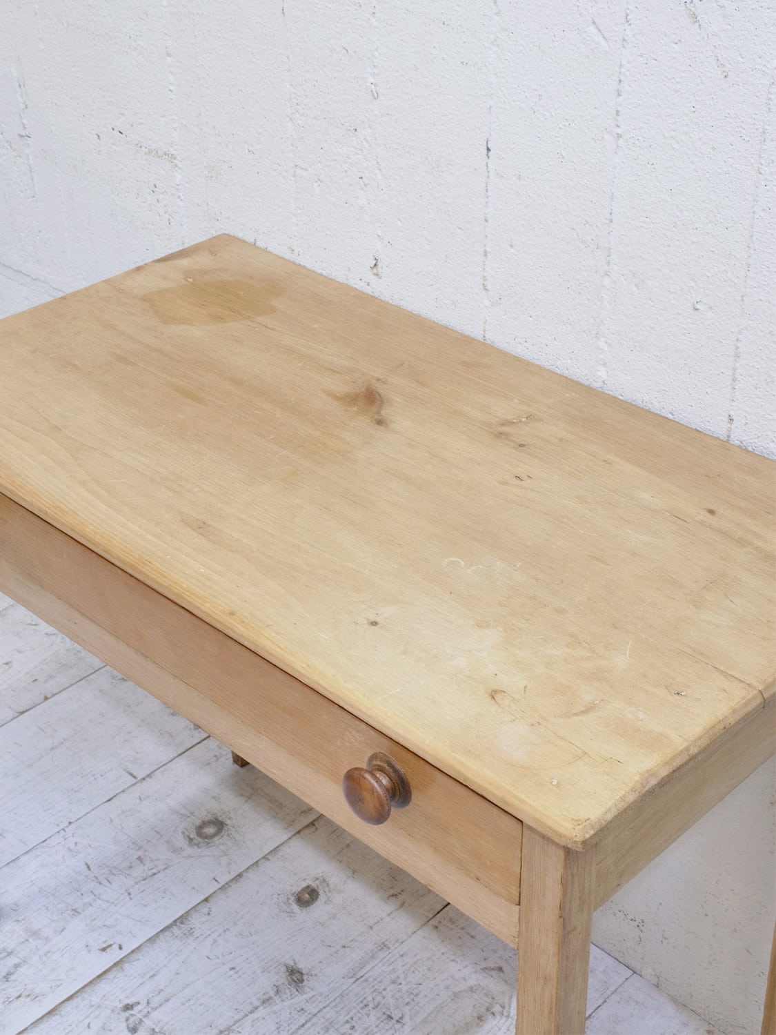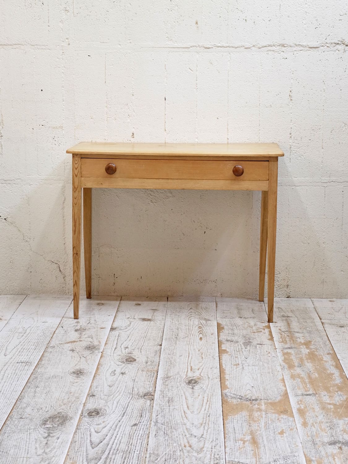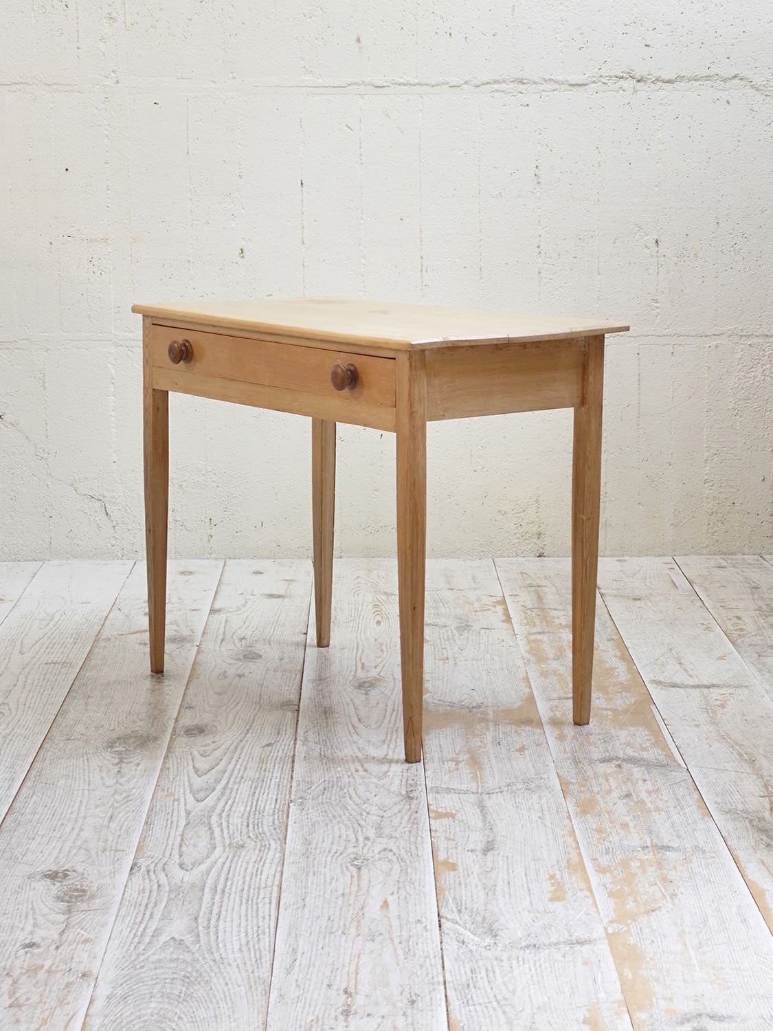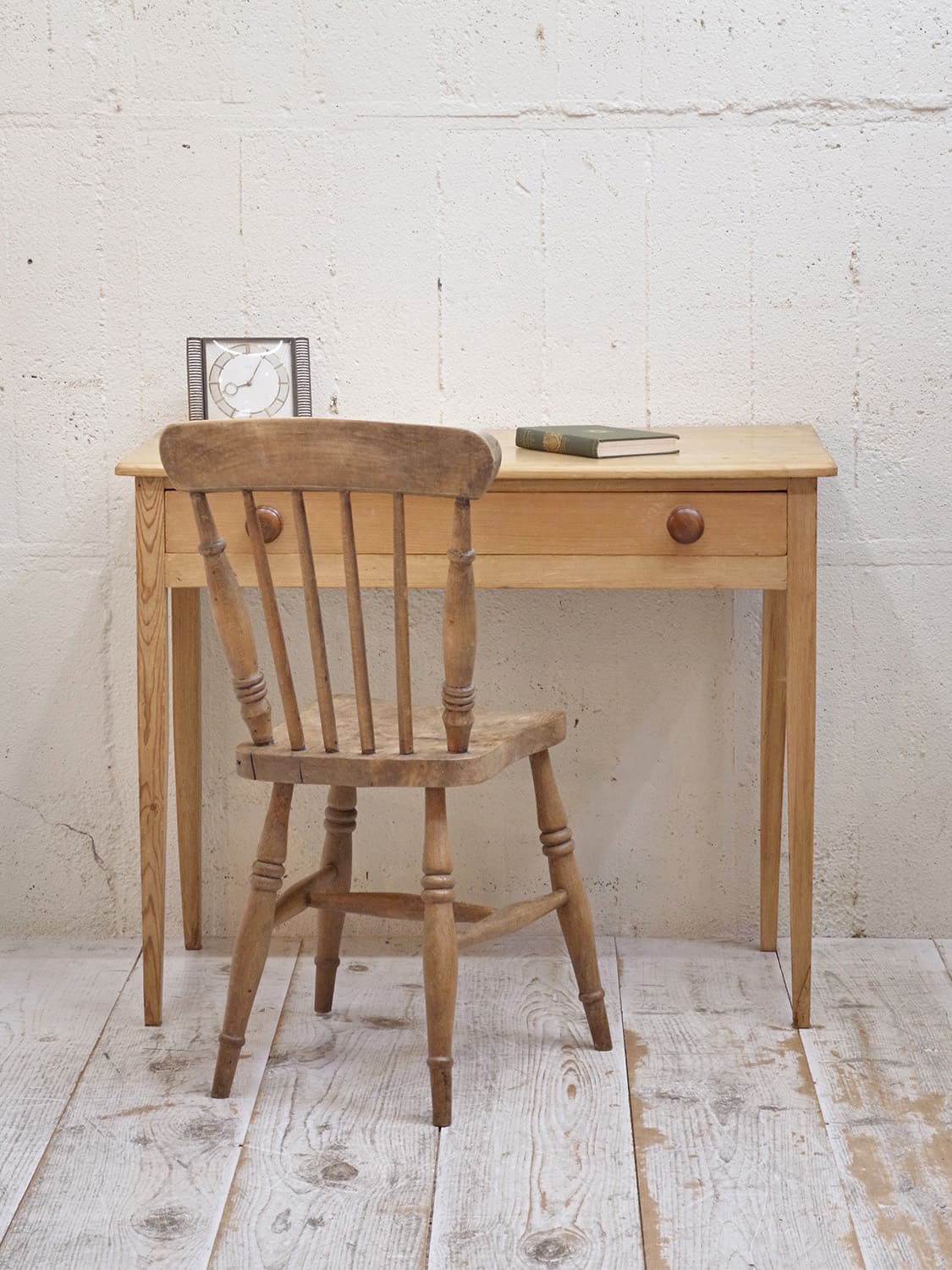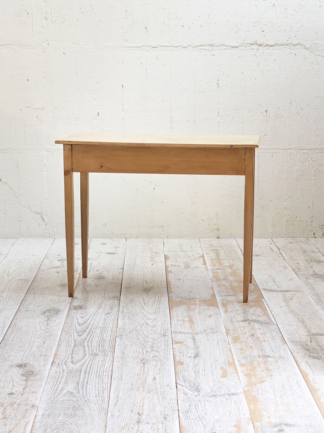推定1930年代、イギリス製のアンティークパインデスクです。とてもシンプルなデザインで他の家具にもとても馴染みやすいです。脚はフランスでよくみられるテーパード(下にいくほどに細くなる)タイプです。引き出し内寸 W755 D327 H62mm。パイン材のデスクは久しぶりの入荷です。