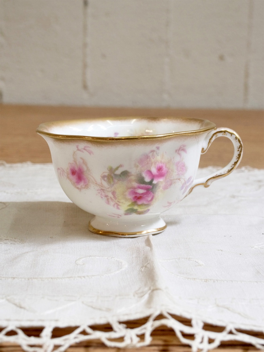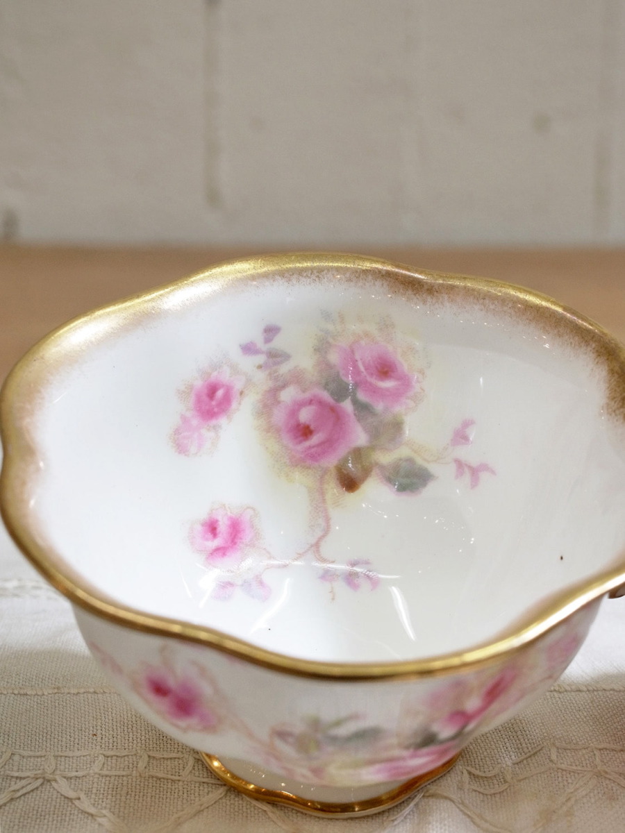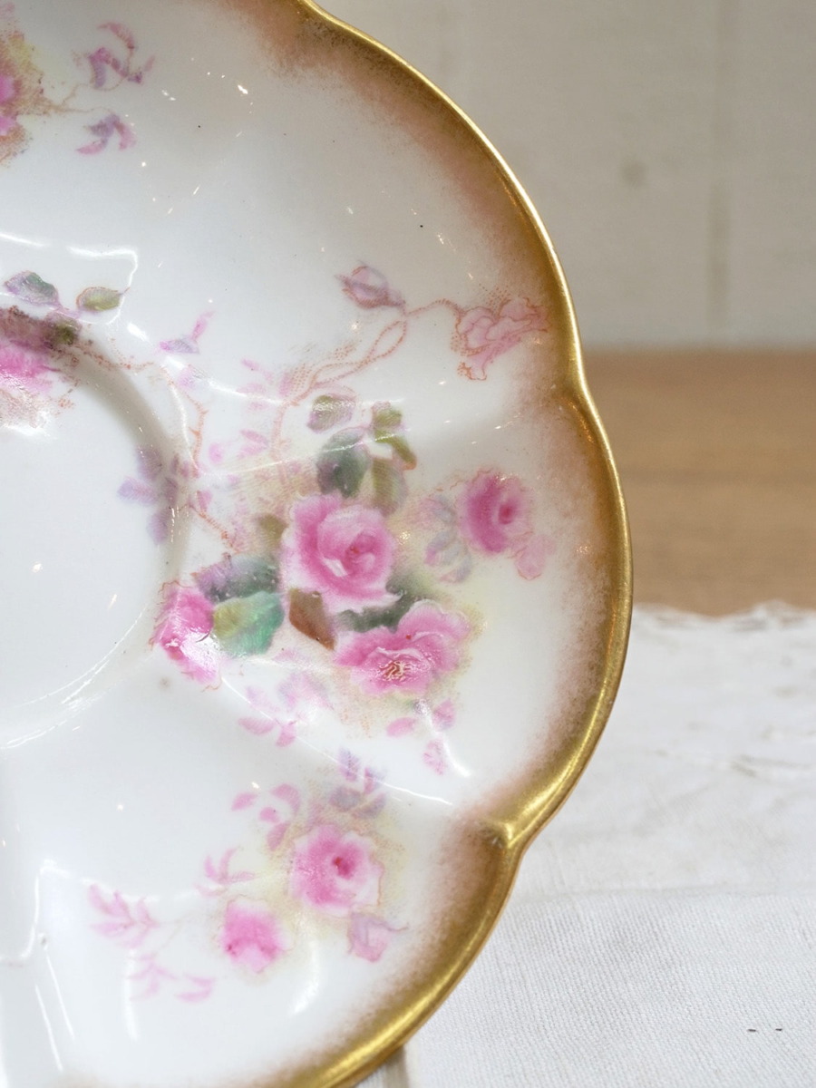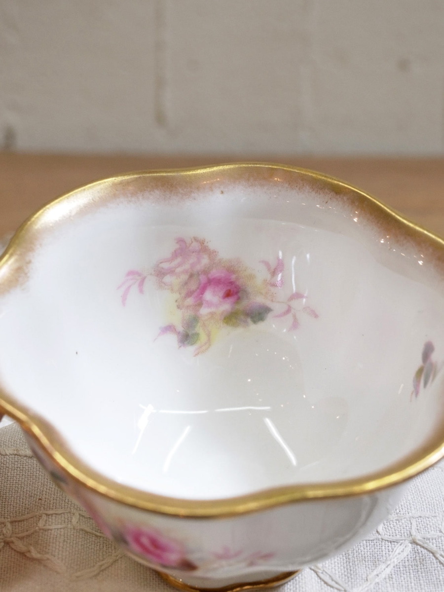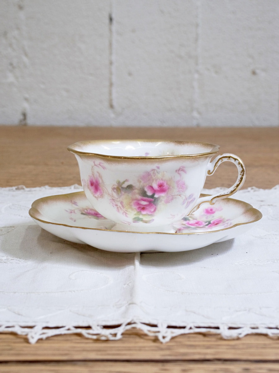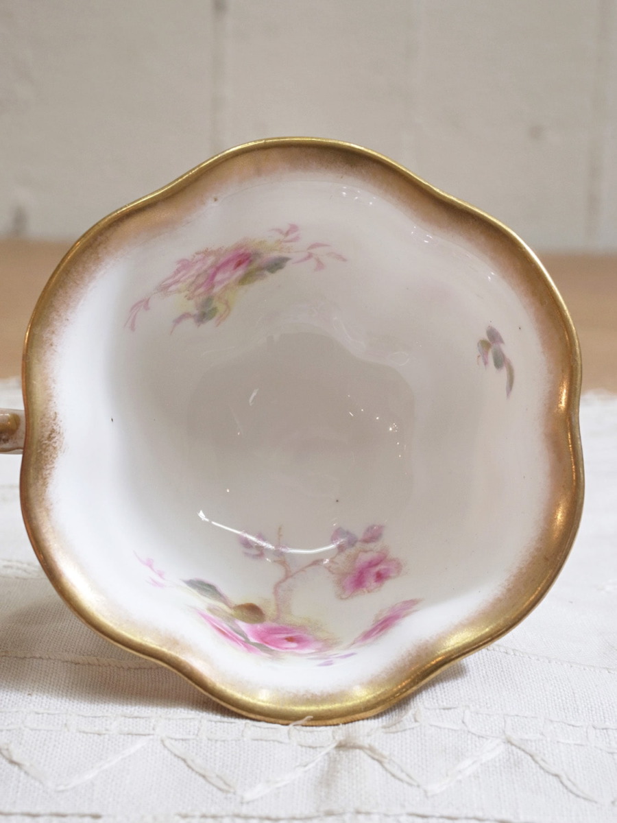 推定1930年代、イギリス製ジョージジョーンズ社のアンティークカップアンドソーサーです。ジョージジョーンズ社は1861年創業の陶器メーカーでイギリスのアフタヌーンティと言えばこれというようなカップアンドソーサーを数多く作っています。可憐なバラがカップの内側にもあります。ふっくらしたカップのフォルムは、フェミニンでとても可愛らしいです。カップサイズ W110 D96 H55mm。ソーサーサイズ W140 D142 H20mm。