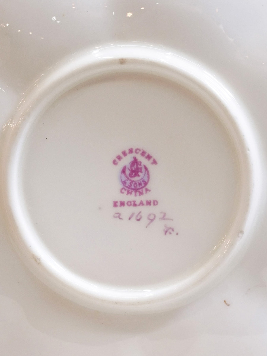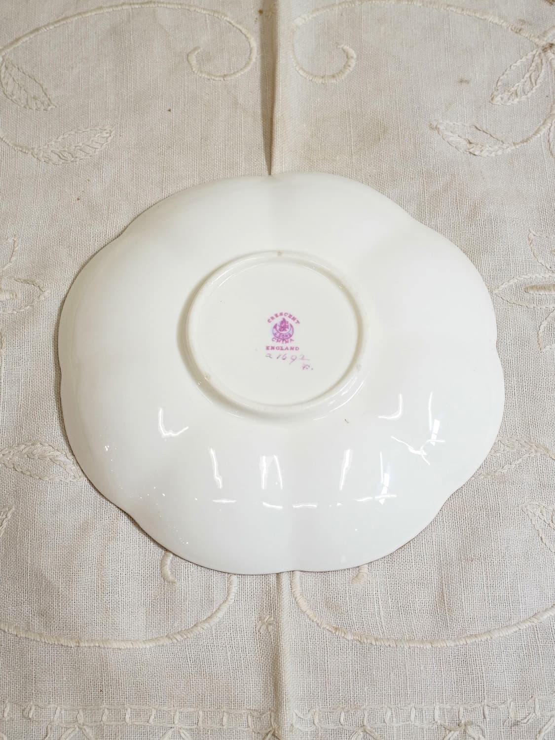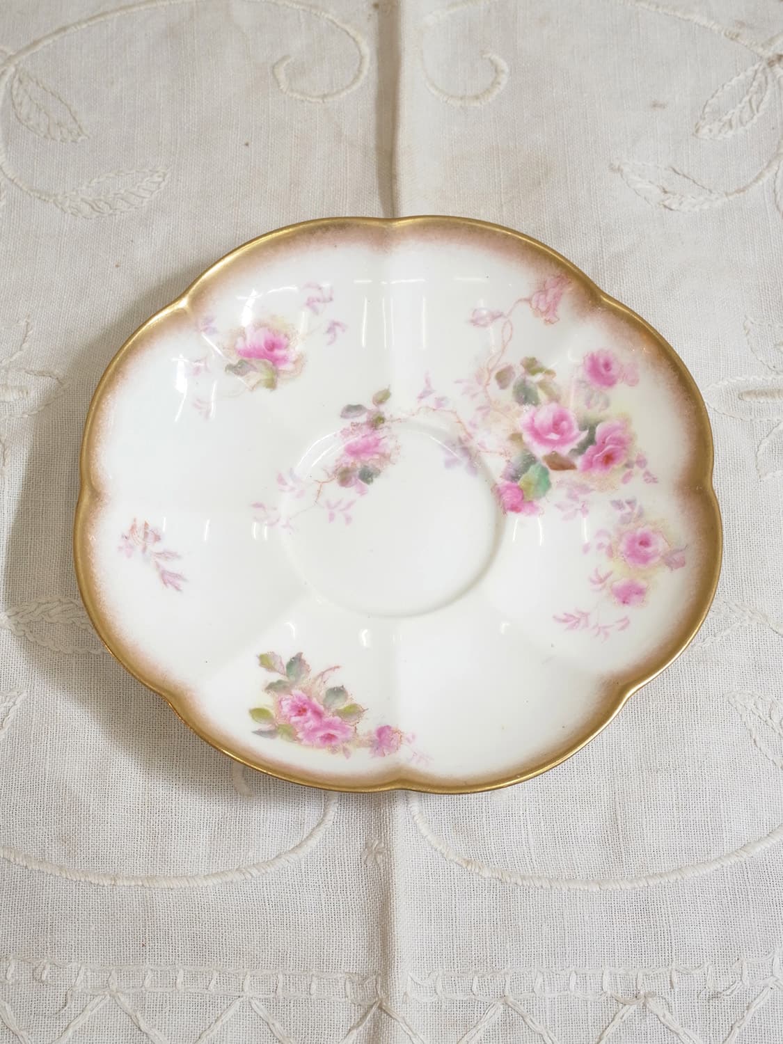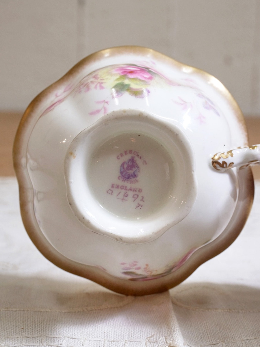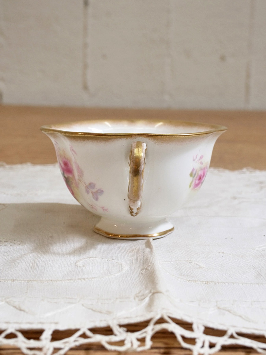 推定1930年代、イギリス製ジョージジョーンズ社のアンティークカップアンドソーサーです。ジョージジョーンズ社は1861年創業の陶器メーカーでイギリスのアフタヌーンティと言えばこれというようなカップアンドソーサーを数多く作っています。可憐なバラがカップの内側にもあります。ふっくらしたカップのフォルムは、フェミニンでとても可愛らしいです。カップサイズ W110 D96 H55mm。ソーサーサイズ W140 D142 H20mm。