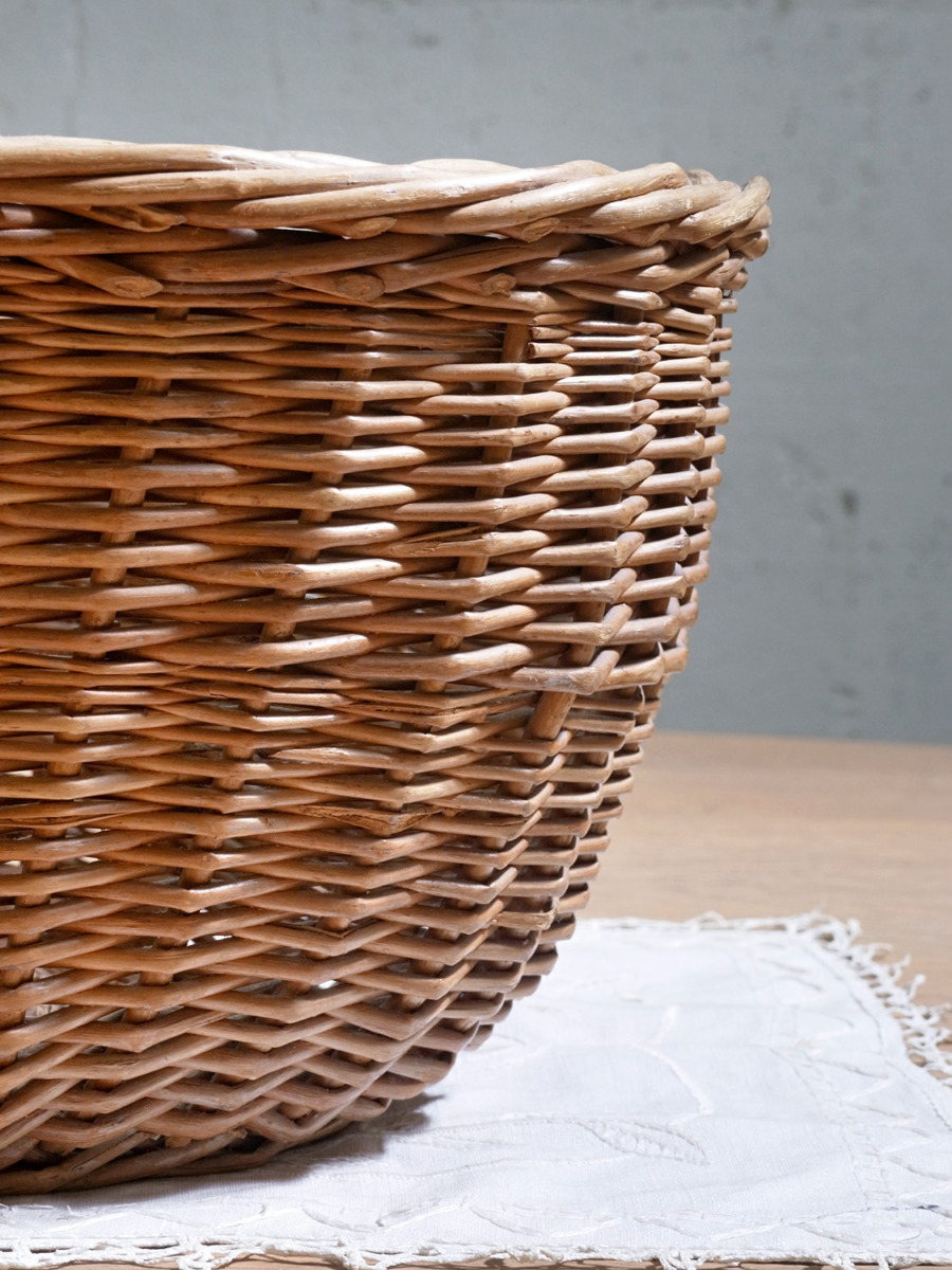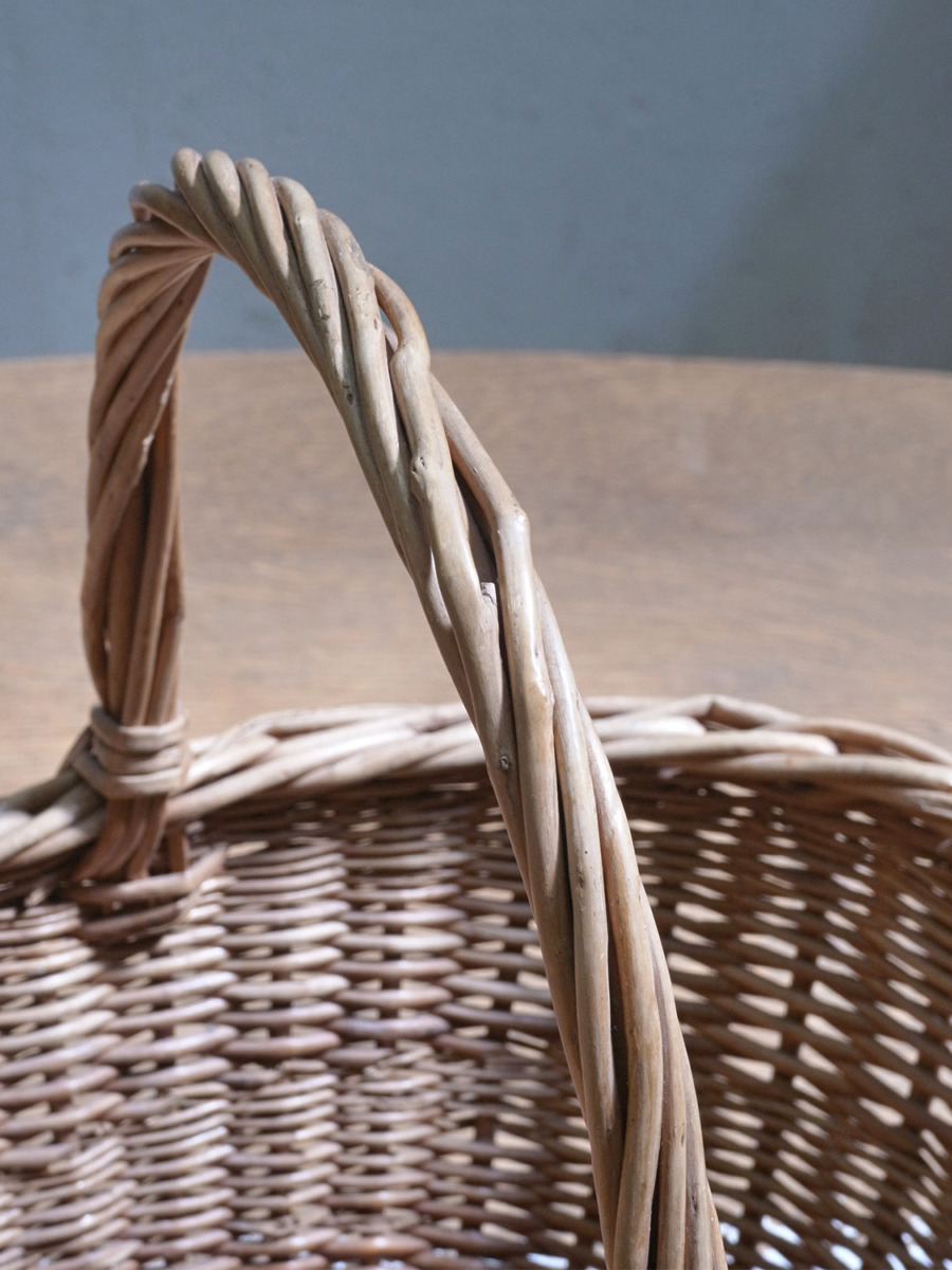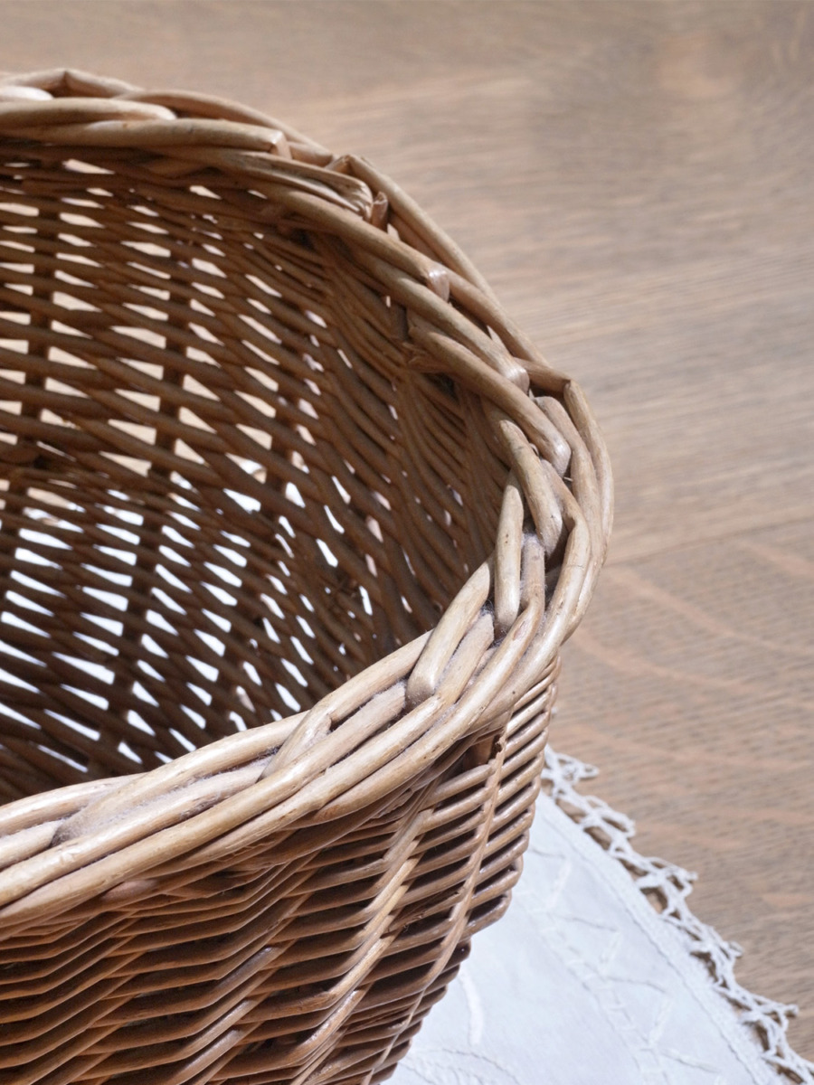 イギリス製のアンティークバスケットは、少しだけ大きいサイズ感で、小物の収納に最適です。雑誌や新聞などの収納はもちろん、スリッパやスカーフなどのファッション小物の収納にもおすすめです。取っ手があり、持ち運びができます。編み目は比較的スタンダードなデザインです。その他バスケット一覧はこちらから。