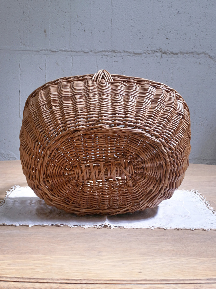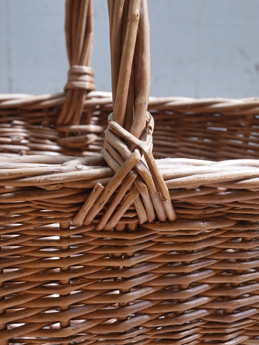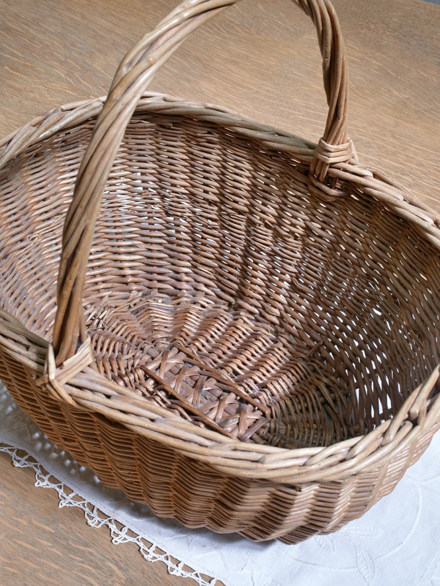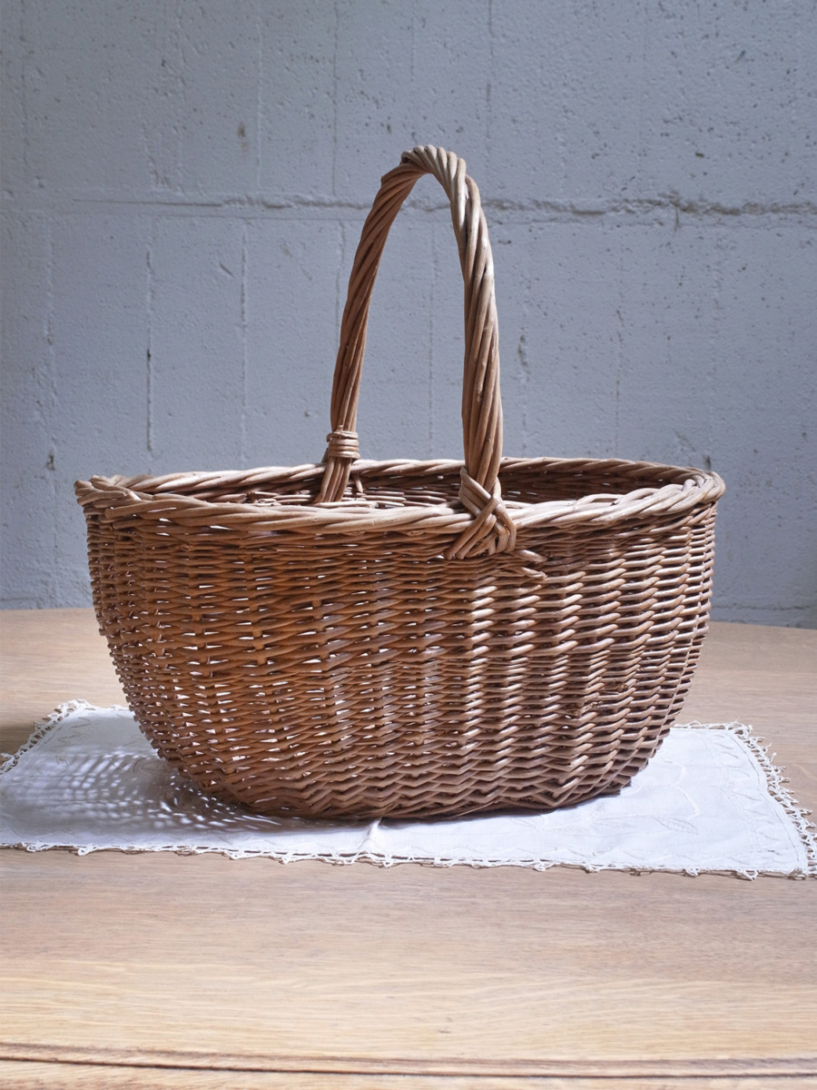 イギリス製のアンティークバスケットは、少しだけ大きいサイズ感で、小物の収納に最適です。雑誌や新聞などの収納はもちろん、スリッパやスカーフなどのファッション小物の収納にもおすすめです。取っ手があり、持ち運びができます。編み目は比較的スタンダードなデザインです。その他バスケット一覧はこちらから。